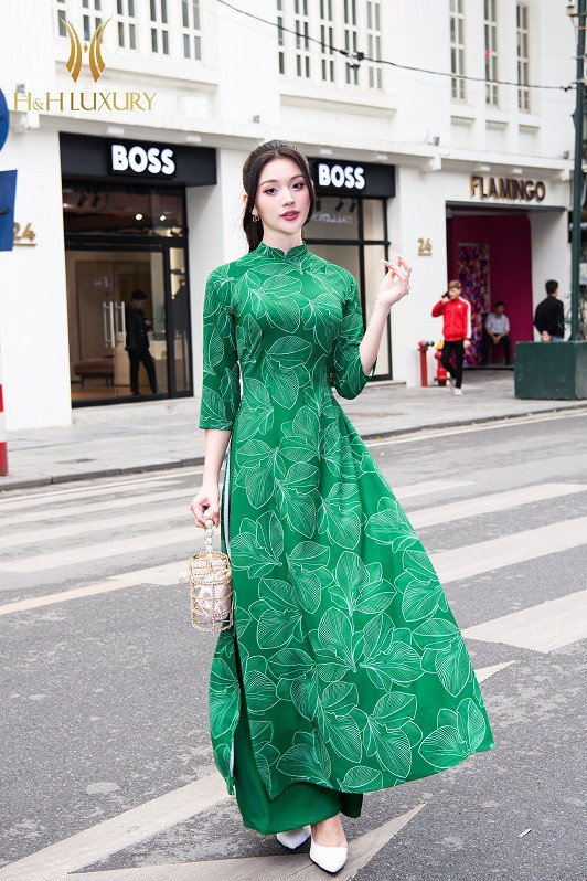 1. ÁO DÀI LỤA MỸ HỌA TIẾT LÁ XANH NGỌC:
