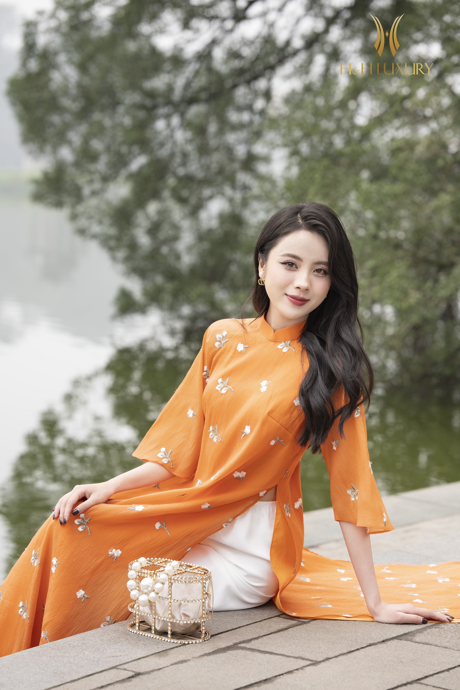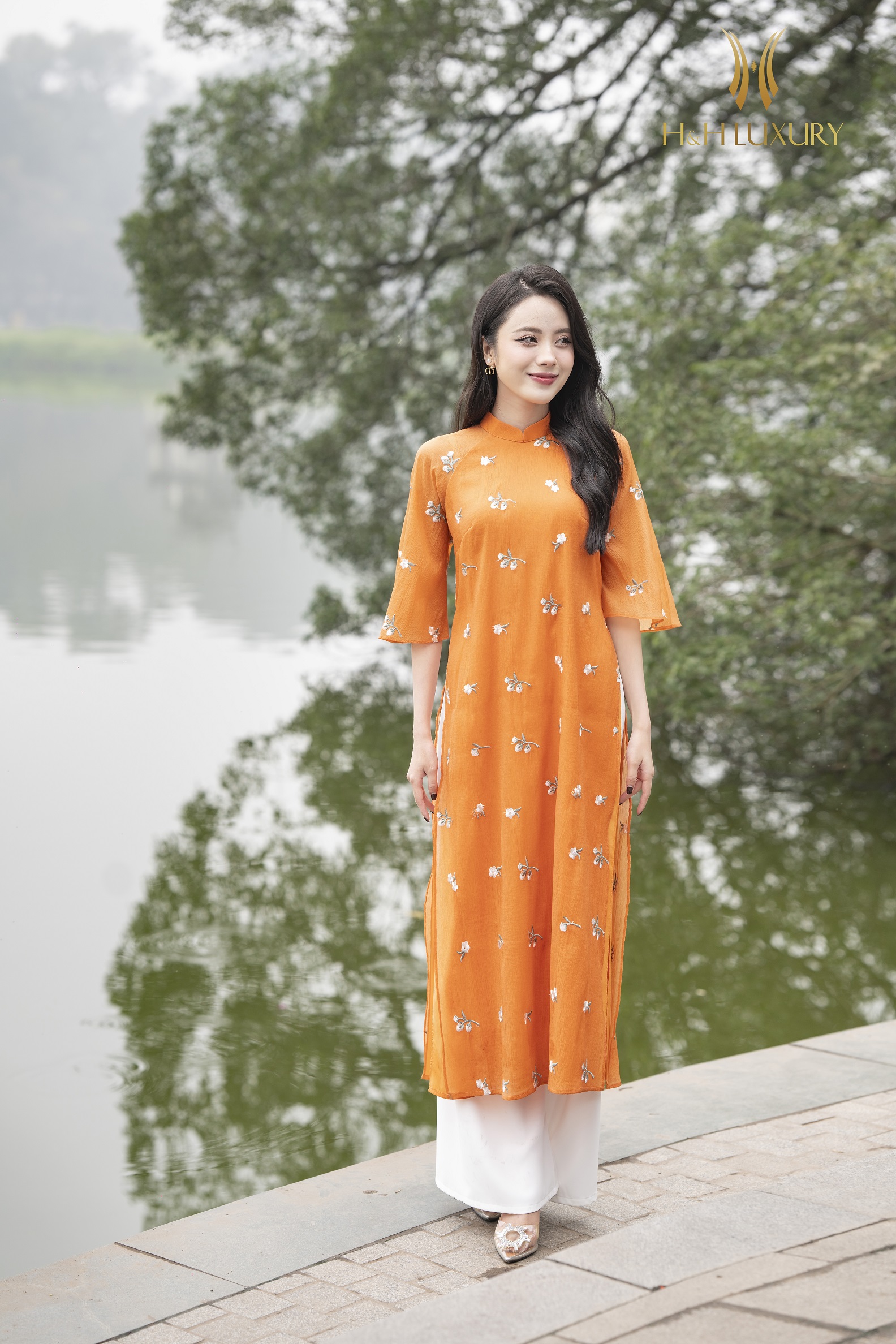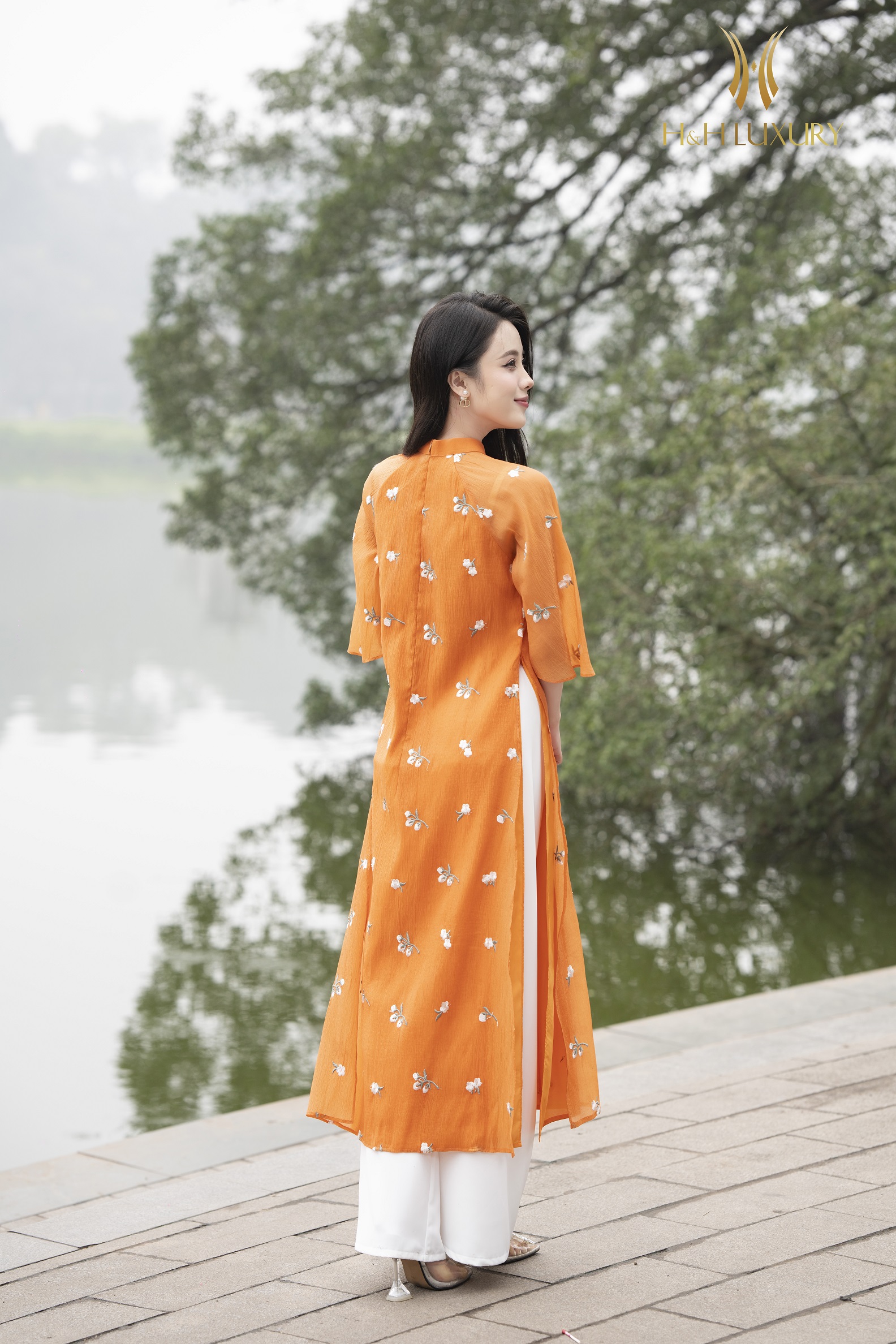 ÁO DÀI CÁCH TÂN TƠ CAM THÊU HOA