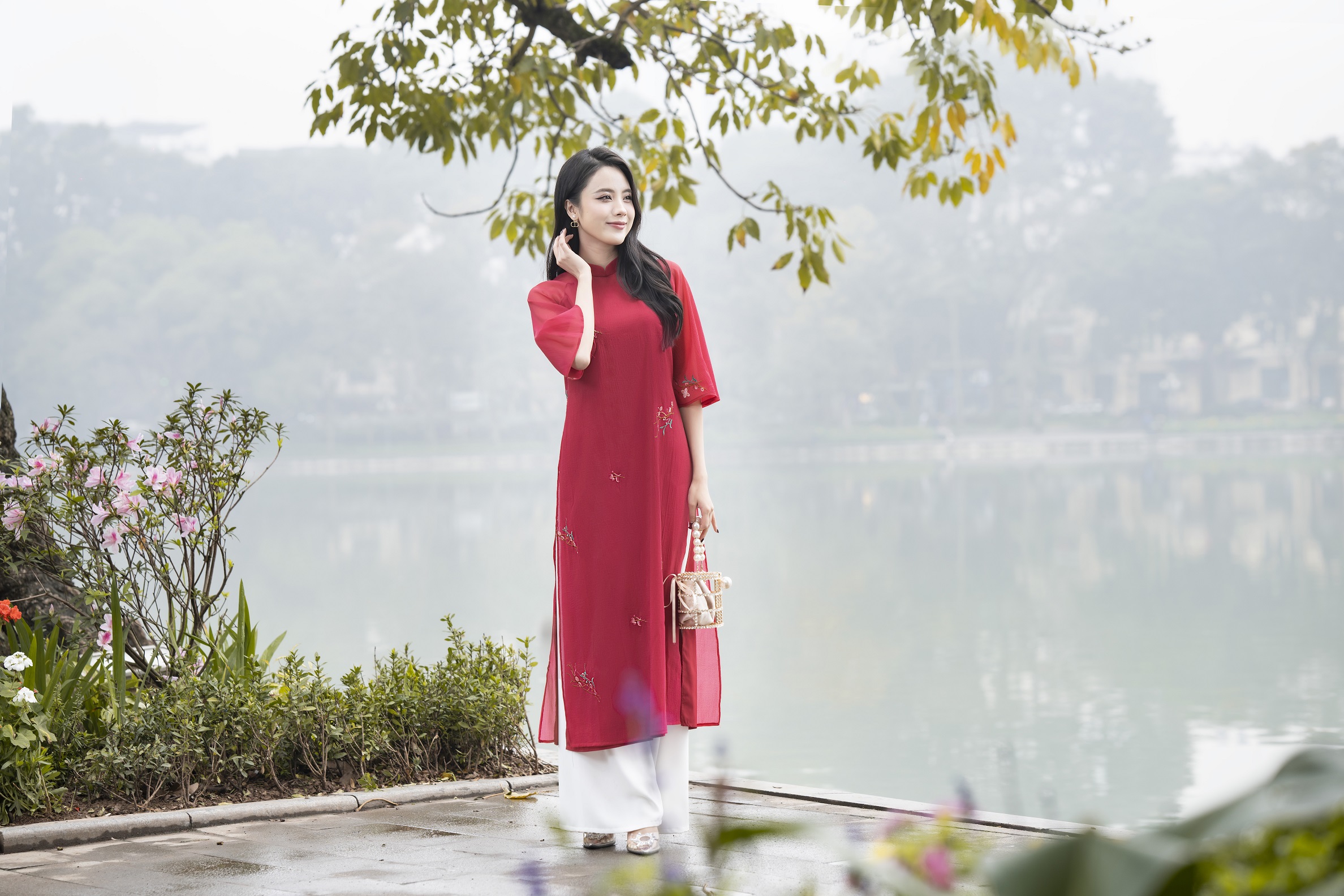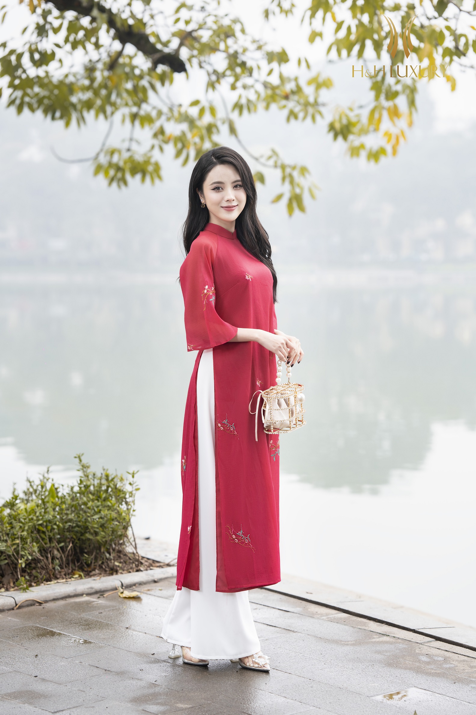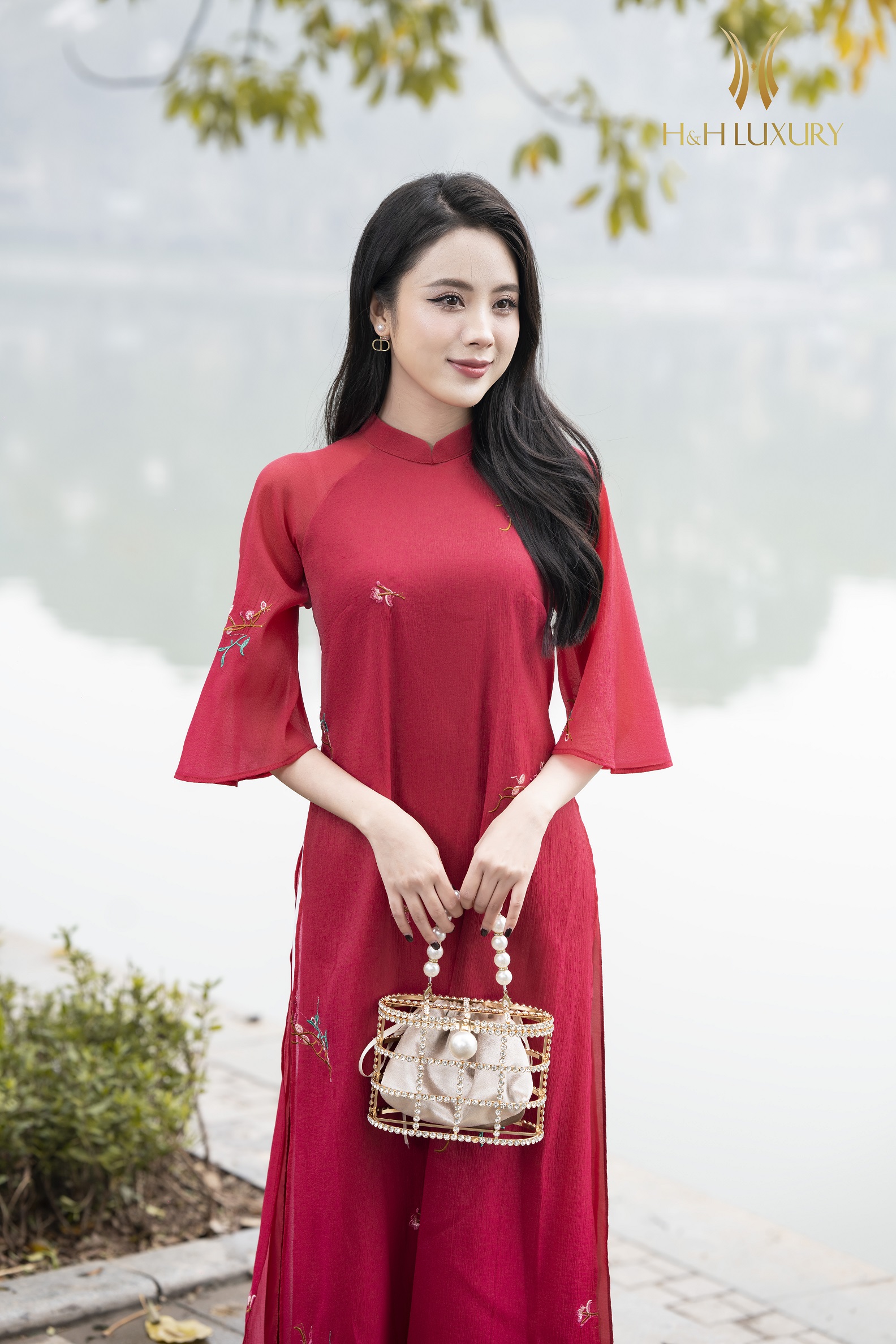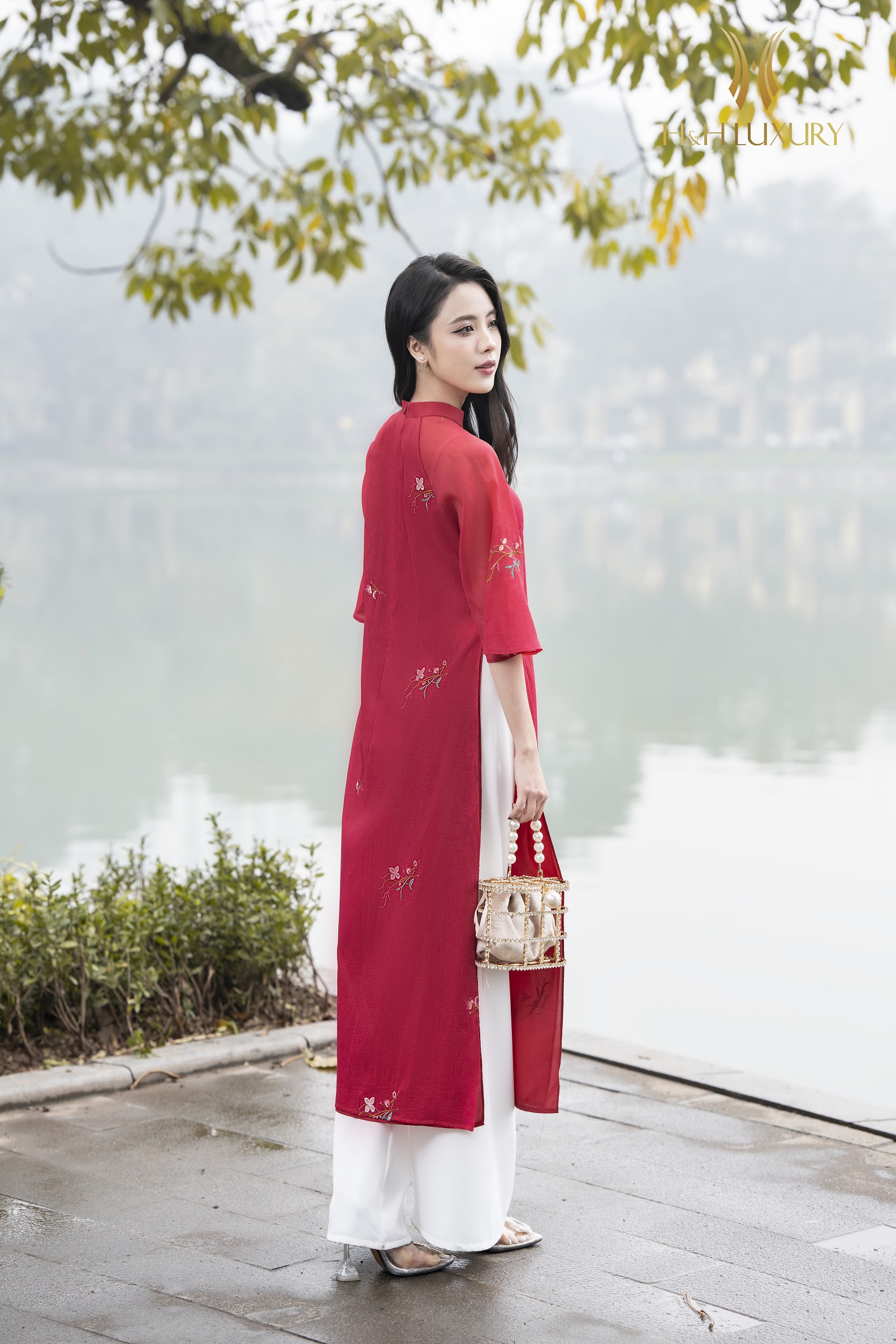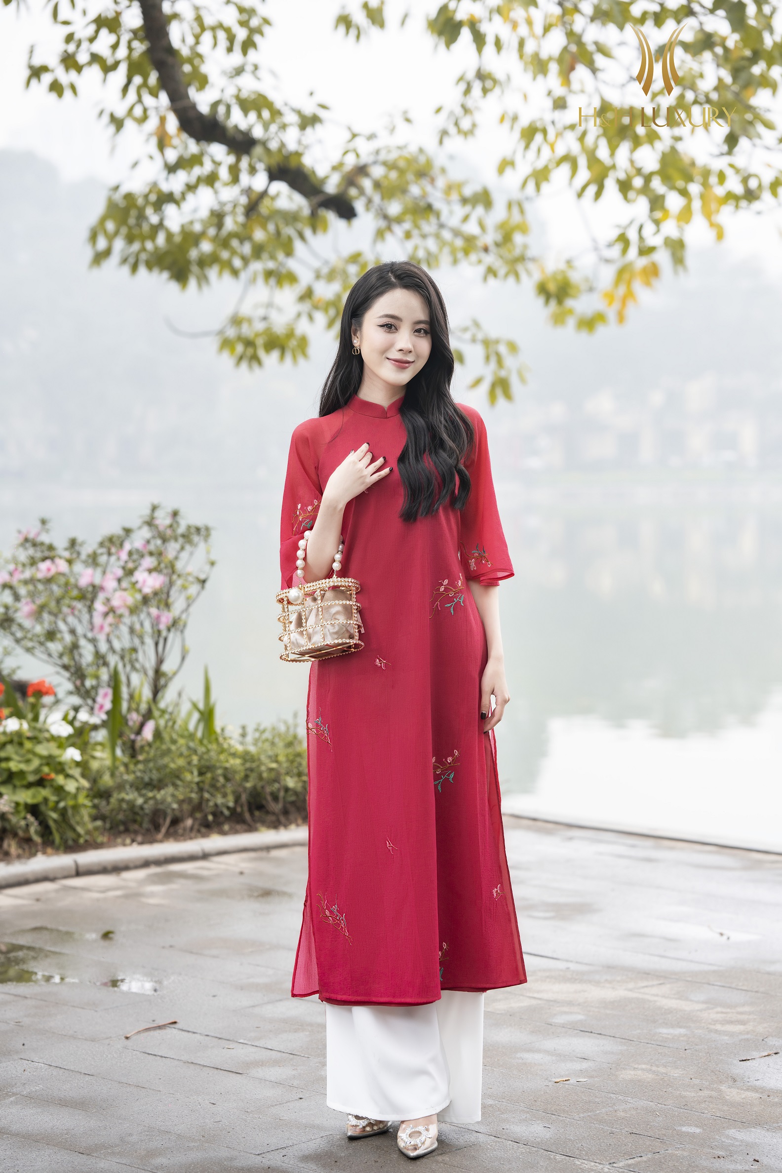 ÁO DÀI CÁCH TÂN TƠ ĐỎ THÊU HOA RƠI