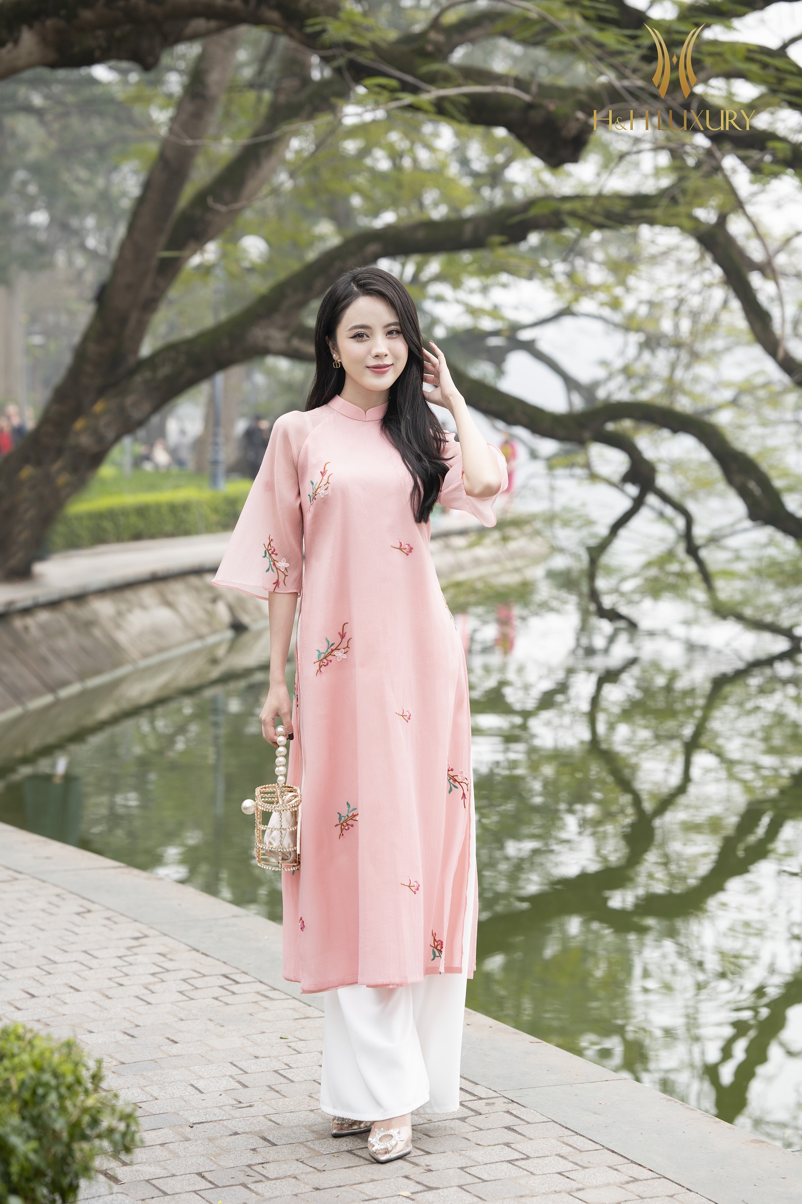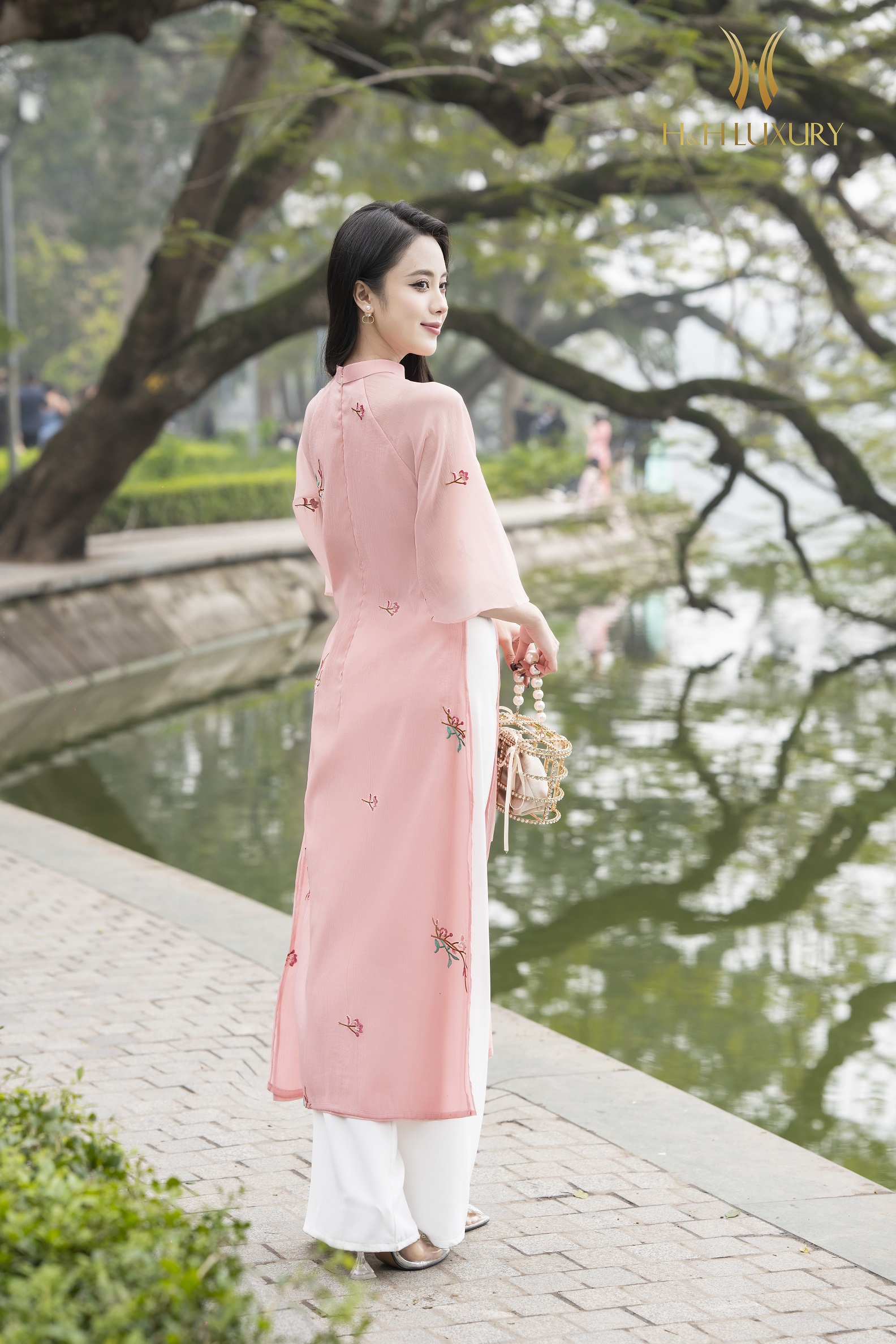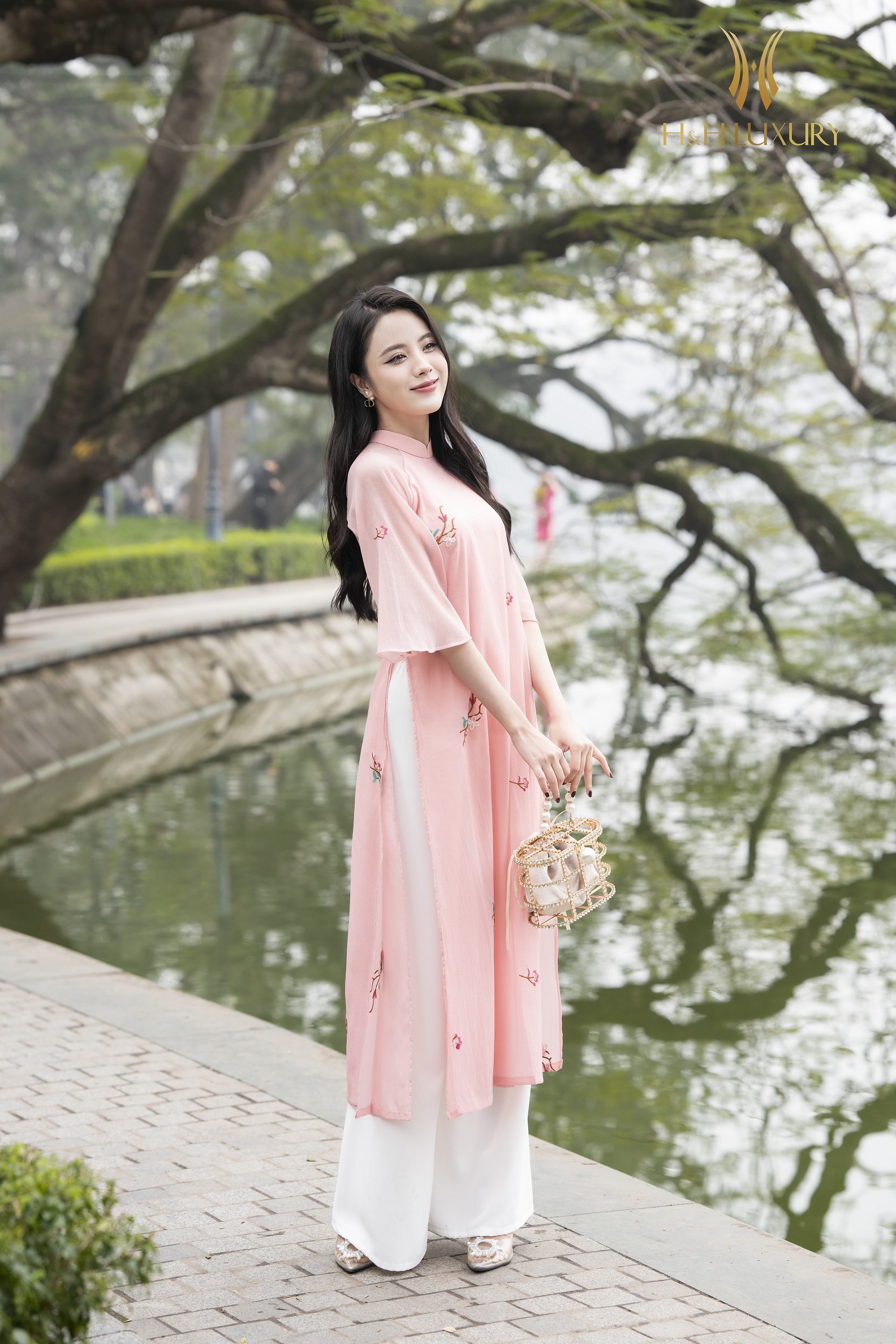 ÁO DÀI CÁCH TÂN TƠ HỒNG CAM THÊU HOA