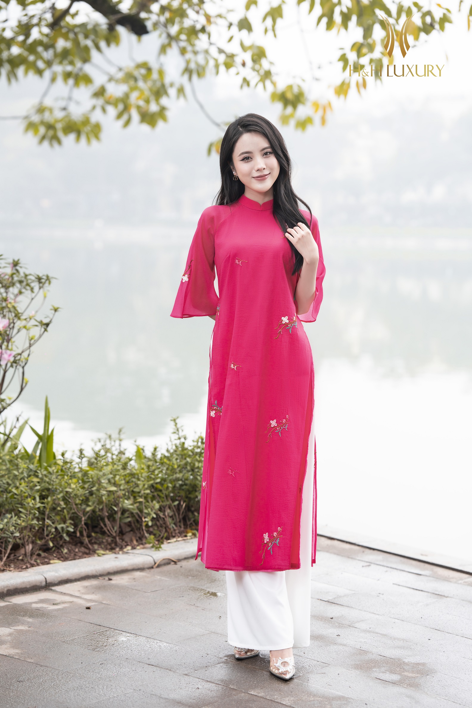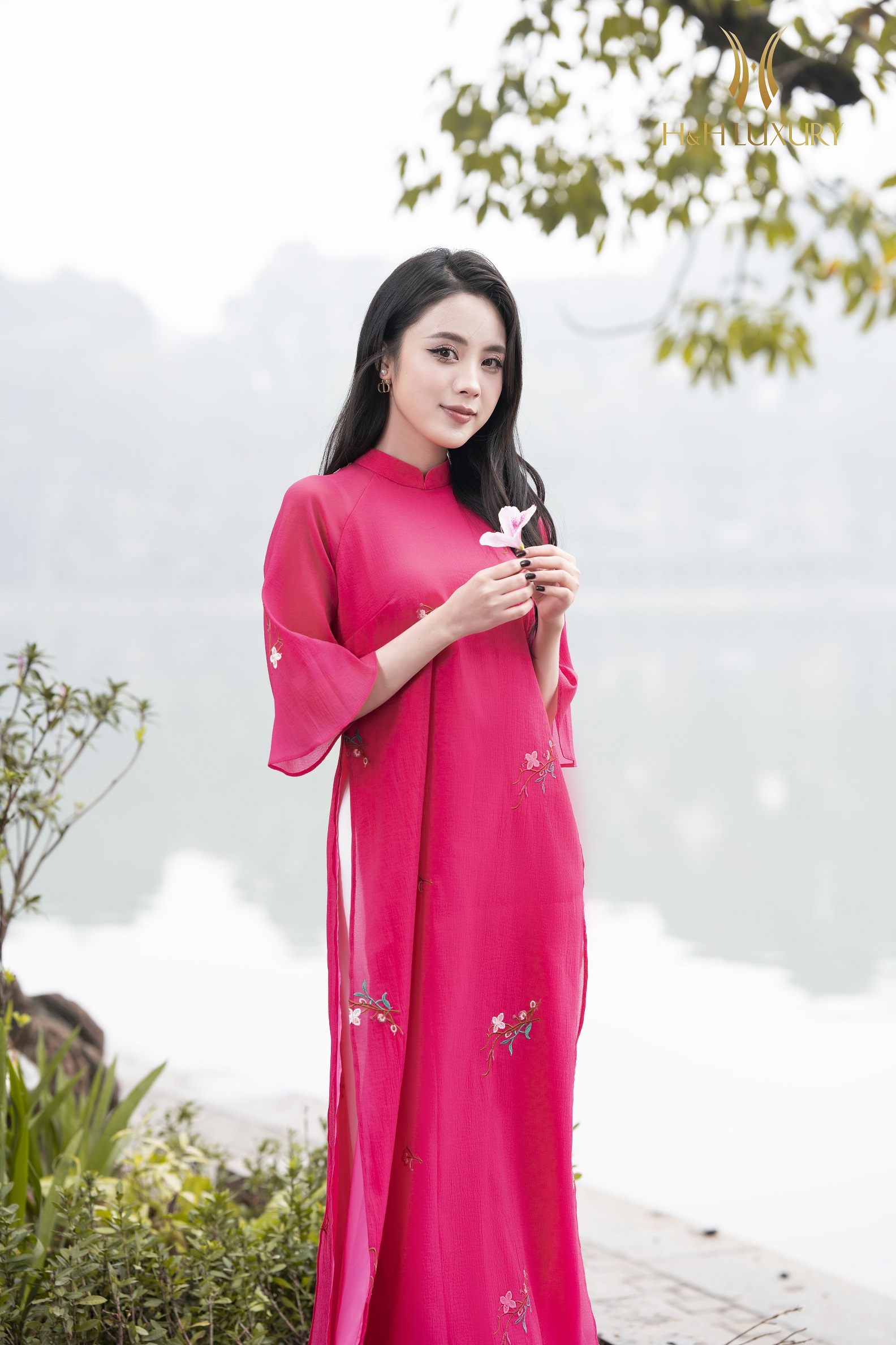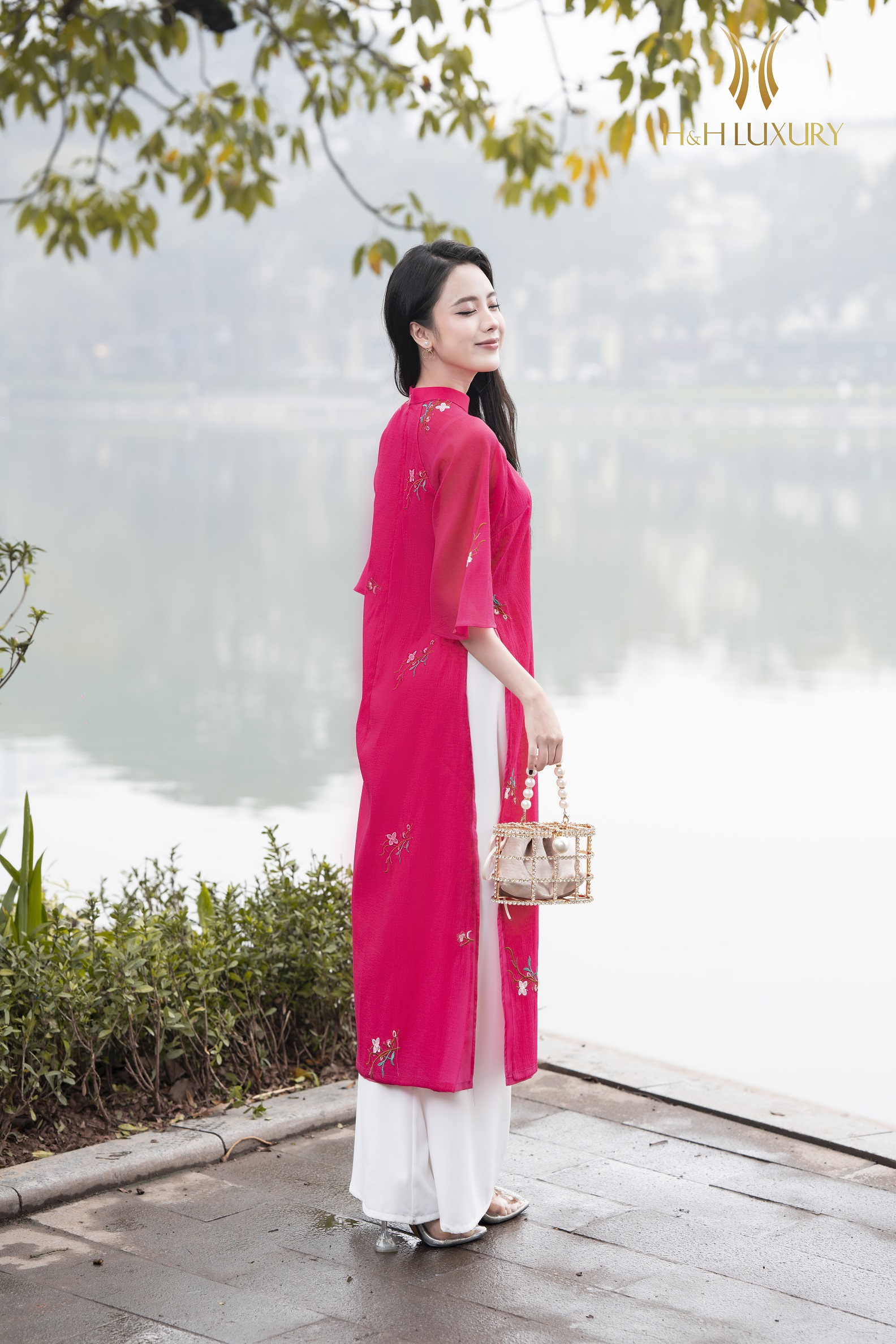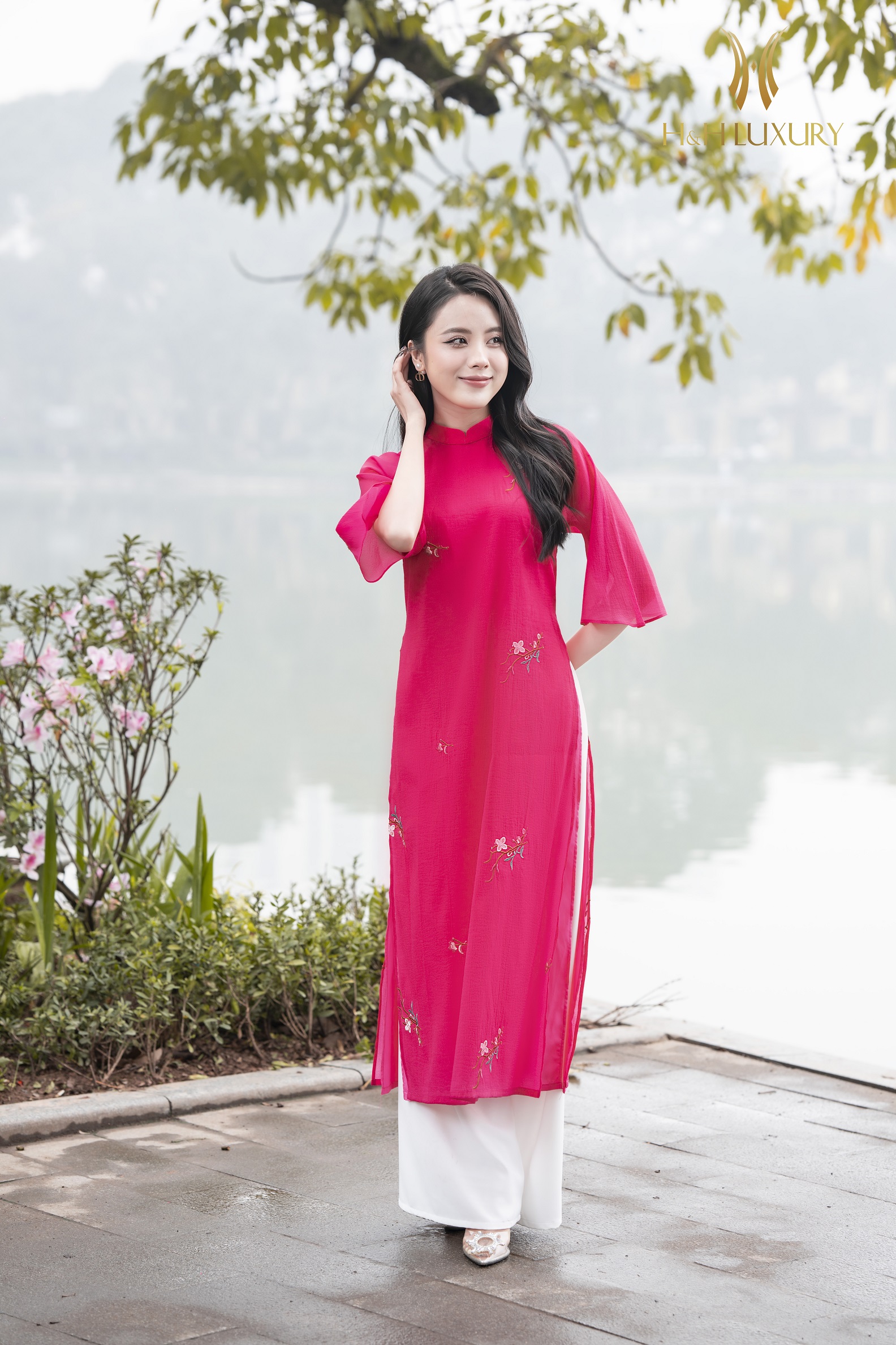 ÁO DÀI CÁCH TÂN TƠ HỒNG SEN THÊU HOA