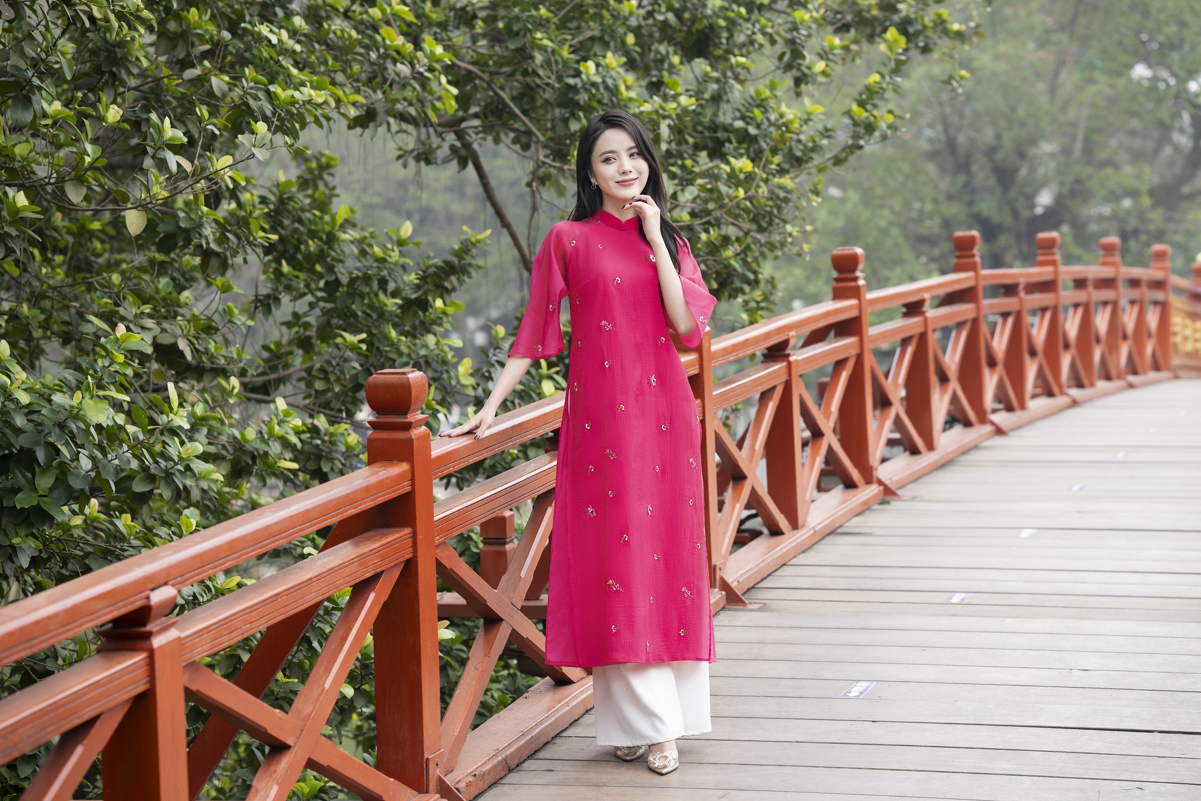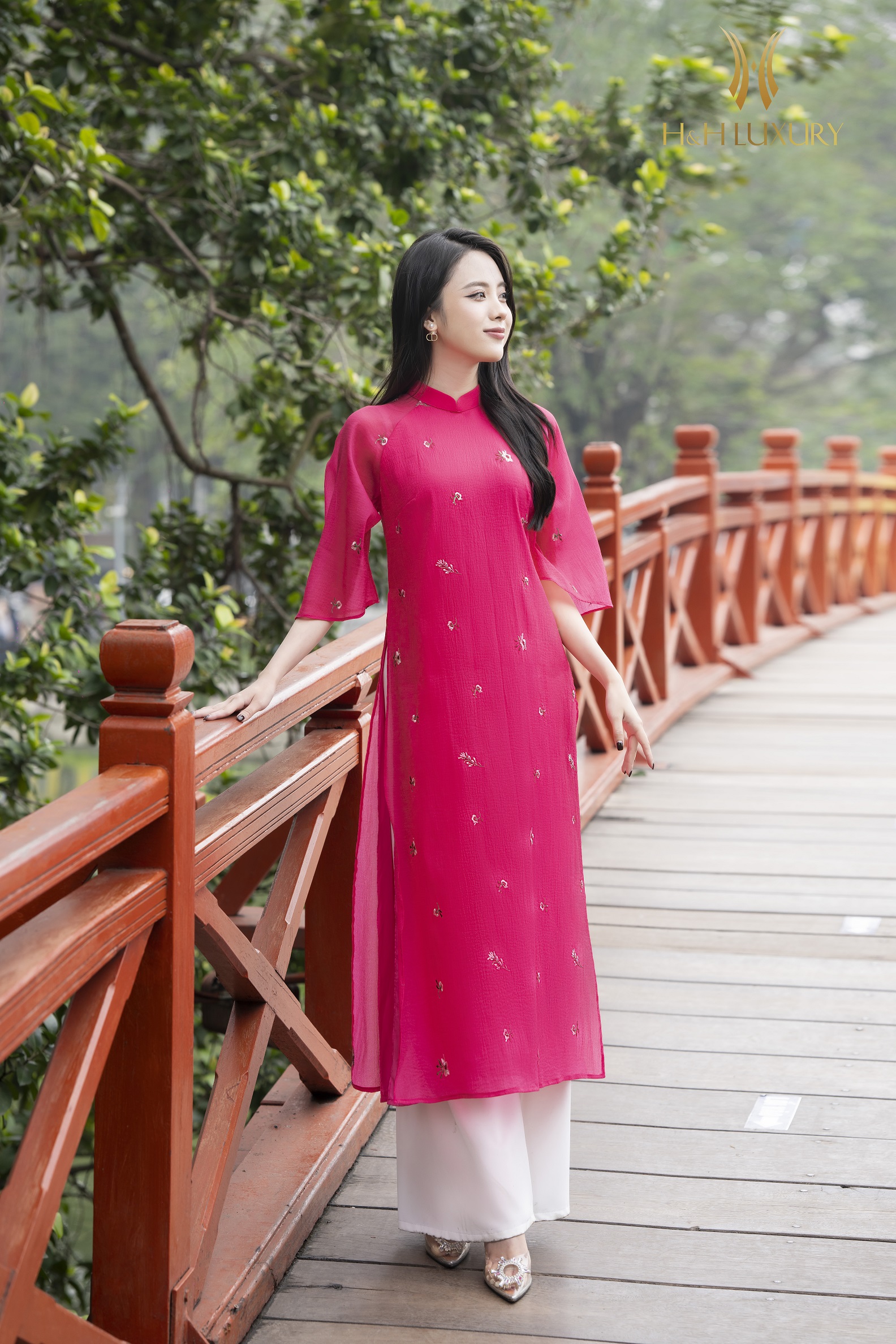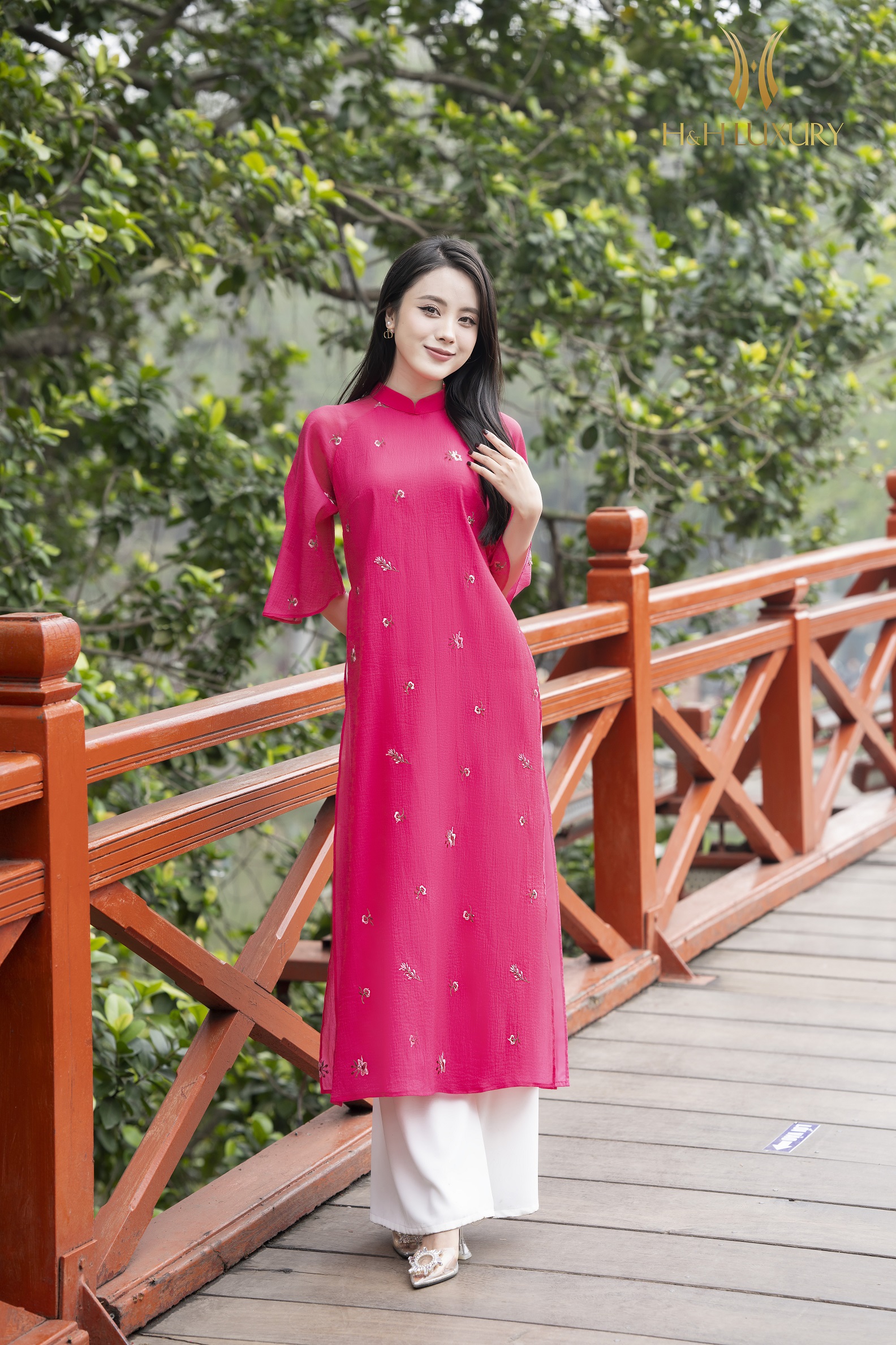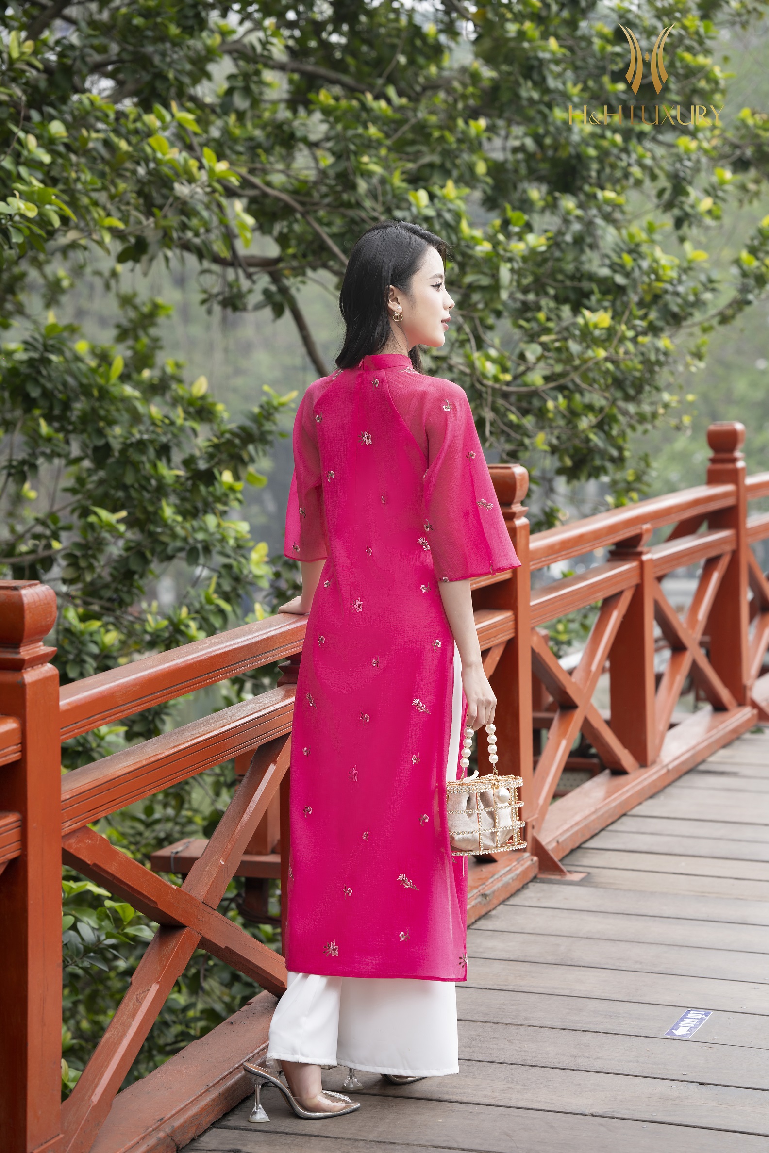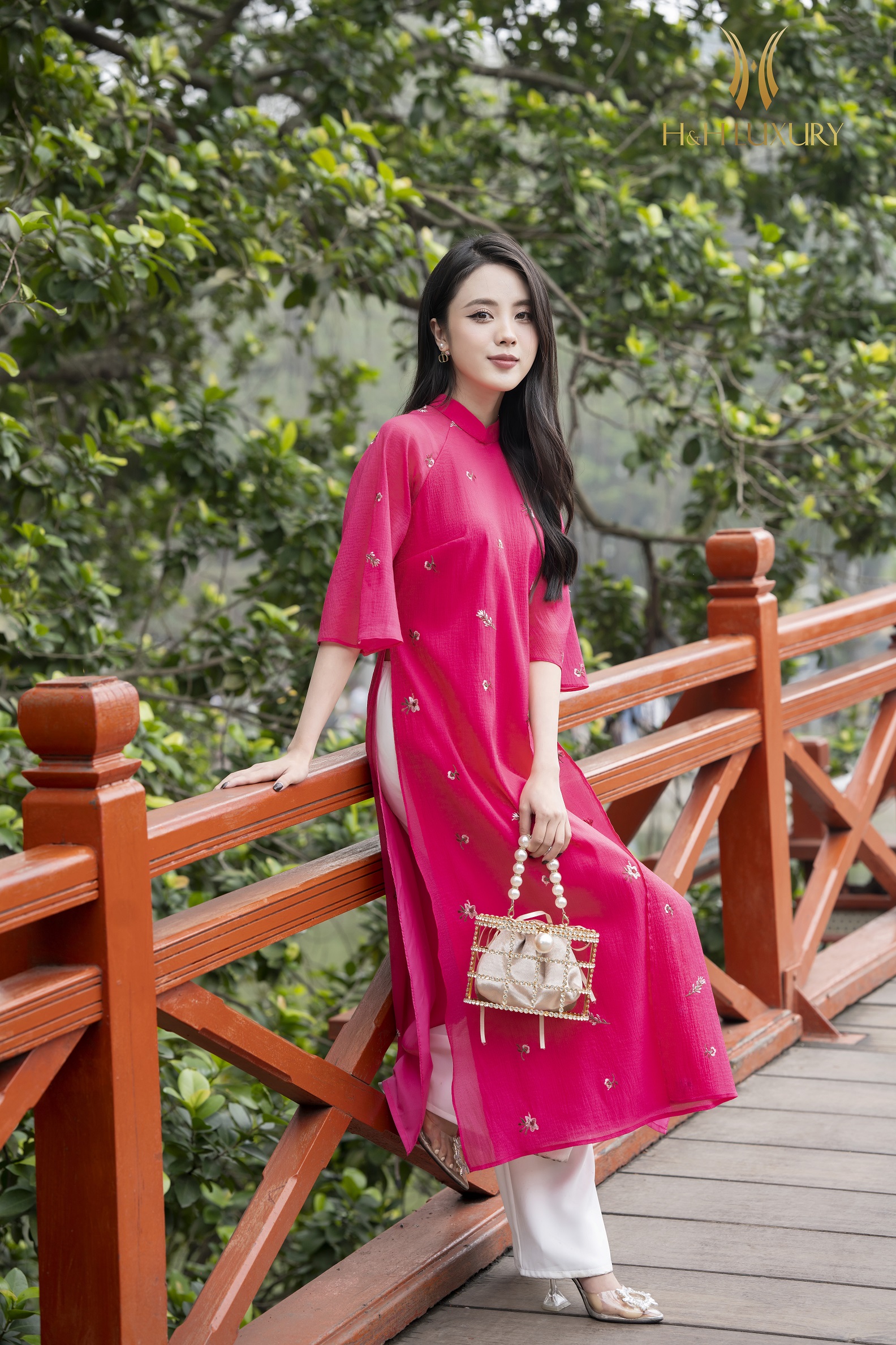 ÁO DÀI CÁCH TÂN TƠ HỒNG SEN THÊU HOA NHÍ