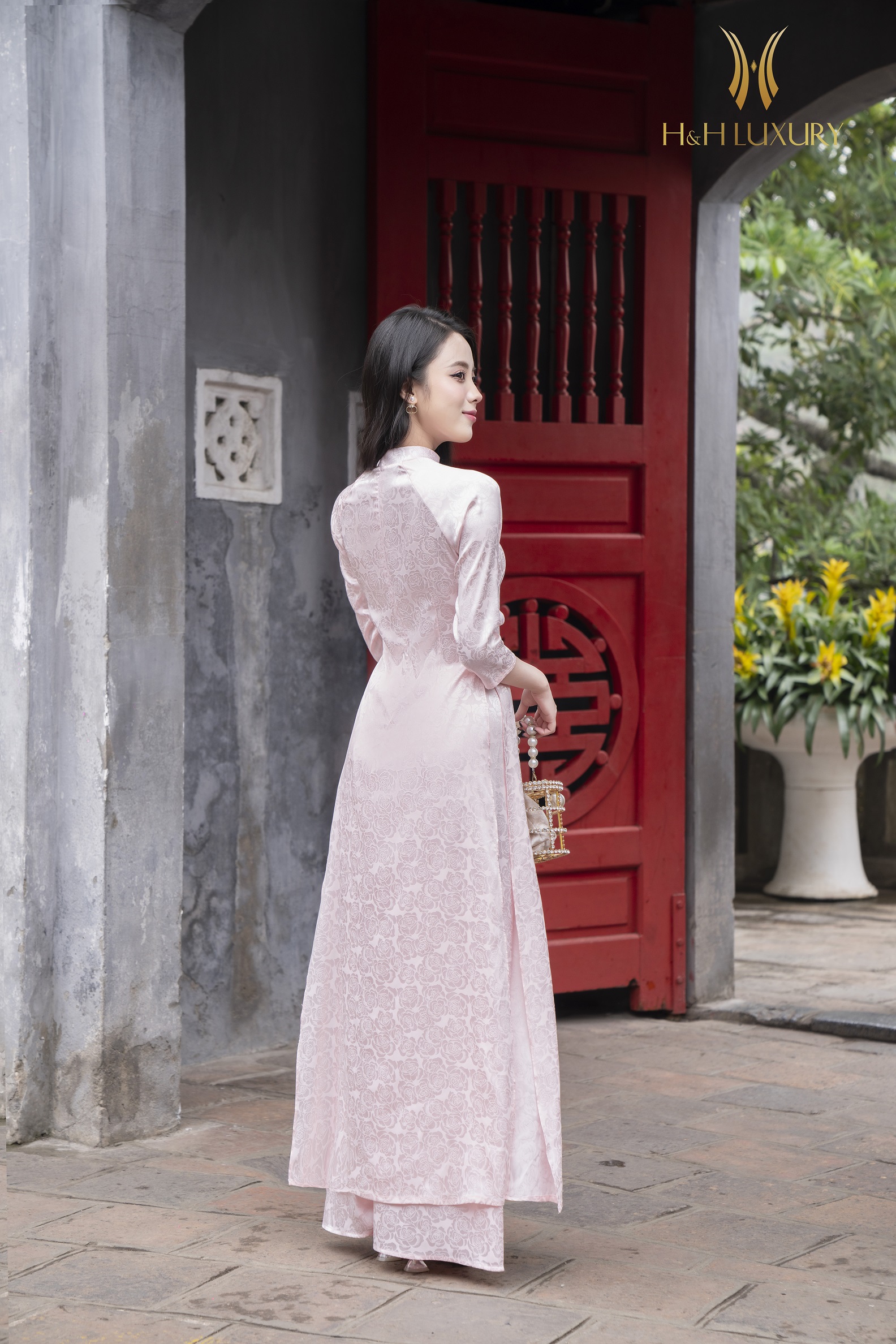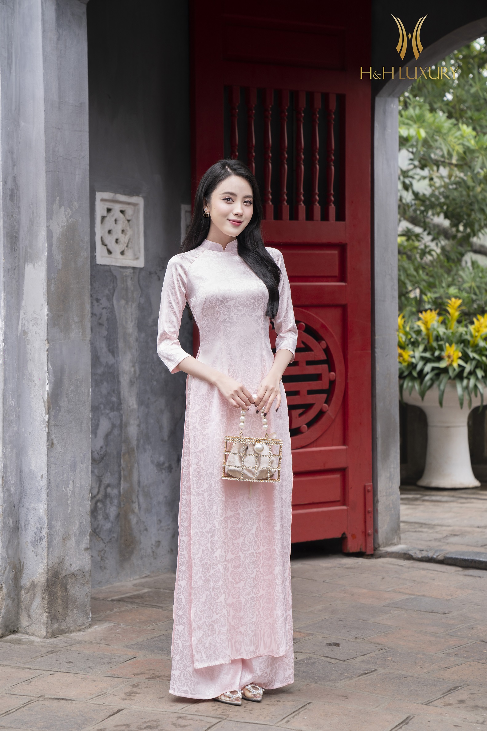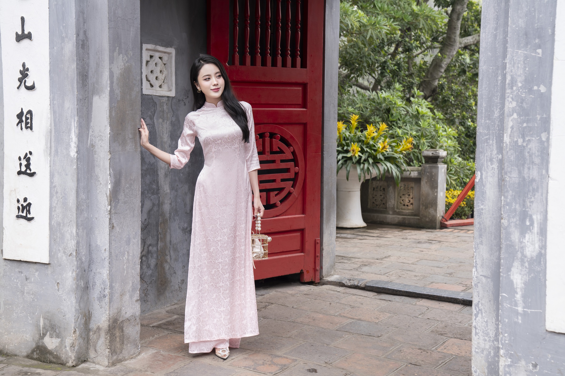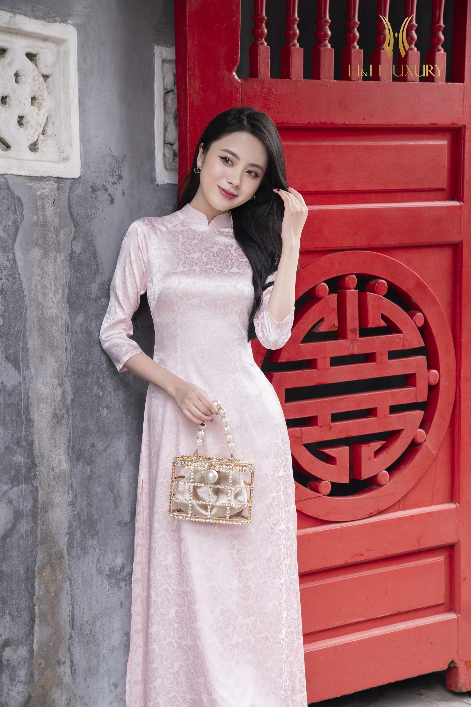 Áo dài lụa gấm hồng phấn vân hoa hồng