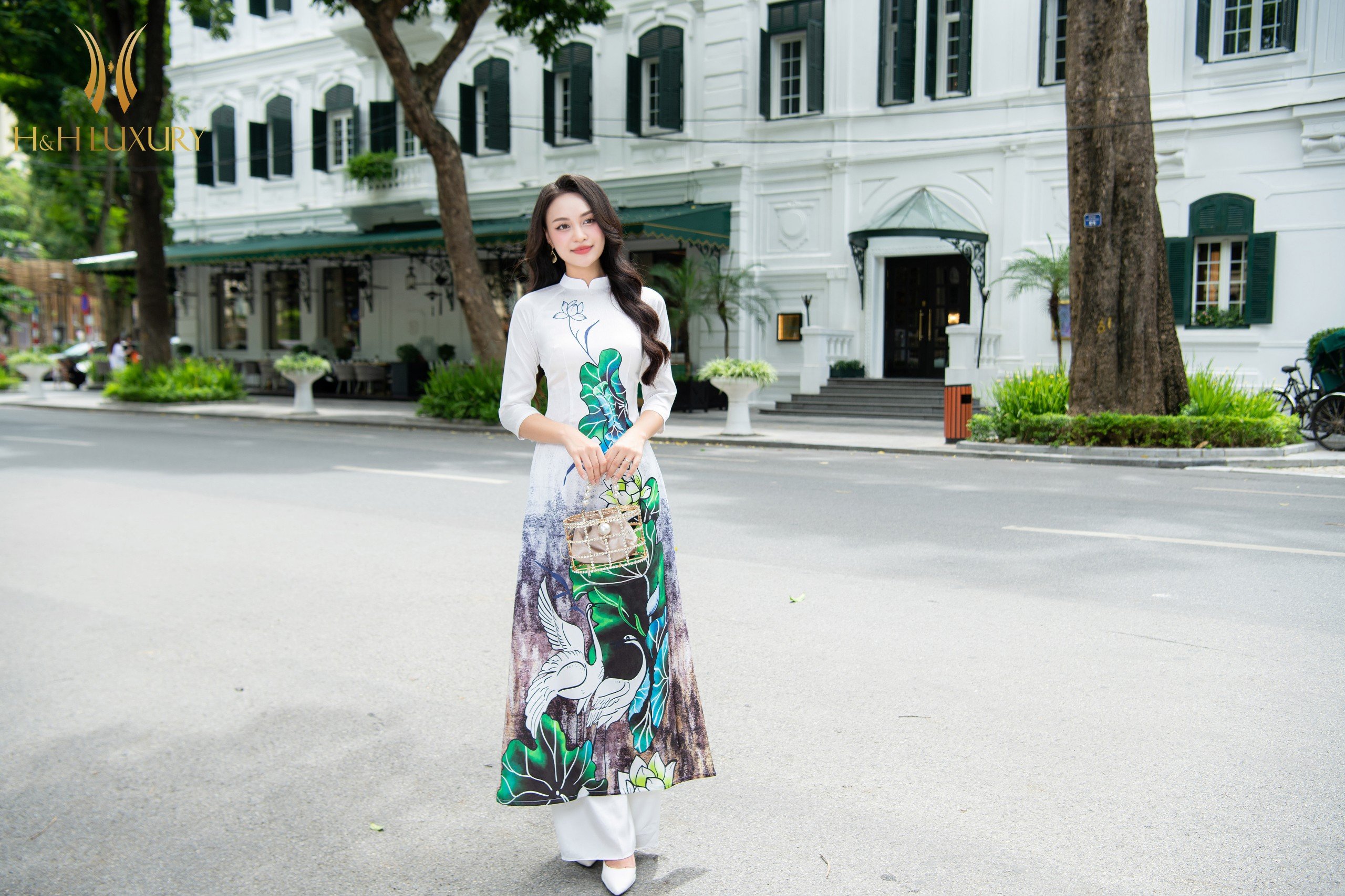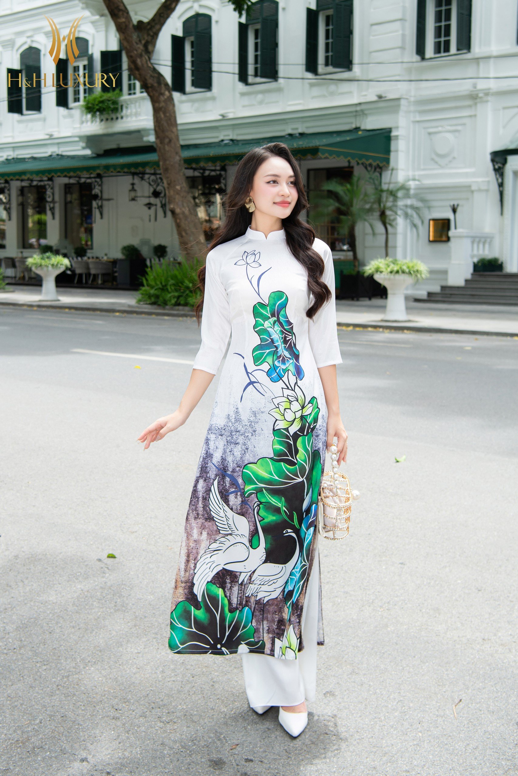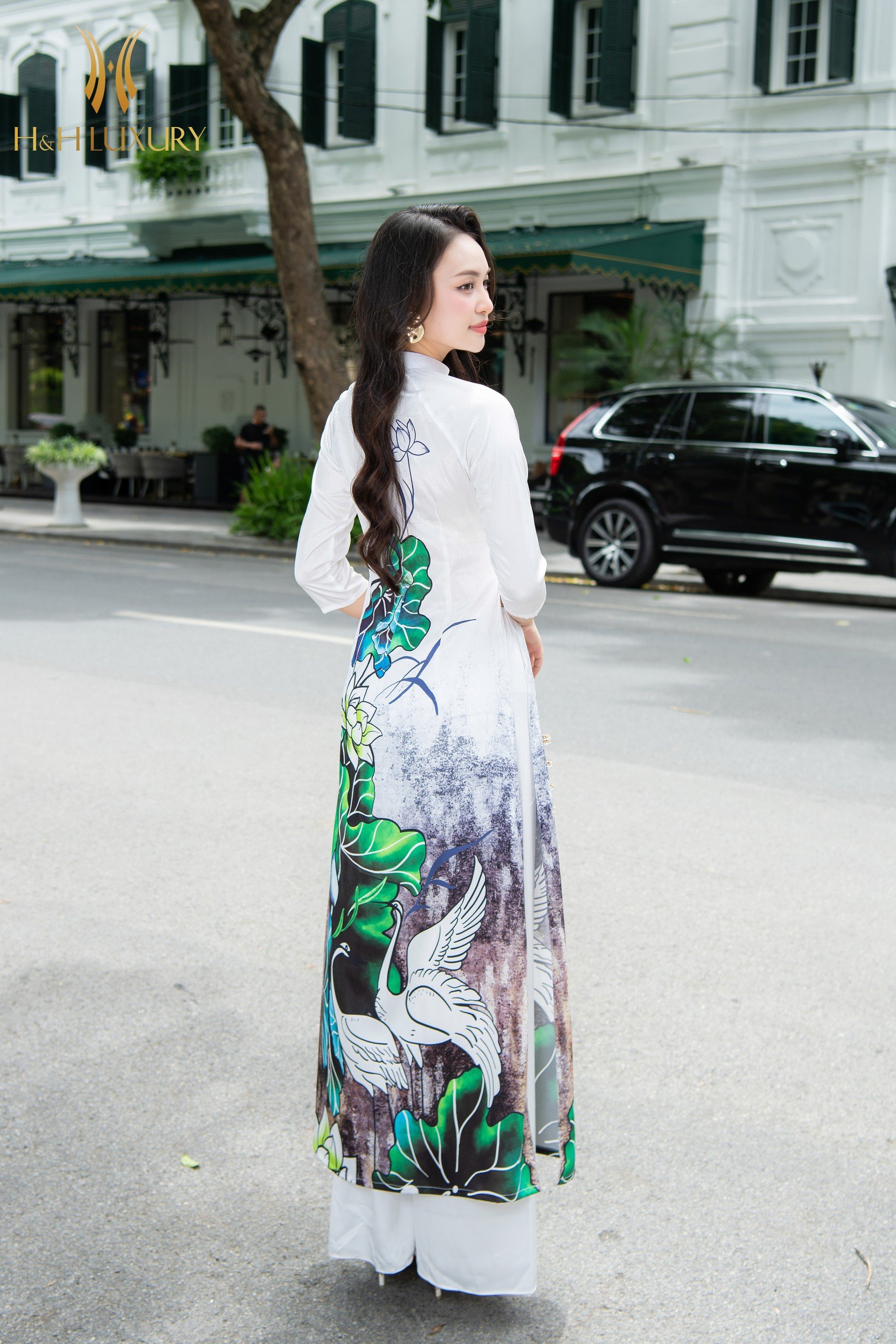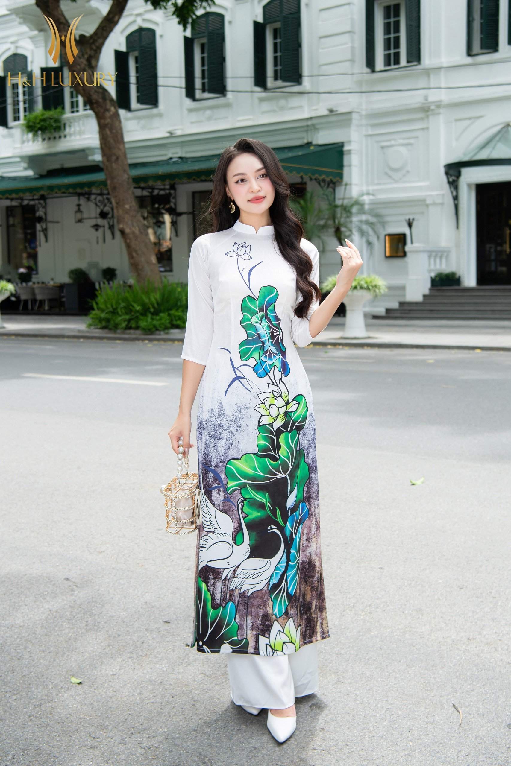 ÁO DÀI LỤA GẤM TRẮNG HOA SEN XANH