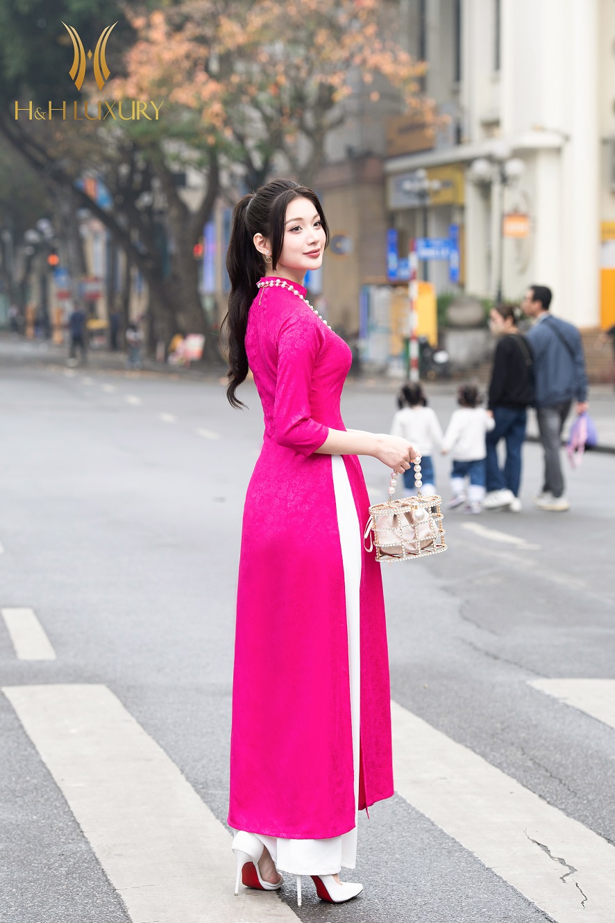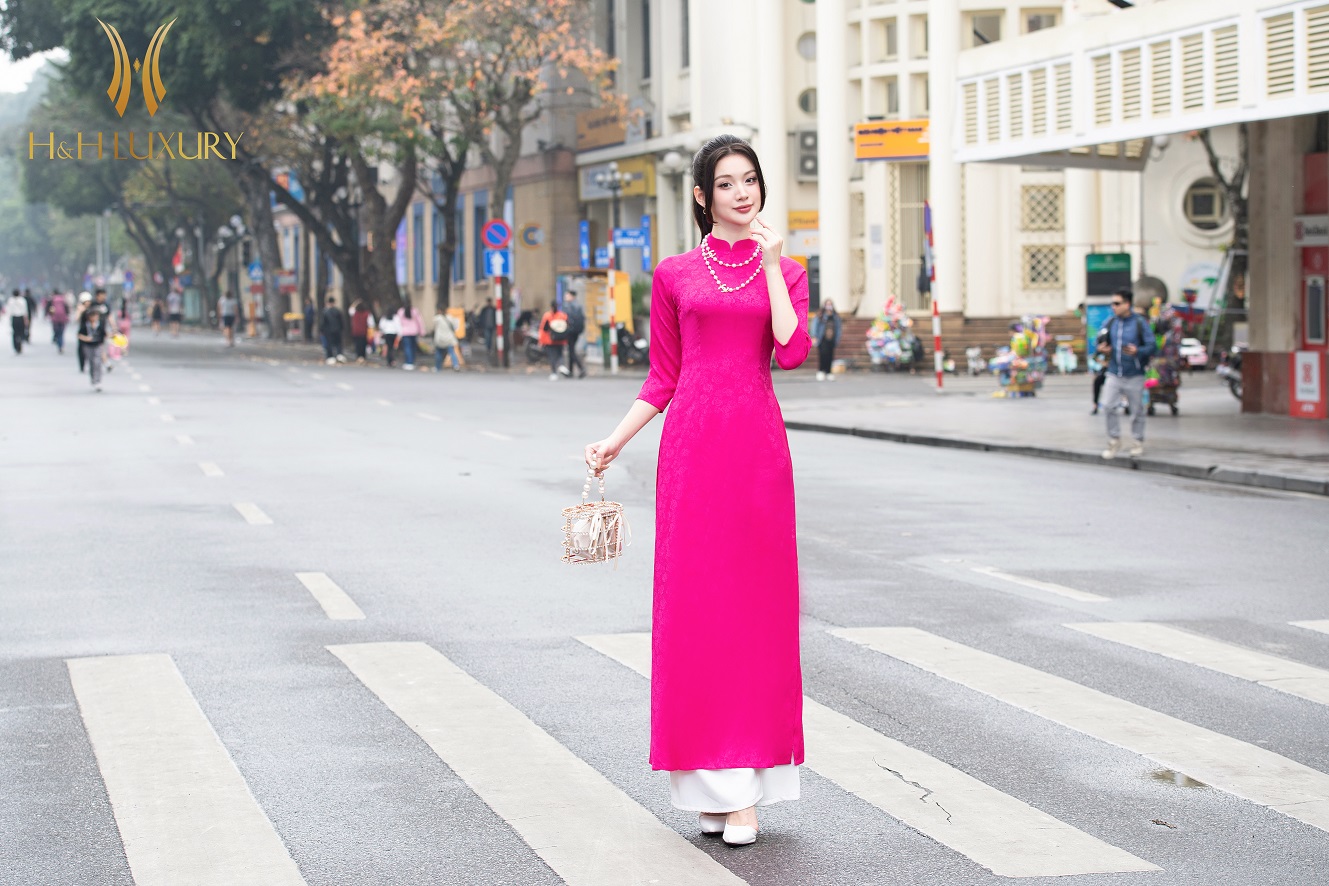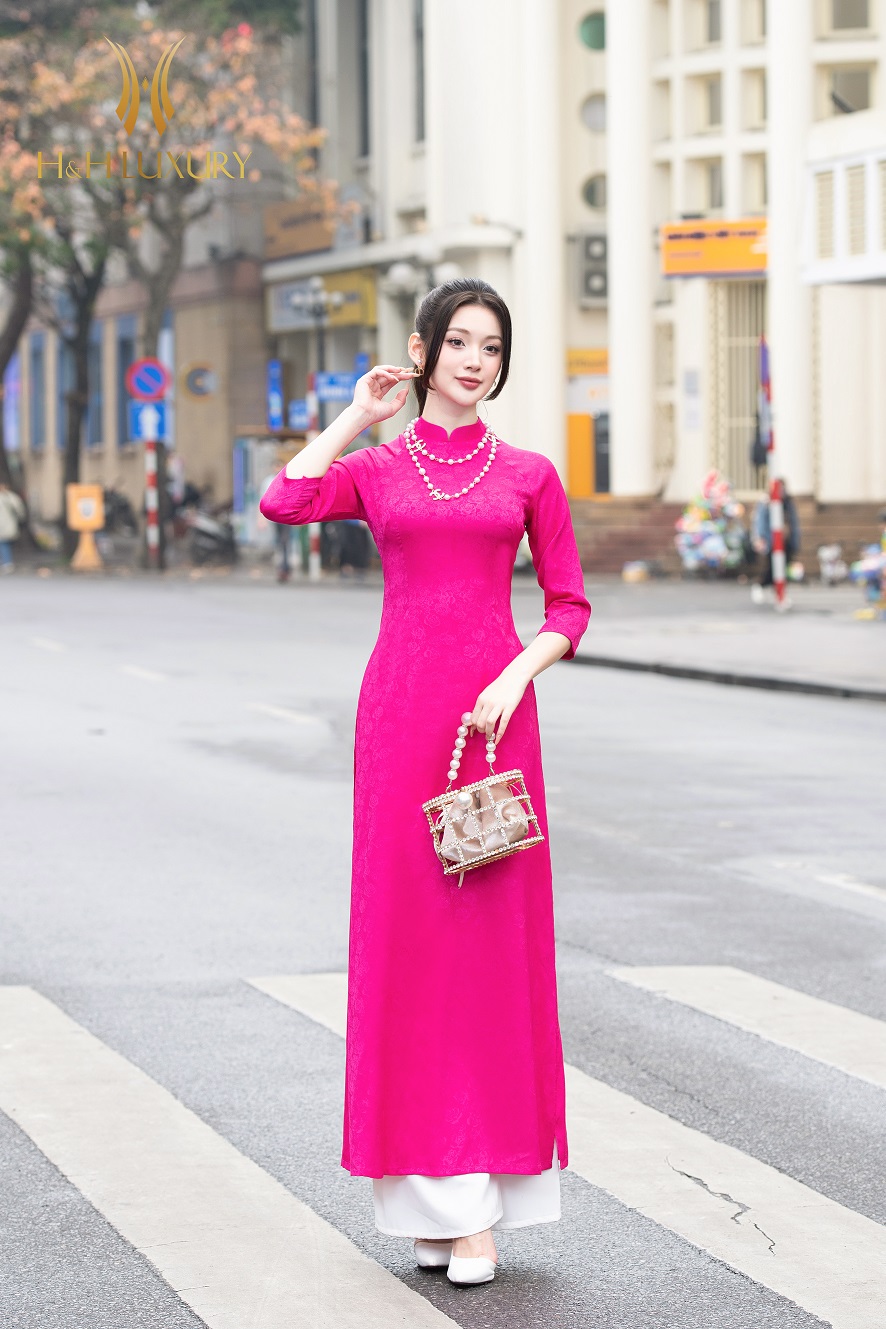 ÁO DÀI LỤA GẤM VÂN HOA HỒNG HỒNG SEN