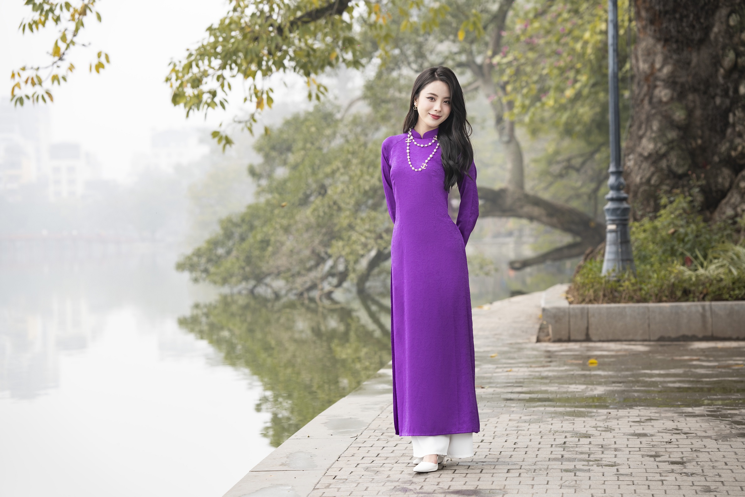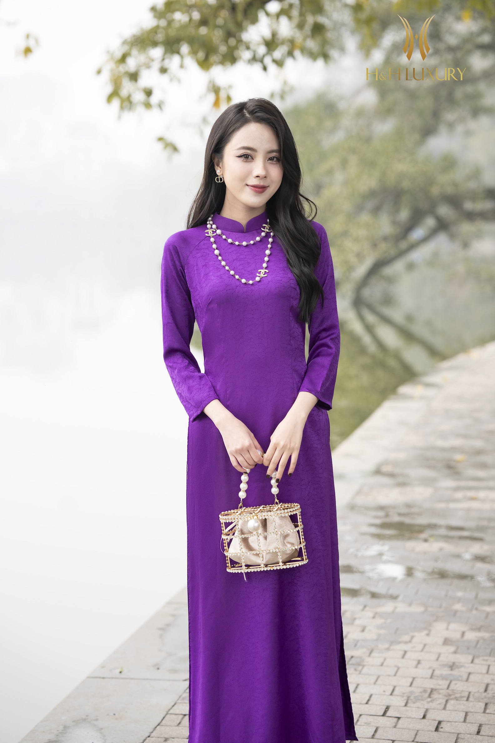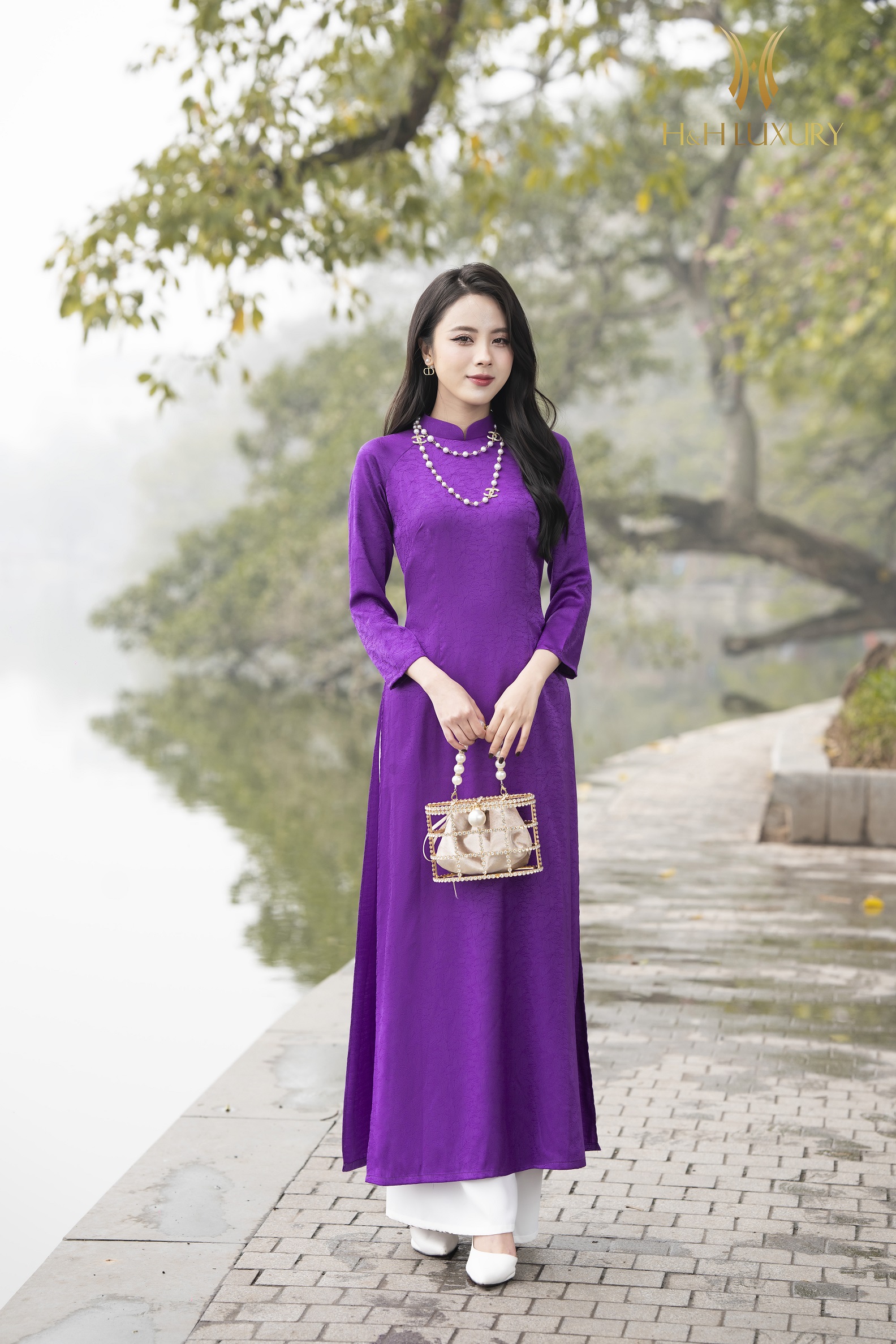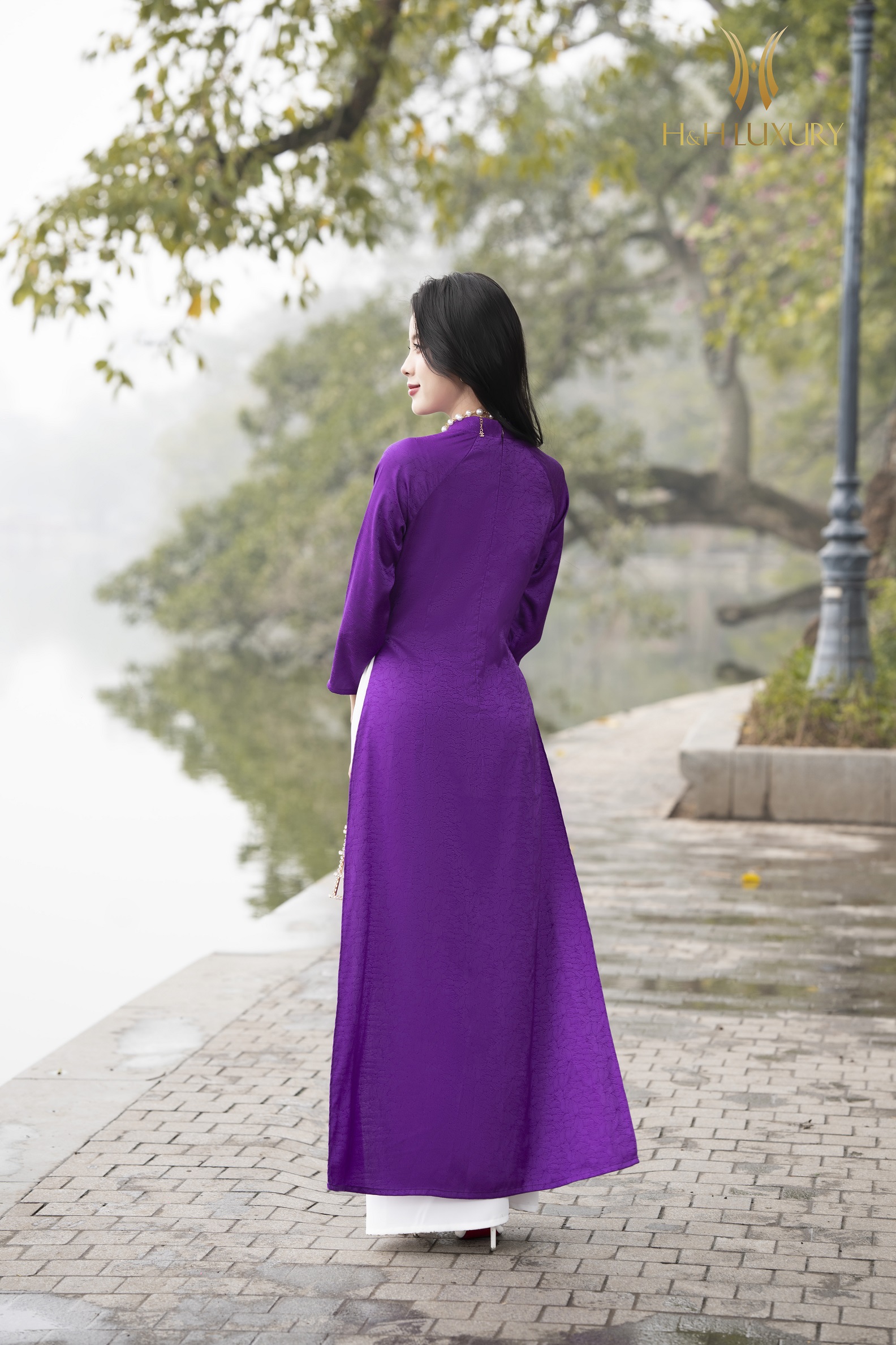 ÁO DÀI LỤA GẤM CAO CẤP VÂN LÁ TÍM HUẾ