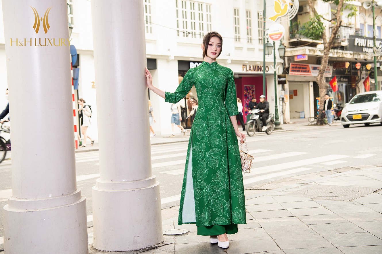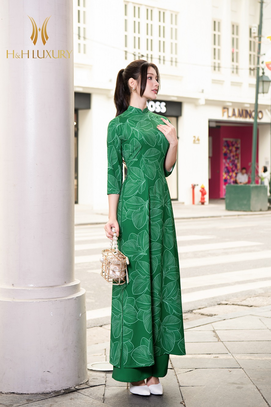 ÁO DÀI LỤA MỸ HỌA TIẾT LÁ XANH