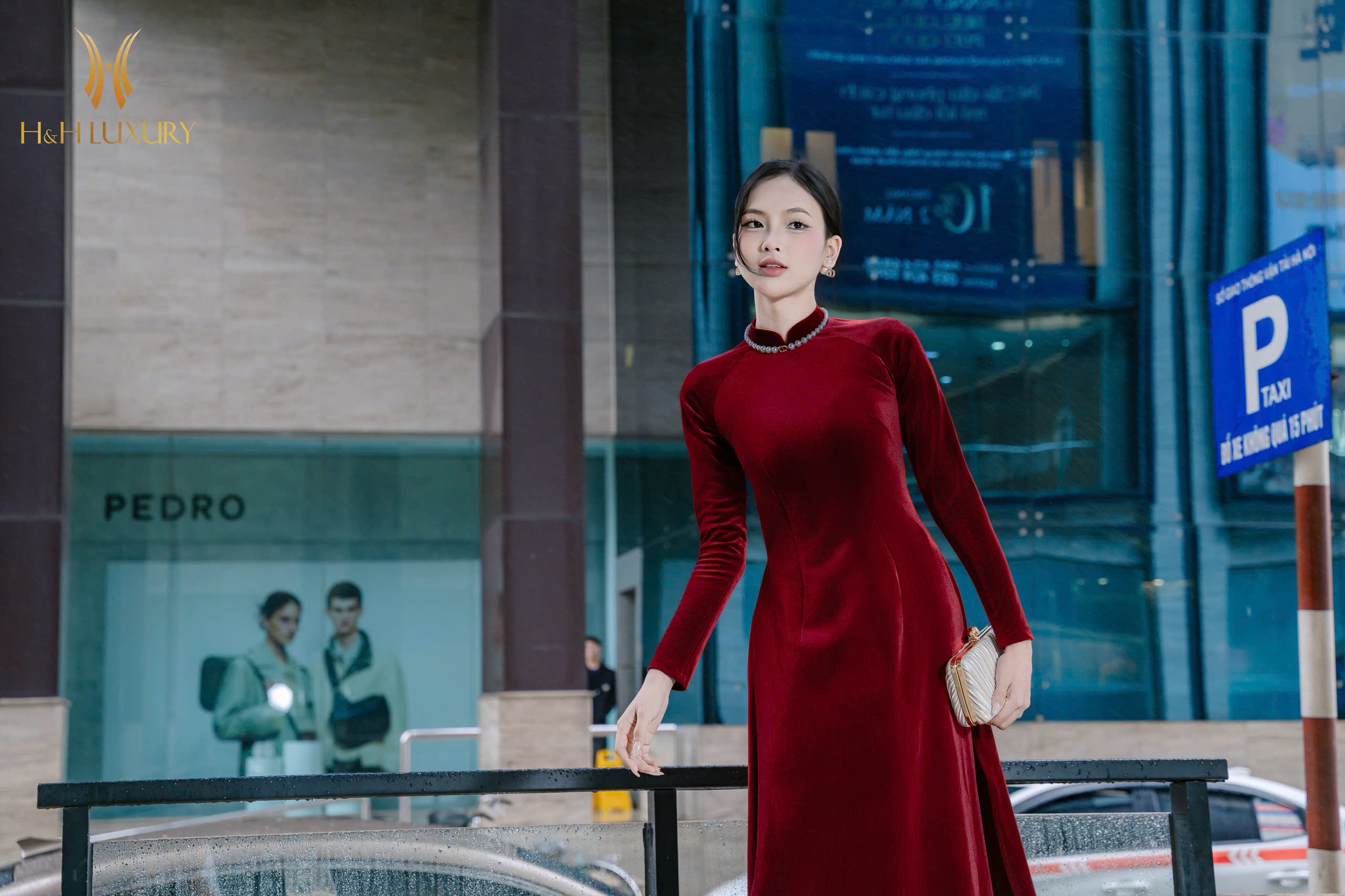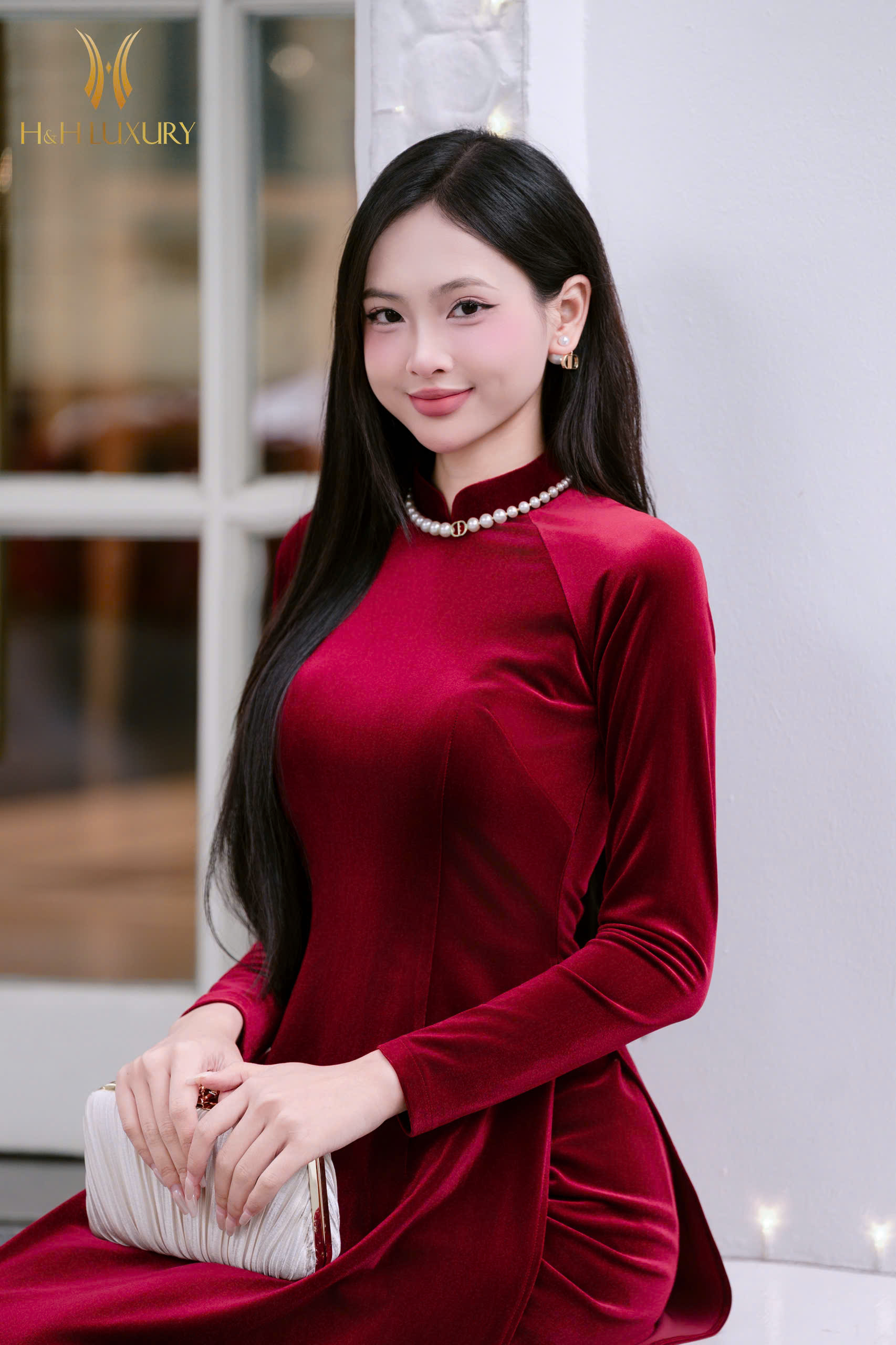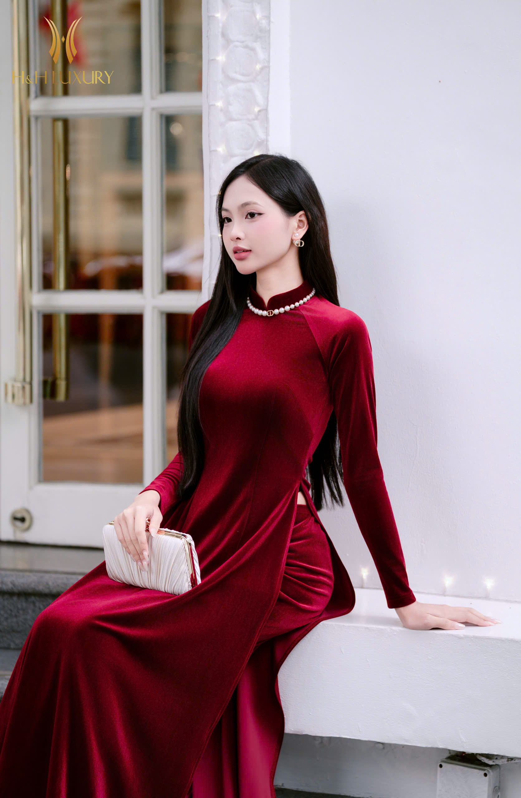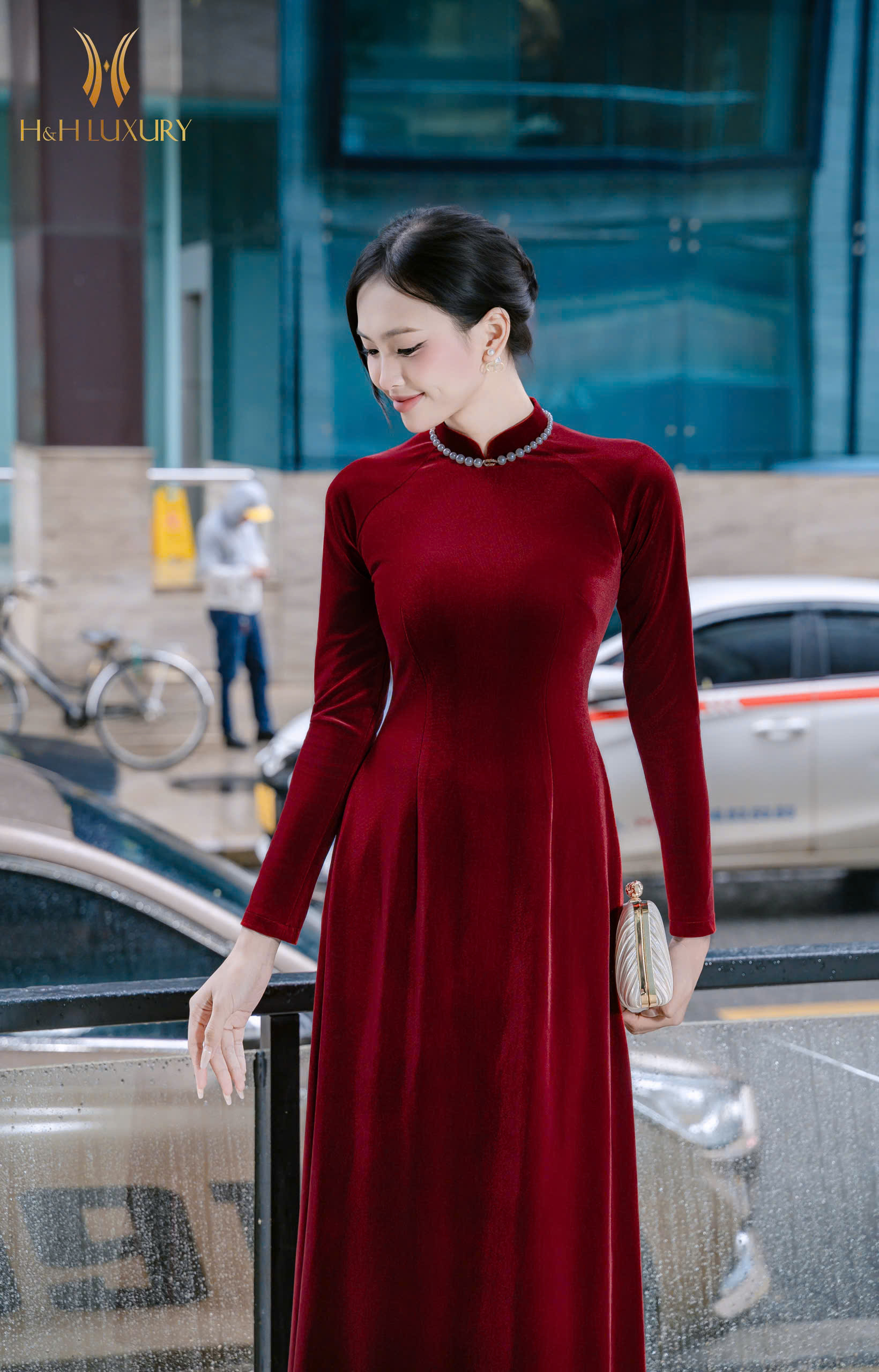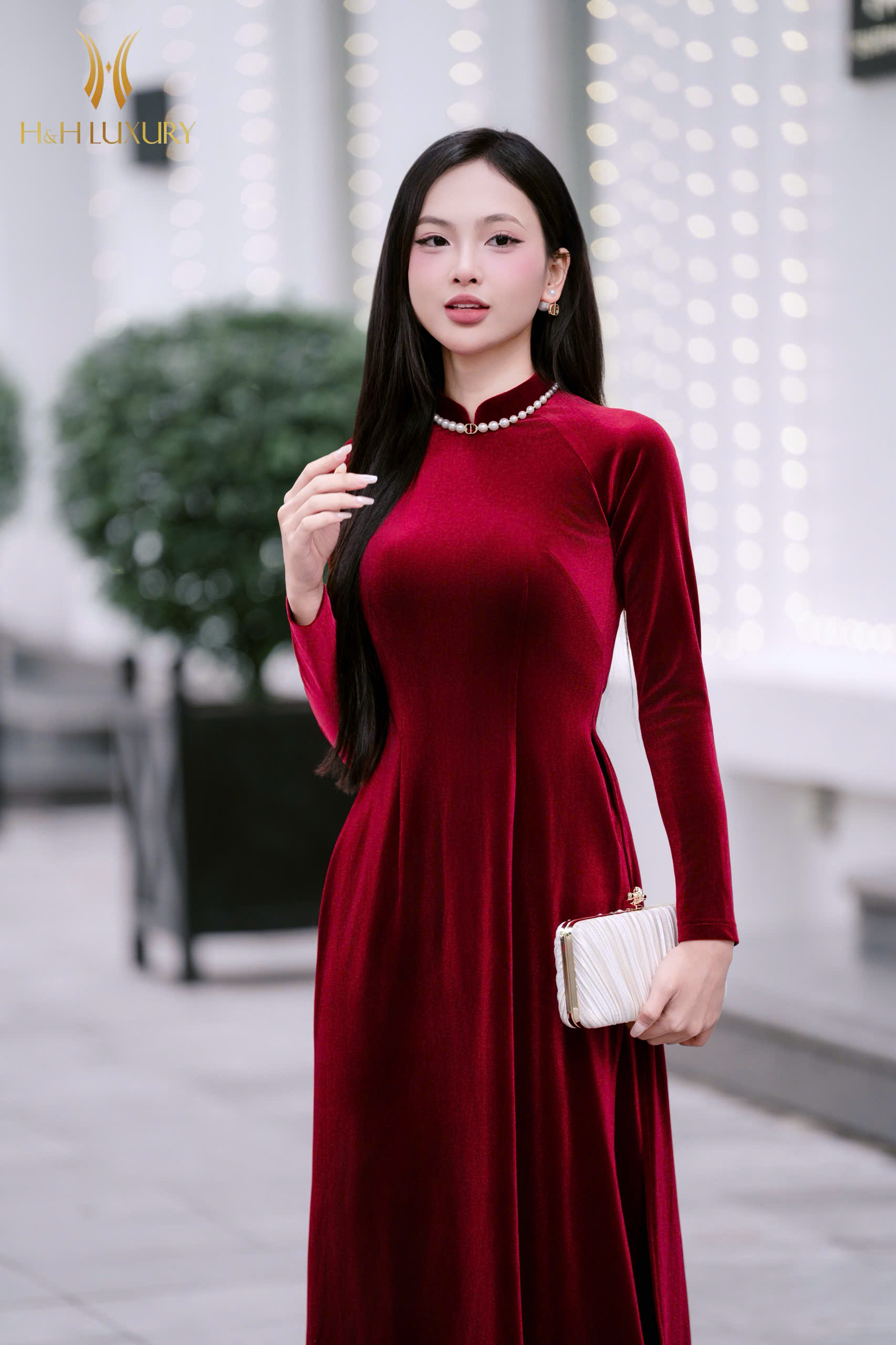 ÁO DÀI NHUNG ĐỎ CHERRY