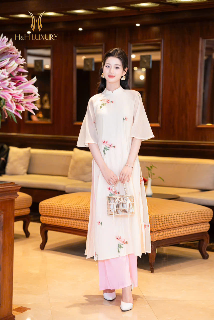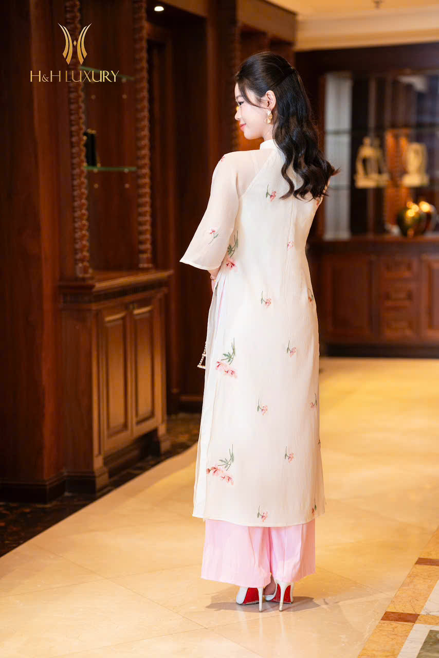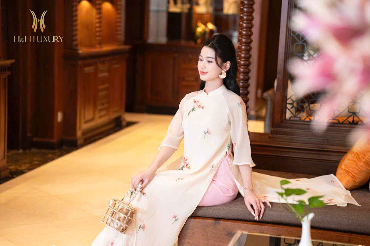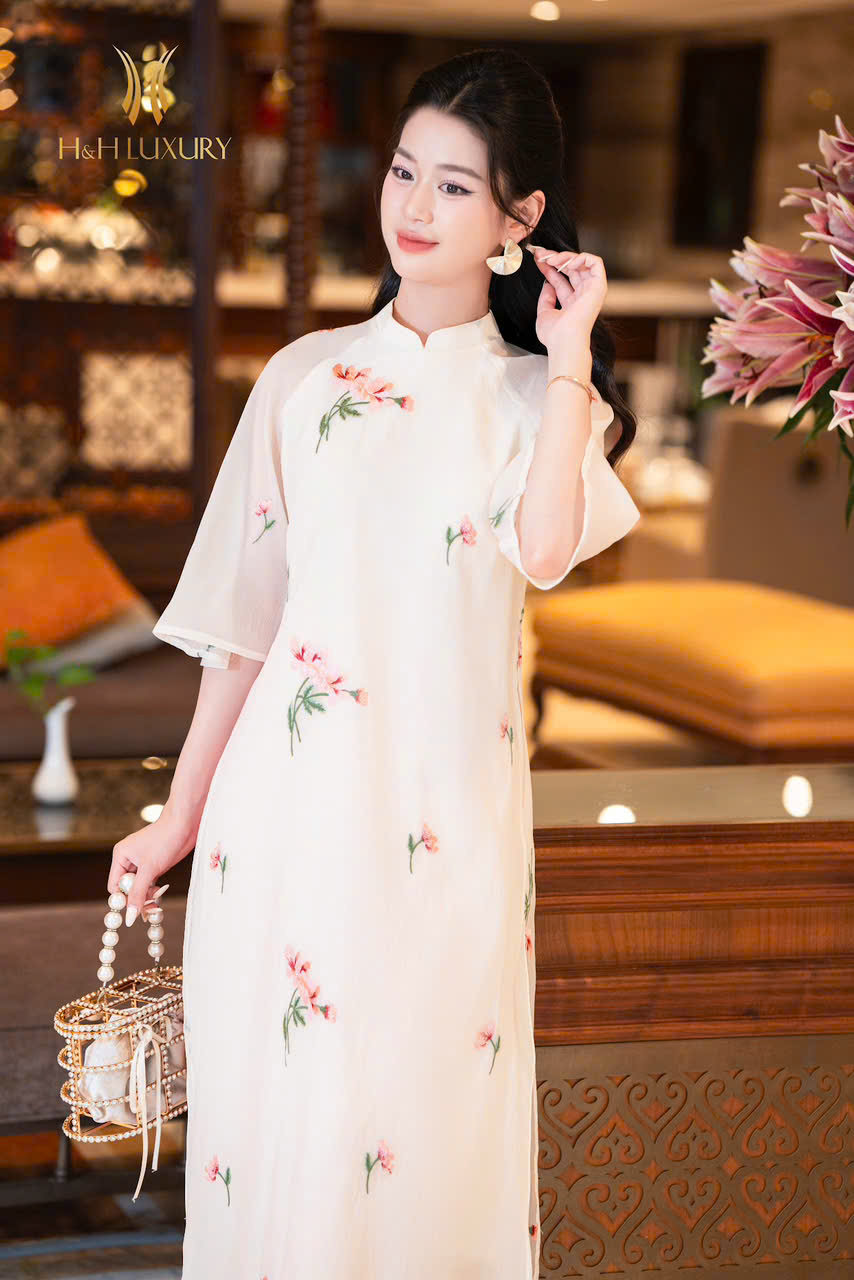 ÁO DÀI TƠ CÁCH TÂN THÊU HOA KEM NUDE