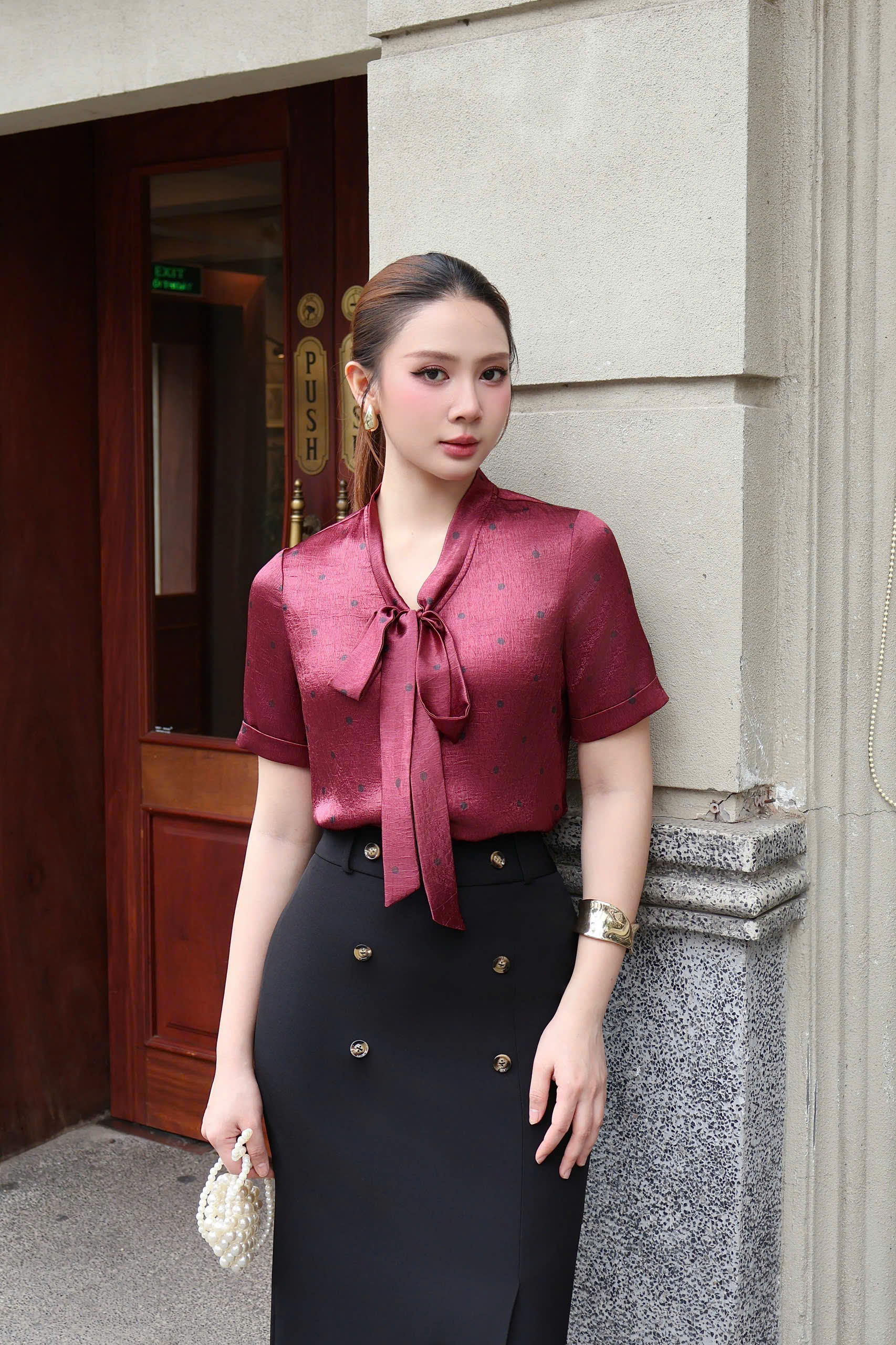 ÁO SƠ MI CHẤM ĐỎ MẬN CỔ NƠ