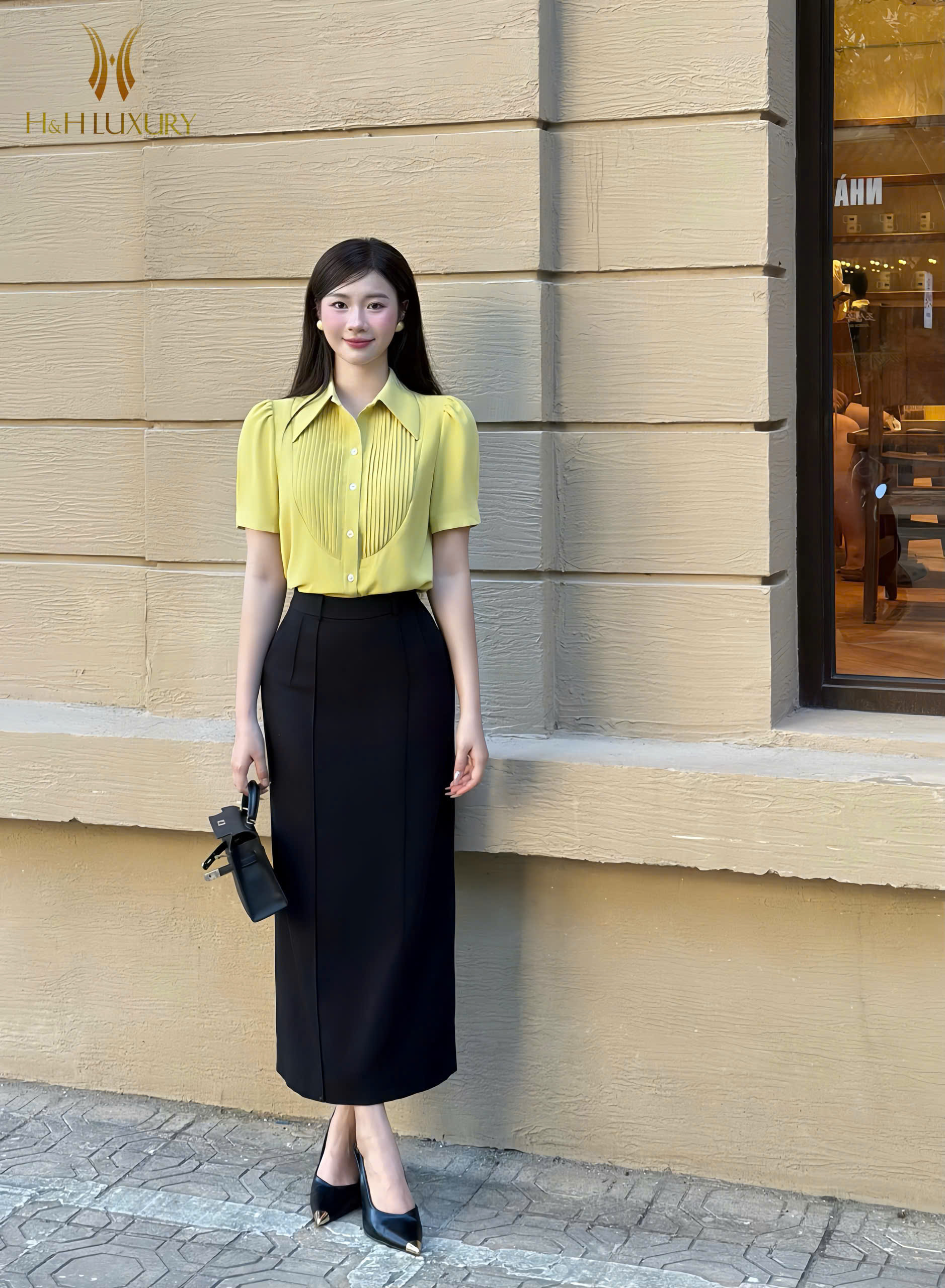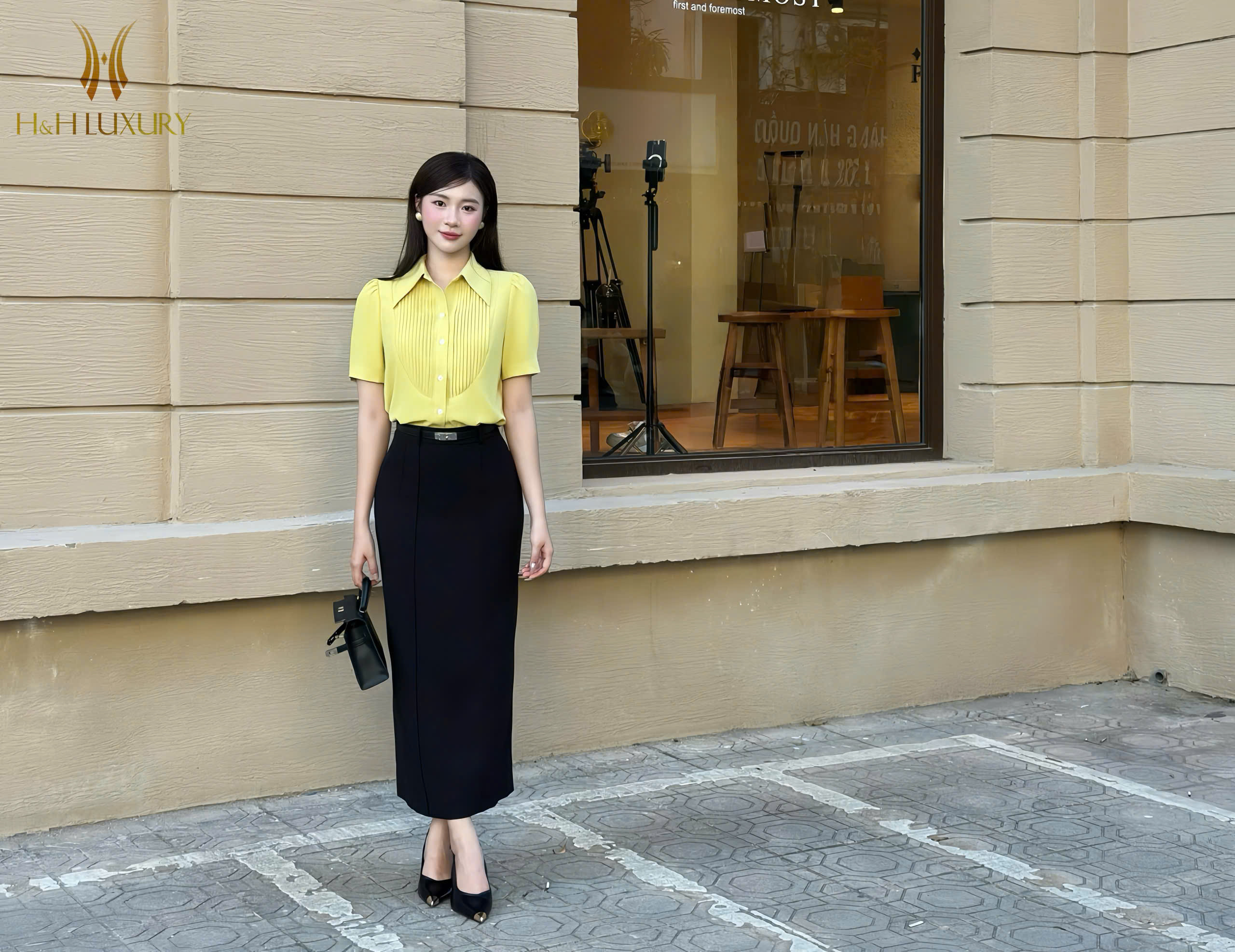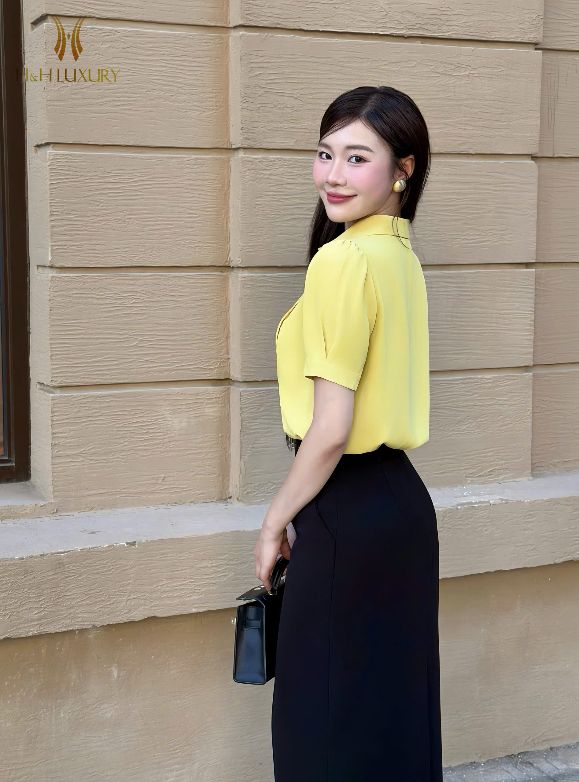 ÁO SƠ MI LỤA VÀNG MÙ TẠT CỔ ĐỨC XẾP LY