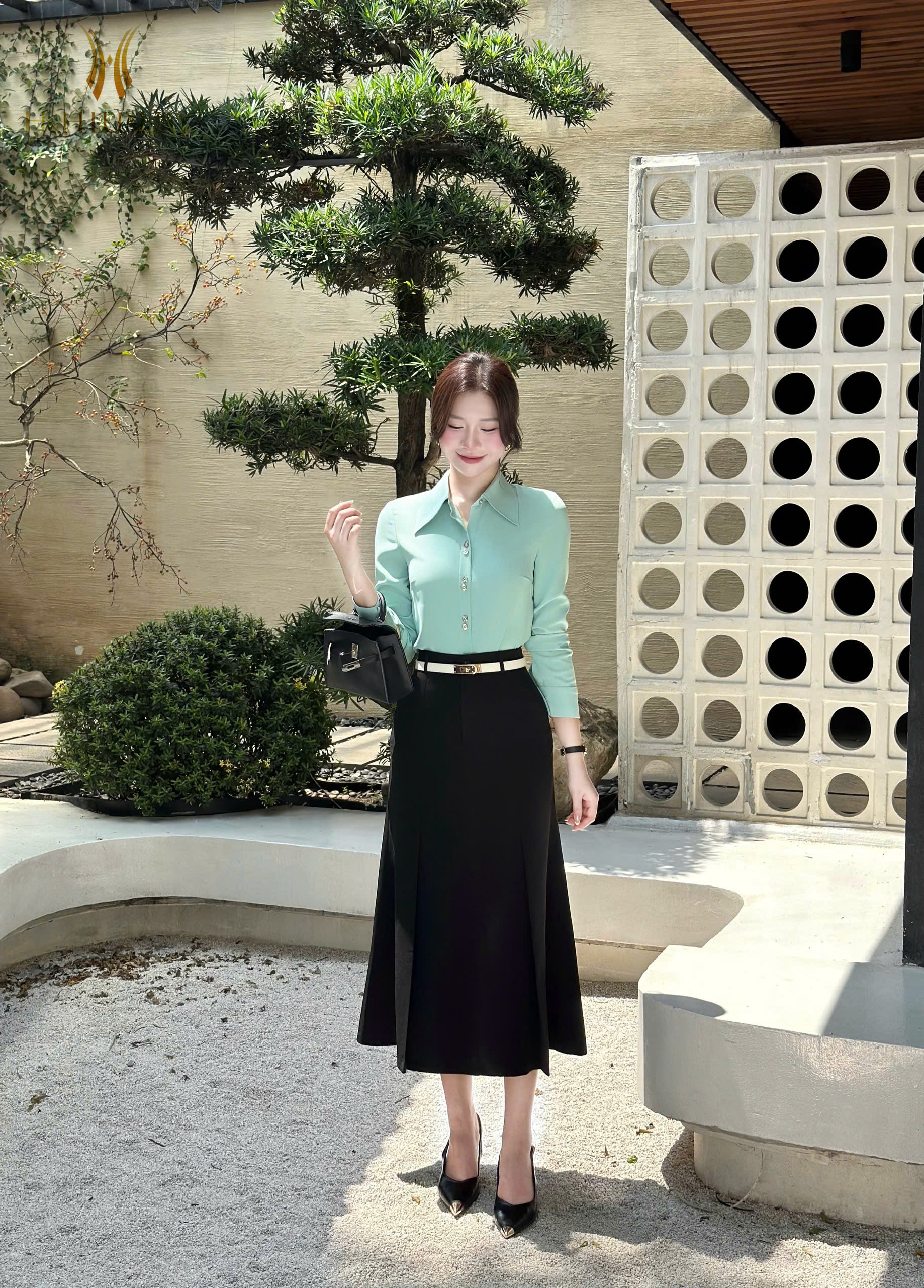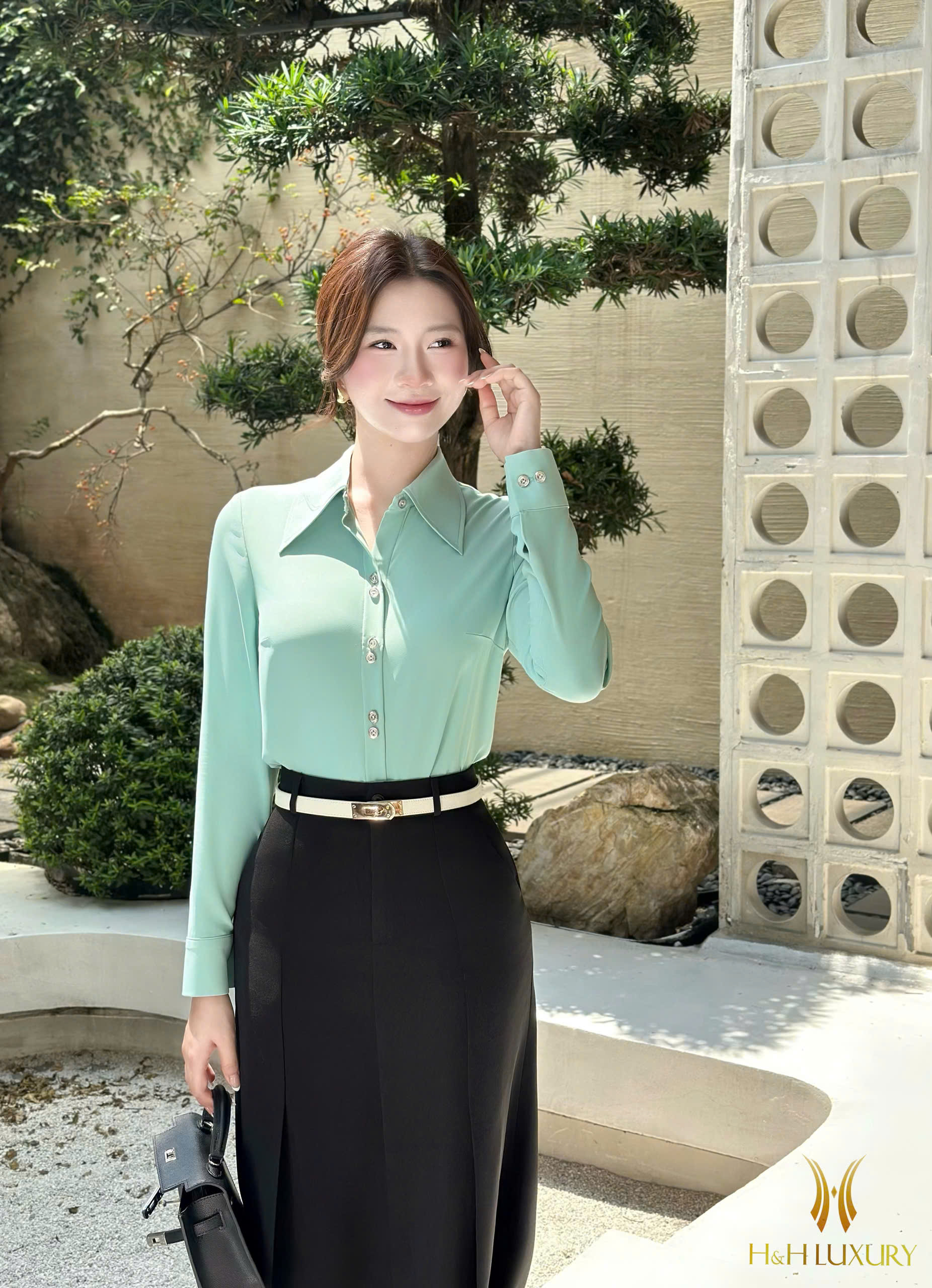 ÁO SƠ MI LỤA XANH CỔ ĐỨC