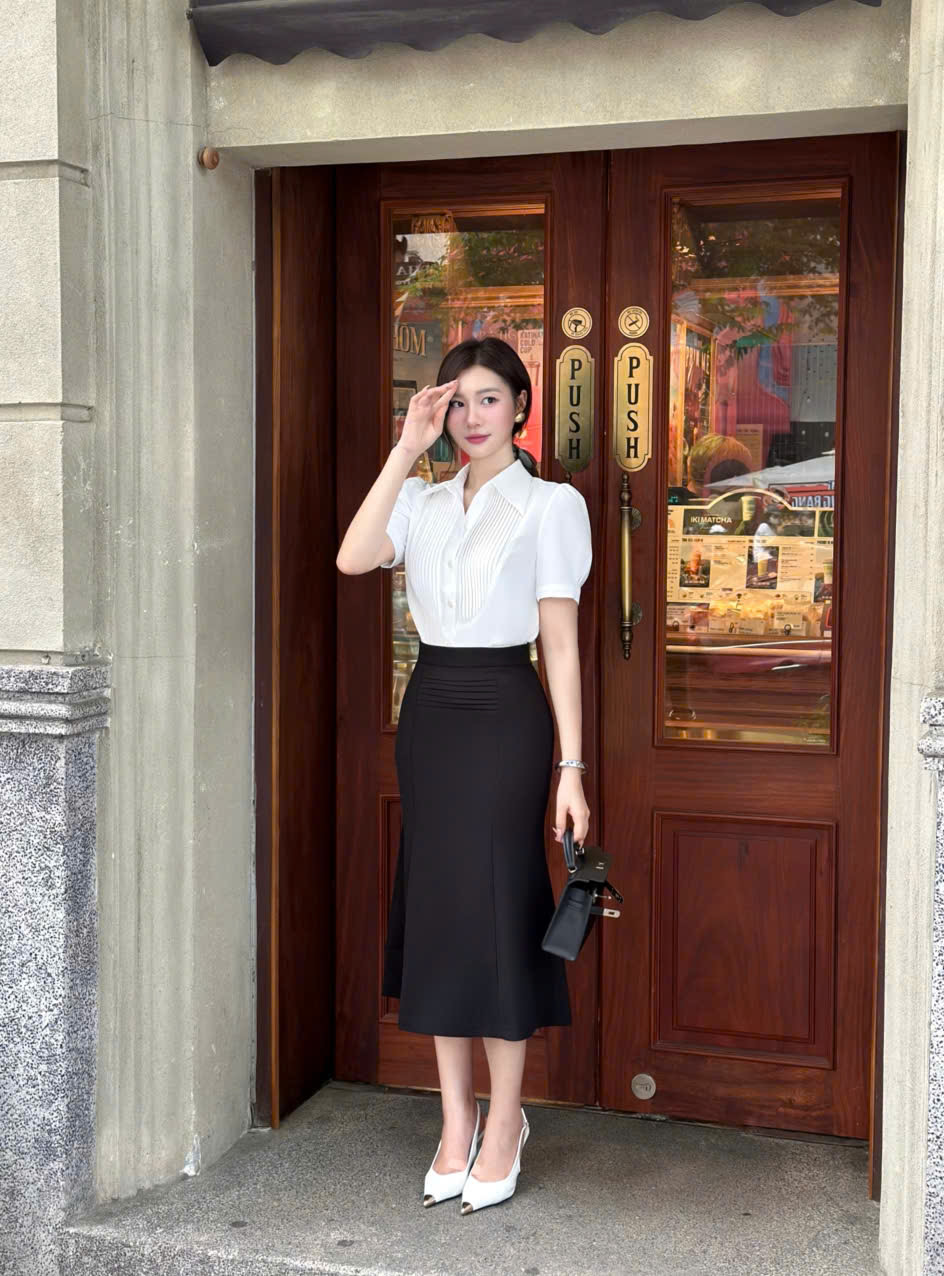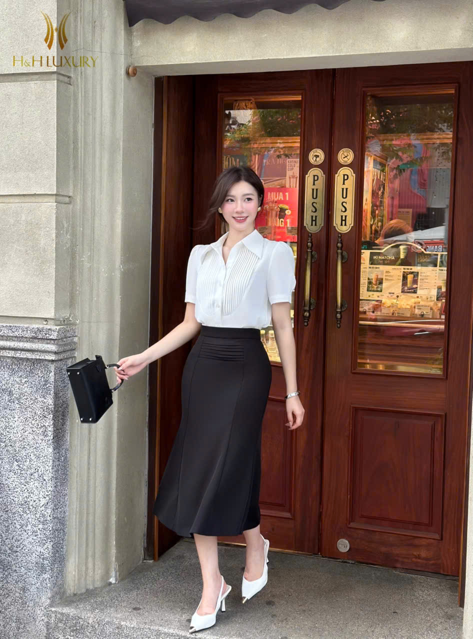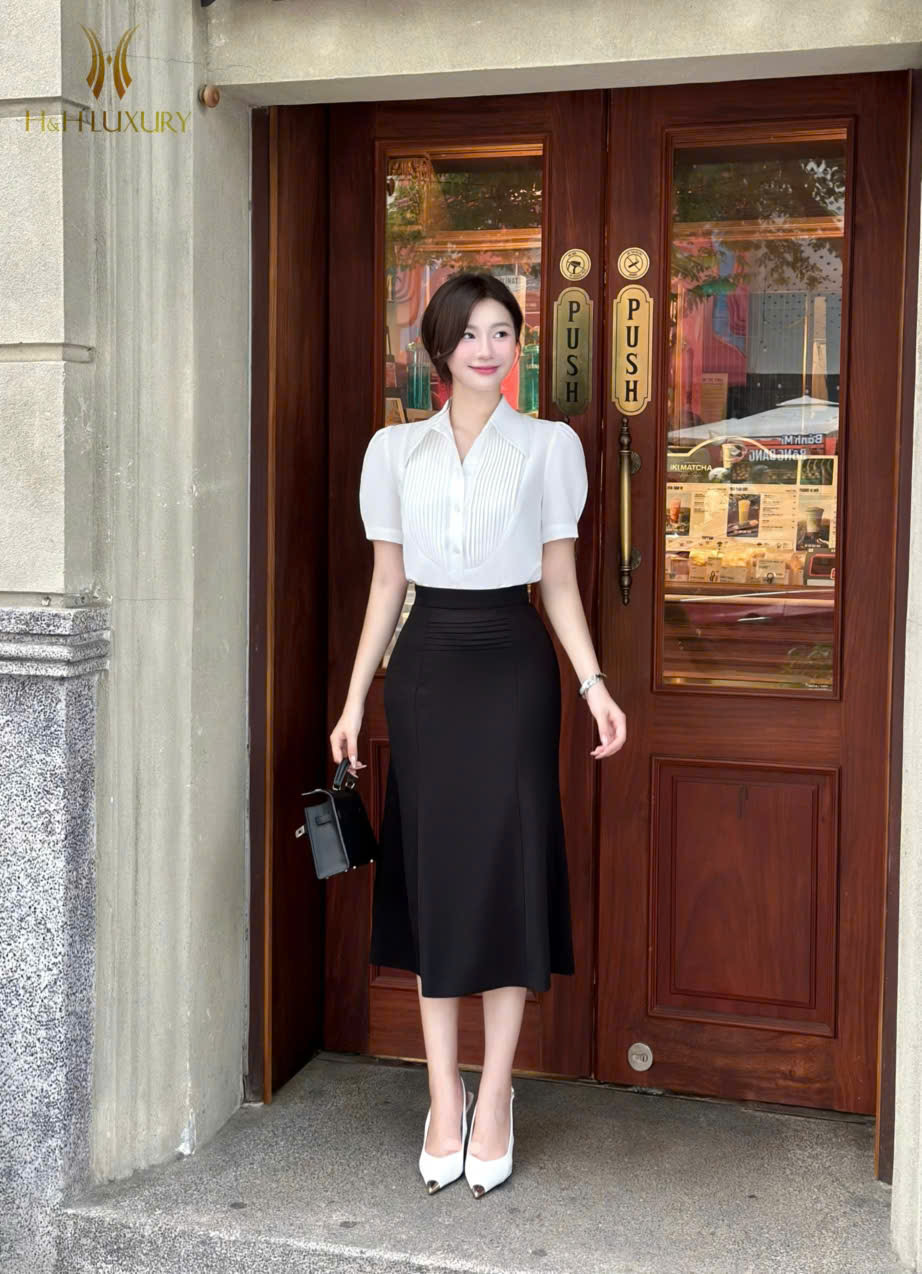 ÁO SƠ MI TRẮNG LỤA HÀN XẾP LY CỔ ĐỨC