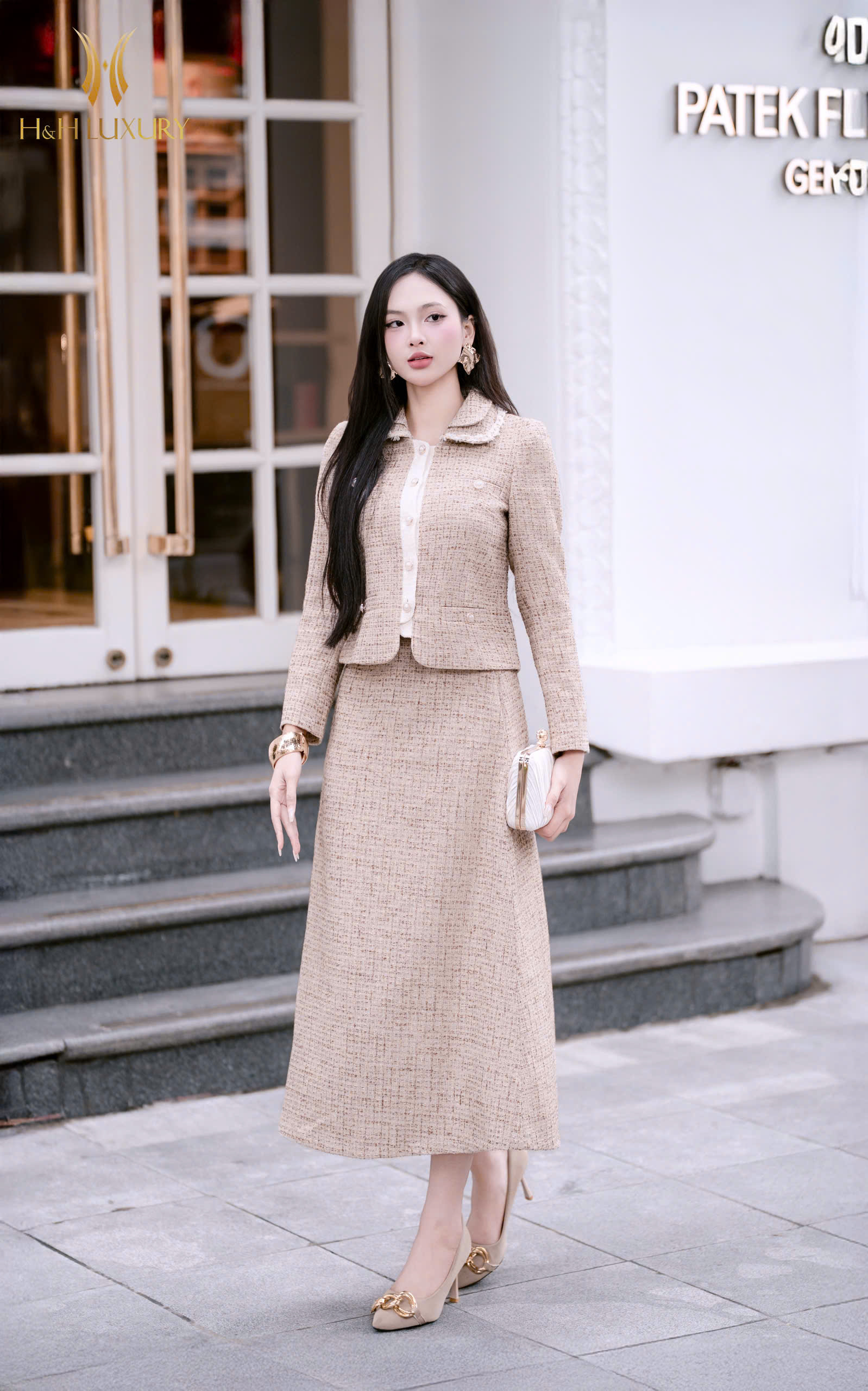 CHÂN VÁY DẠ TWEED BEIGE 2 TÚI
