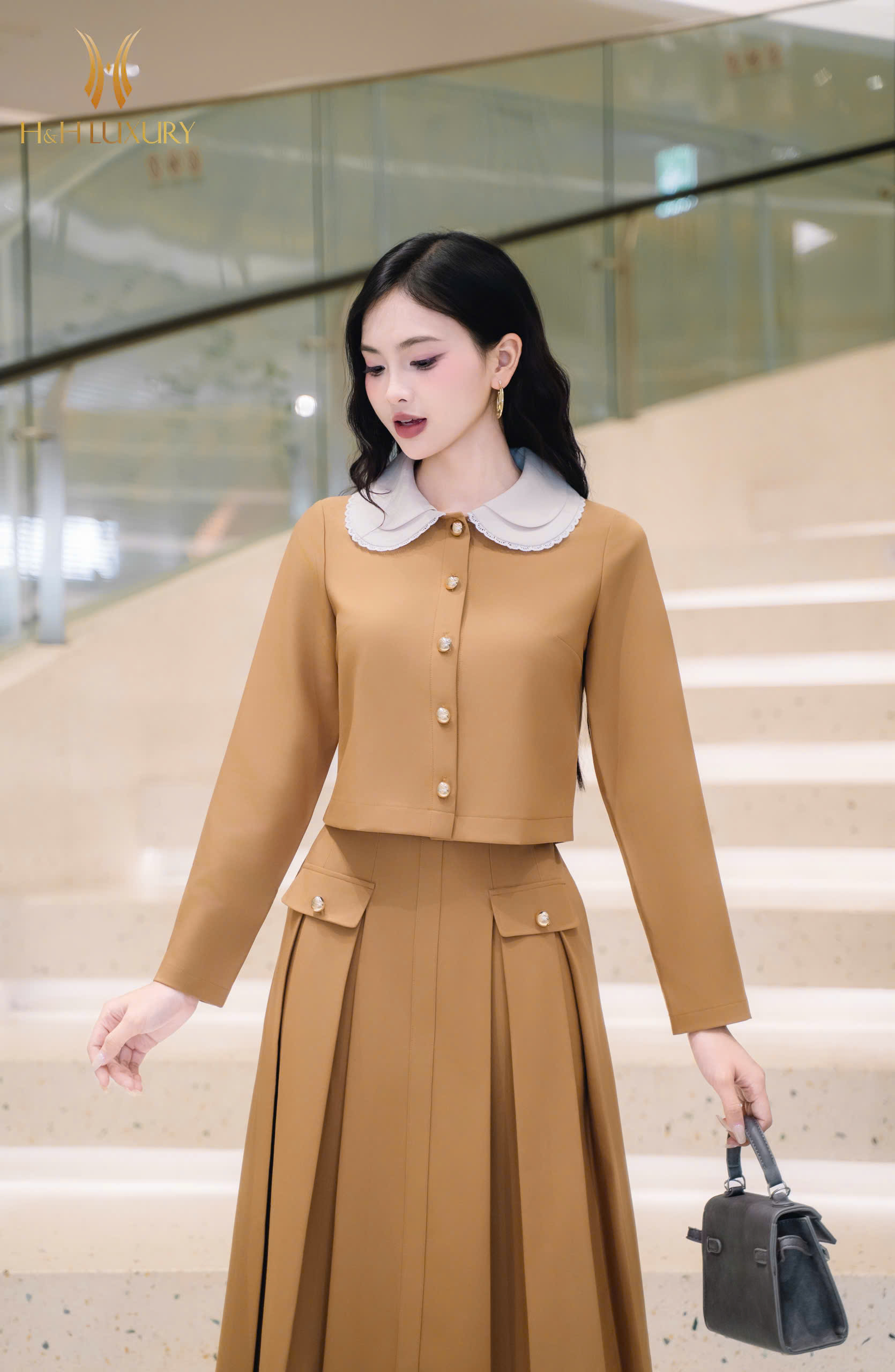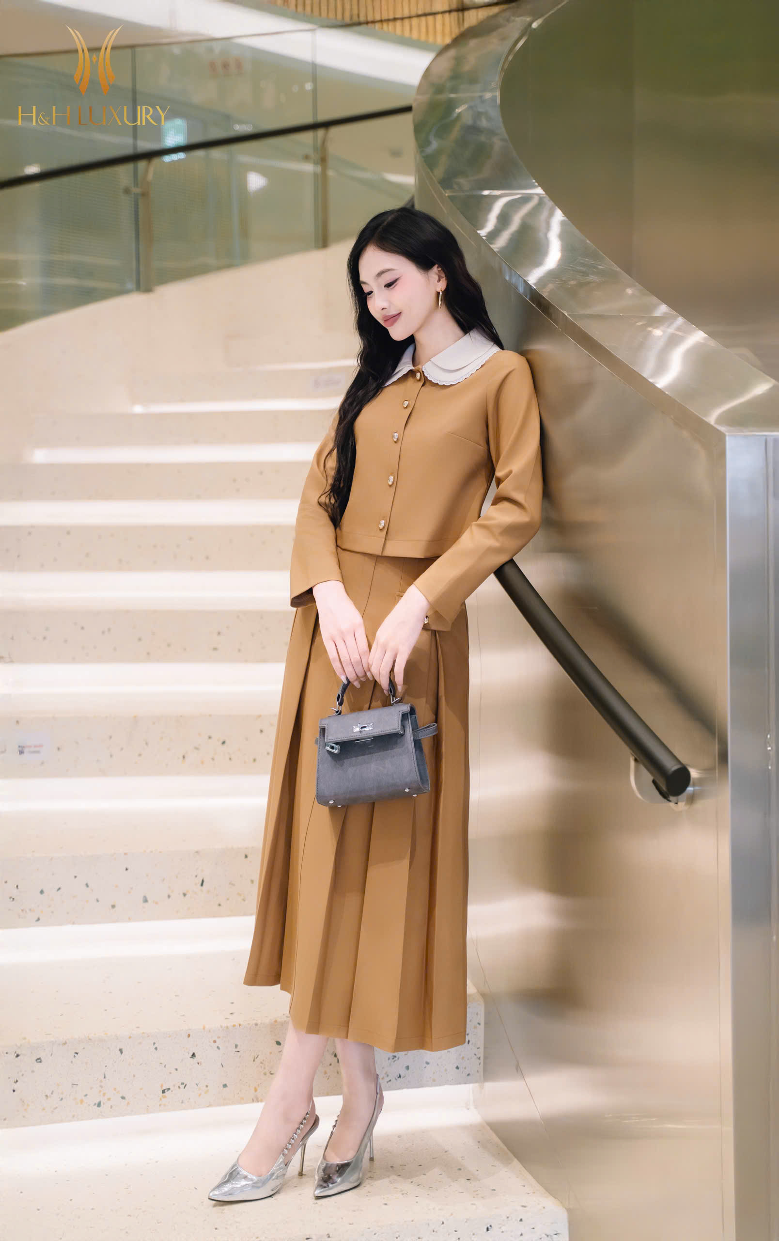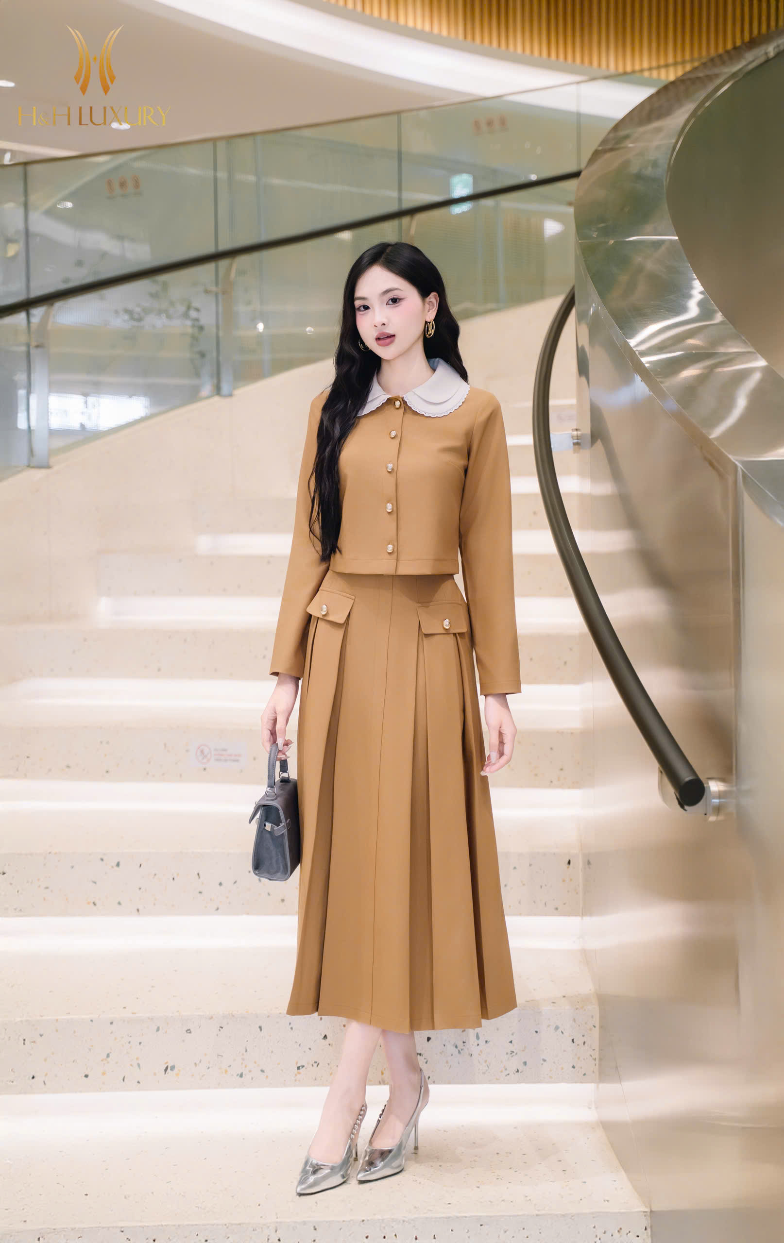 CHÂN VÁY XẾP LY NÂU BÒ ĐÍNH CÚC