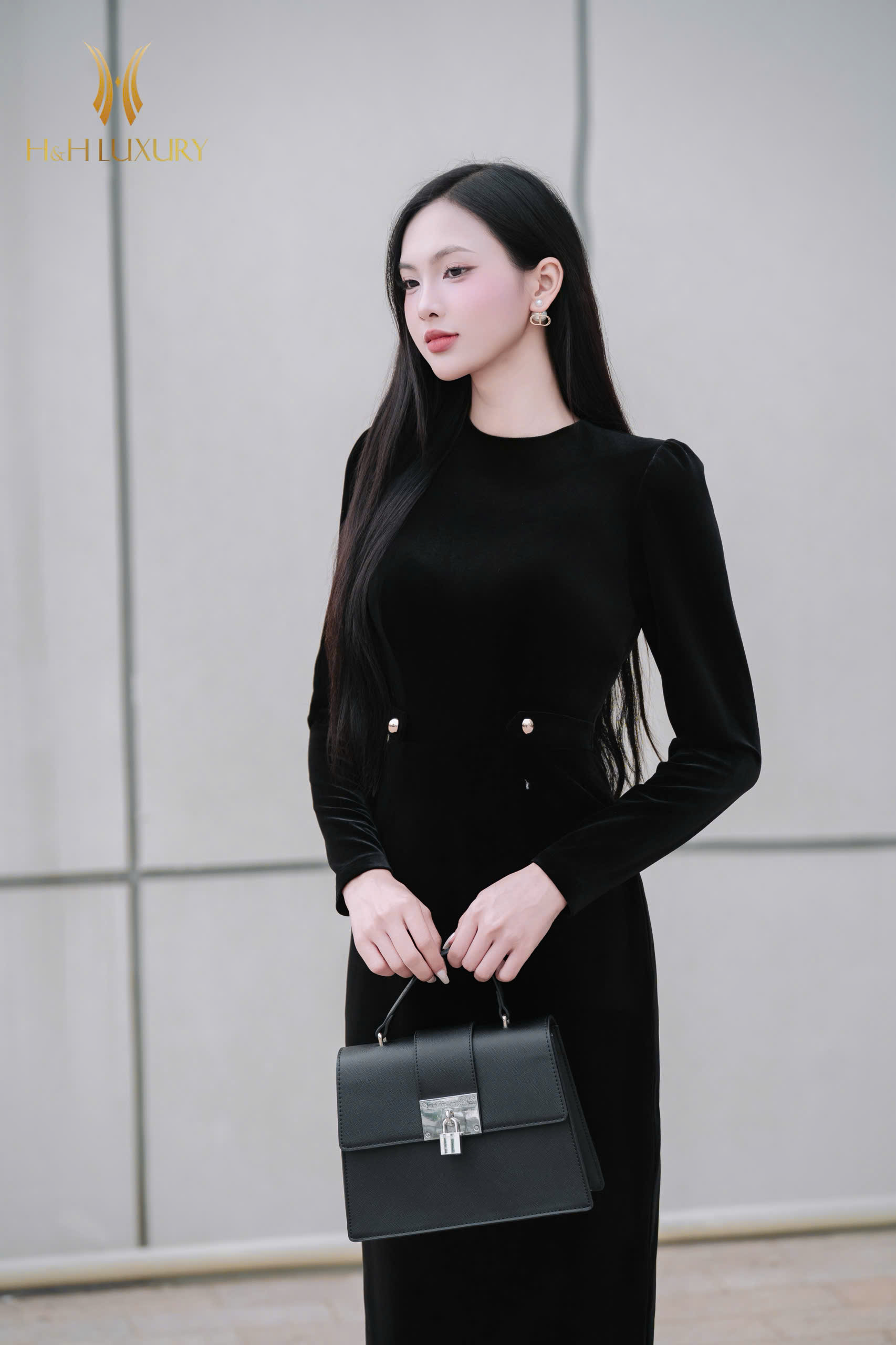 ĐẦM BÚT CHÌ NHUNG ĐEN CÚC EO
