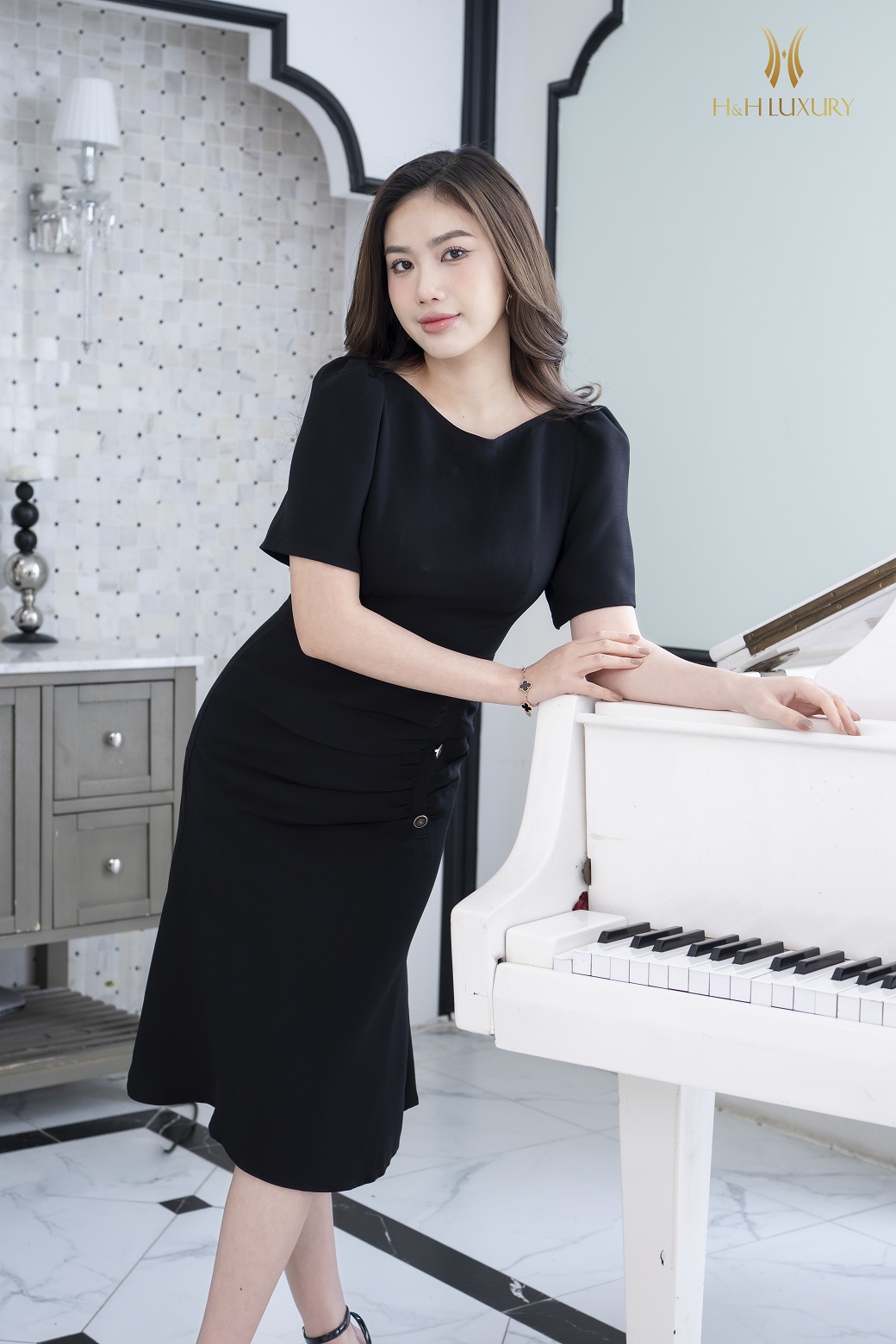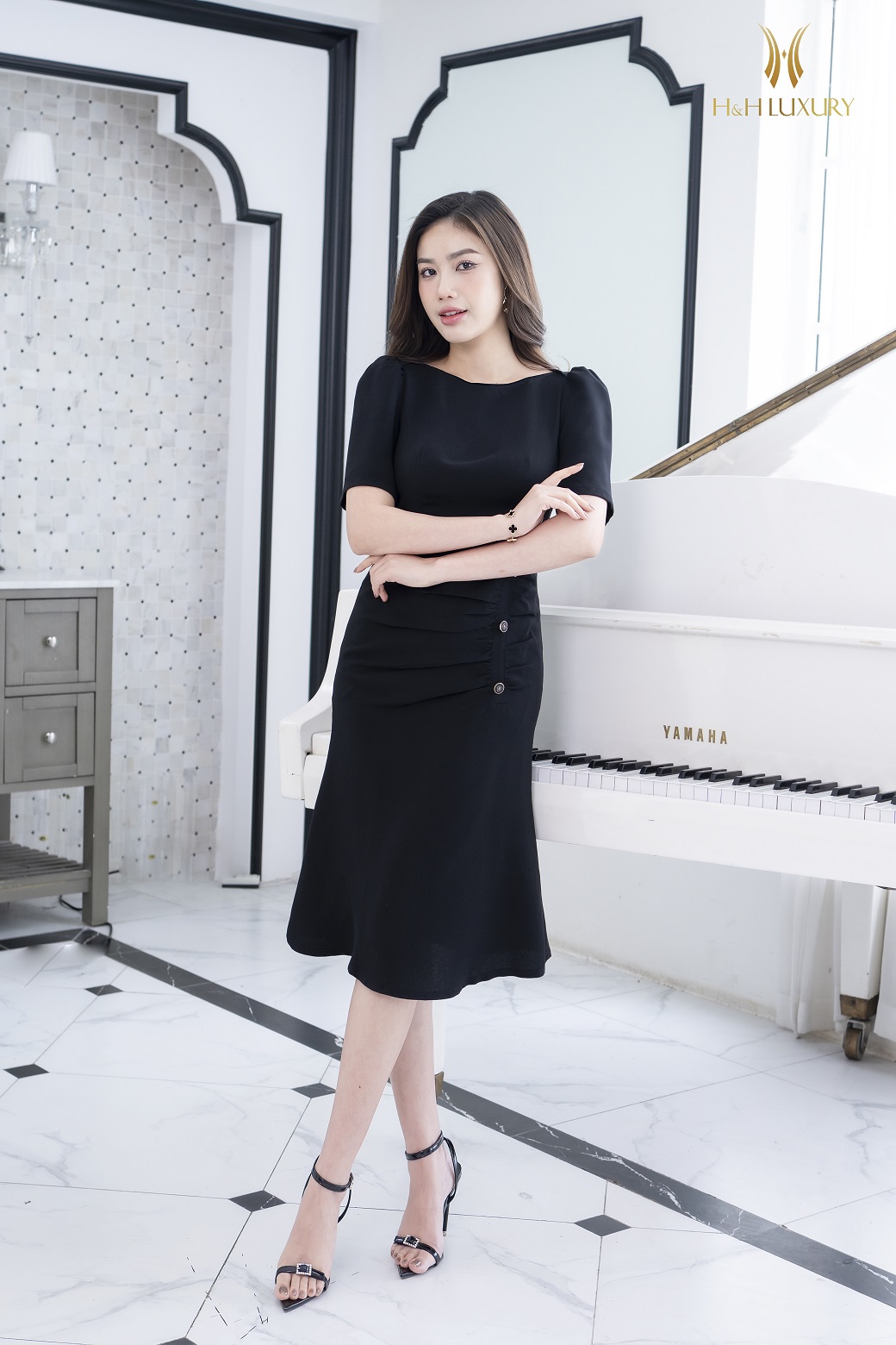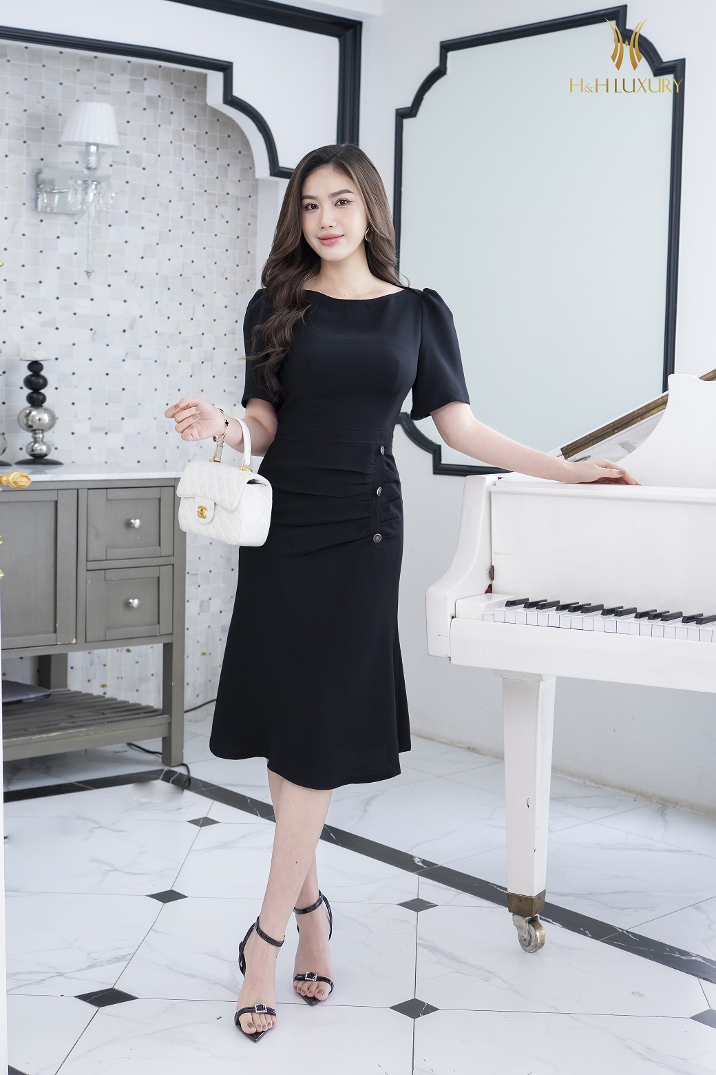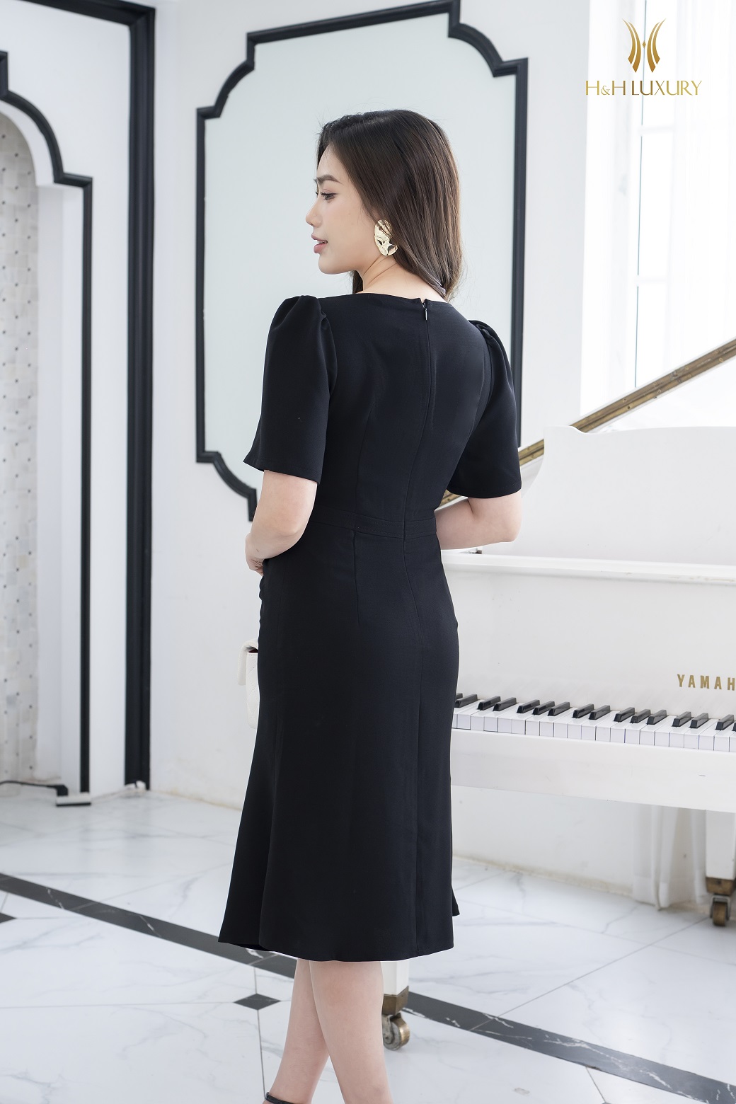 ĐẦM ĐUÔI CÁ ĐEN CHÉO HÀN ĐÍNH CÚC