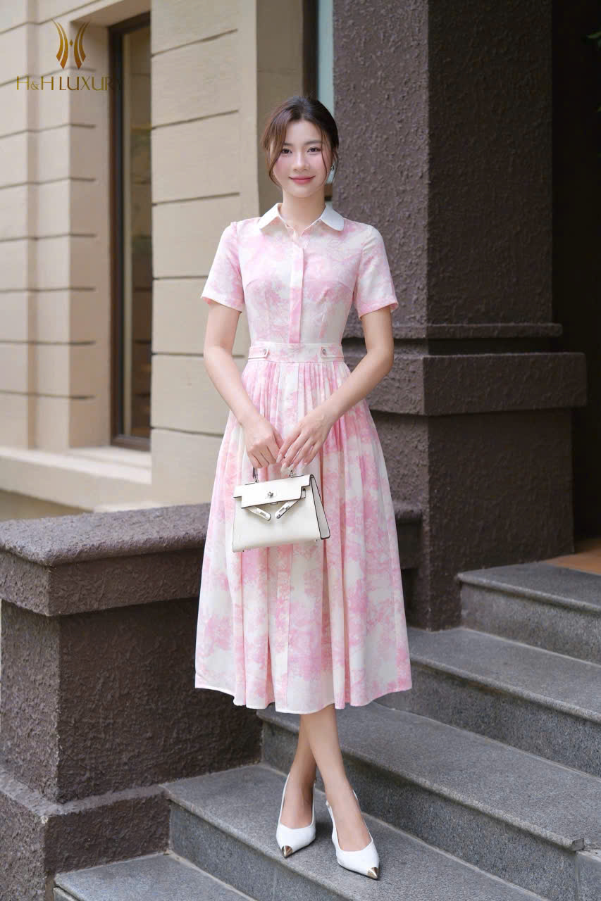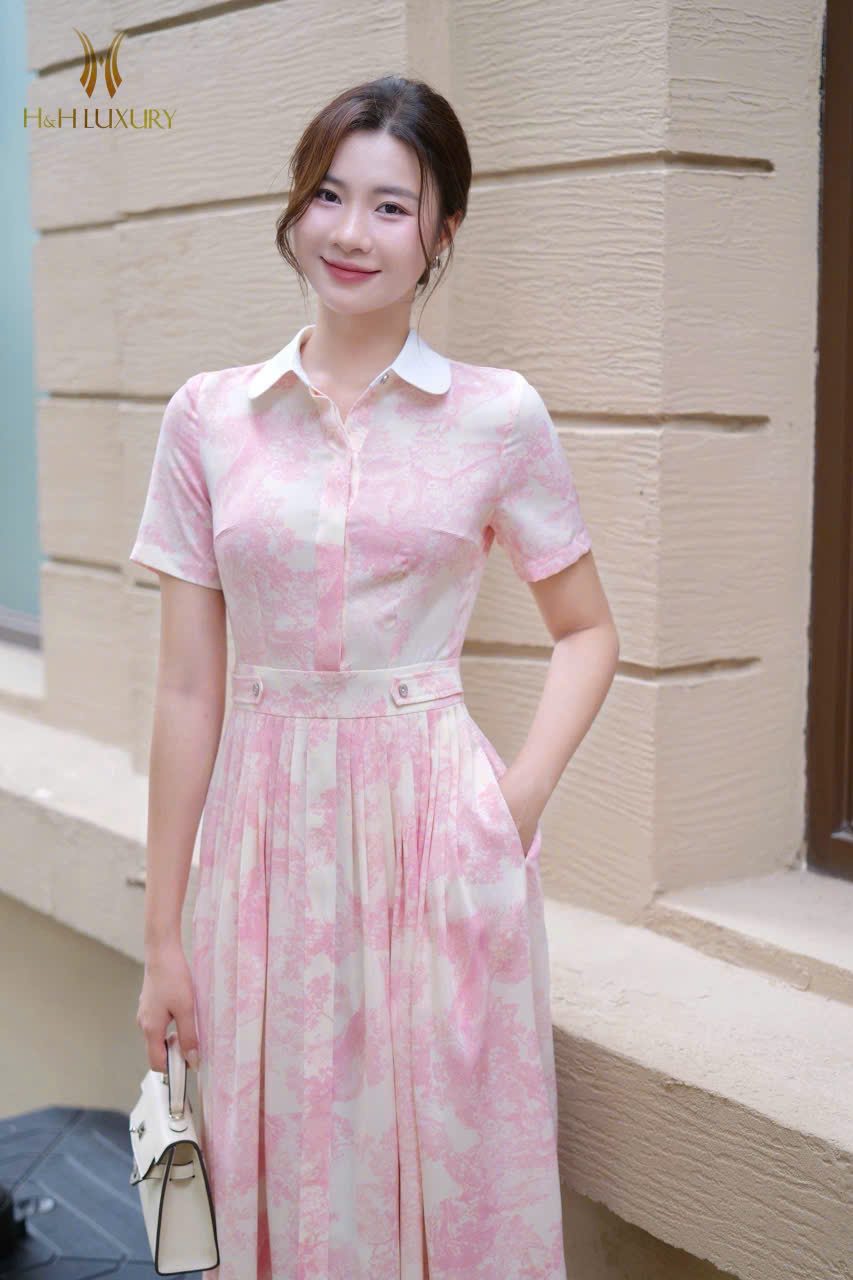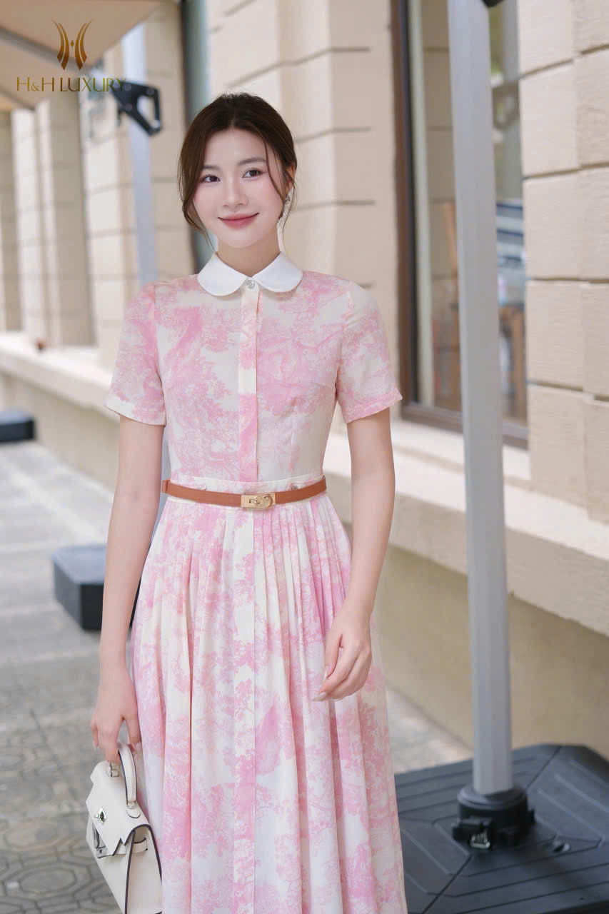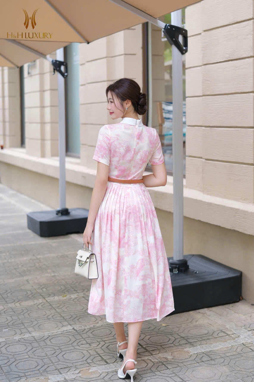 ĐẦM HỒNG XẾP LY ĐAI EO ĐÍNH CÚC