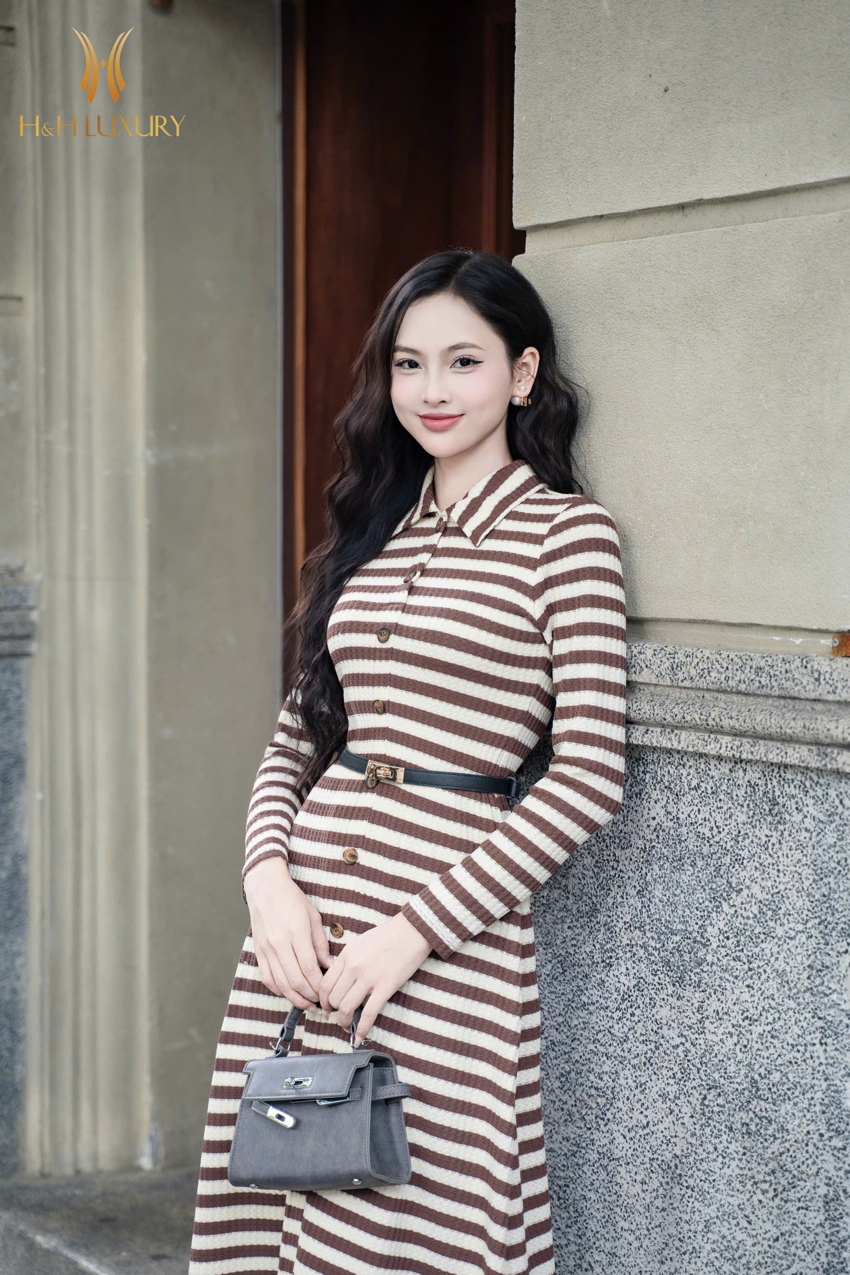 ĐẦM LEN KẺ NÂU TÂY ĐÍNH CÚC
