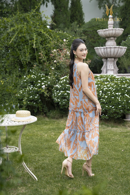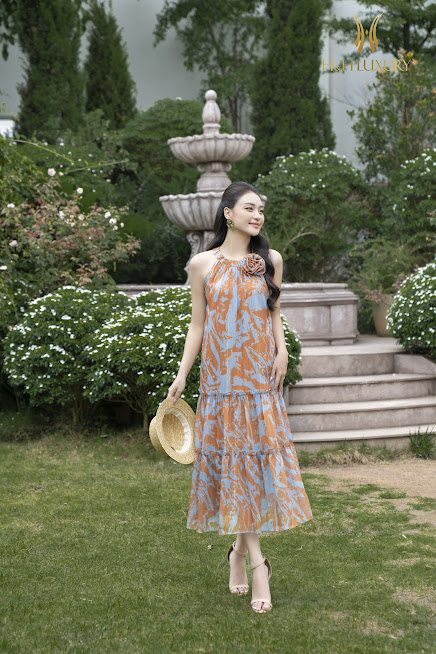 ĐẦM MAXI CỔ YẾM TƠ HÀN CAO CẤP ĐÍNH HOA NGỰC