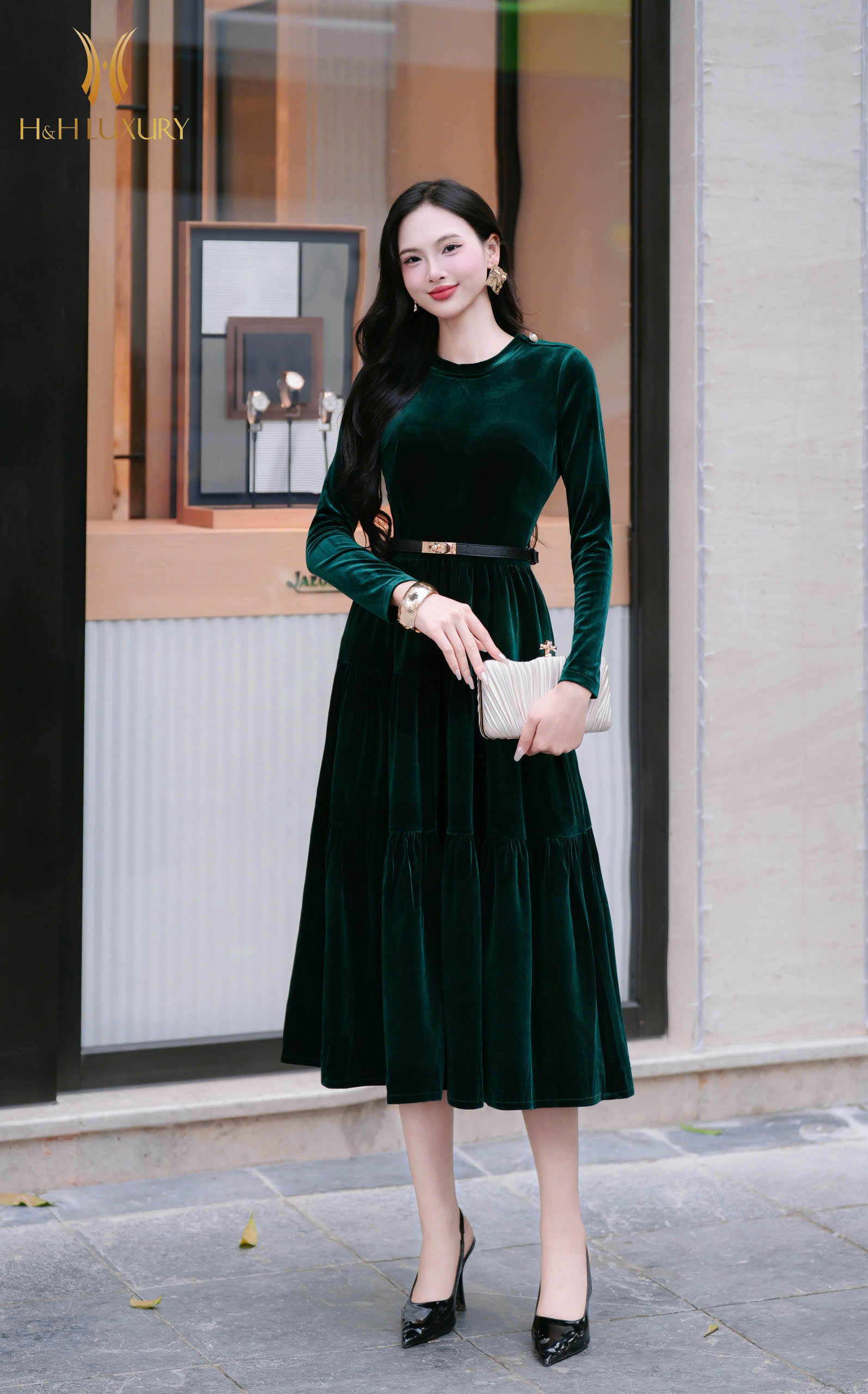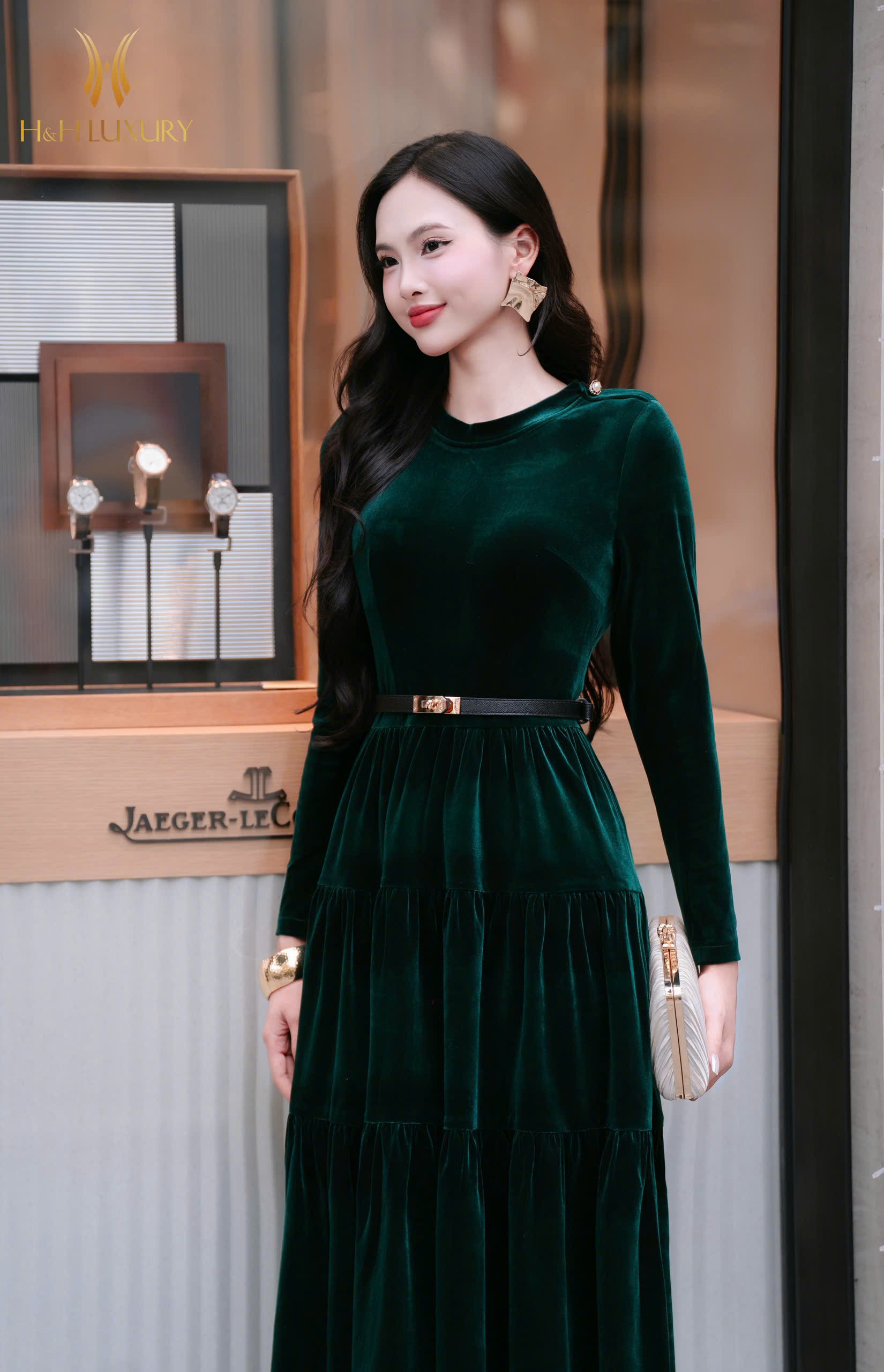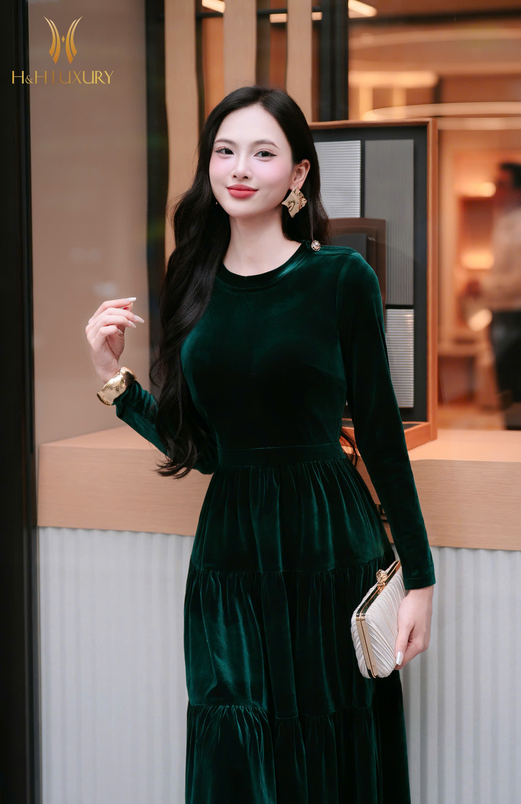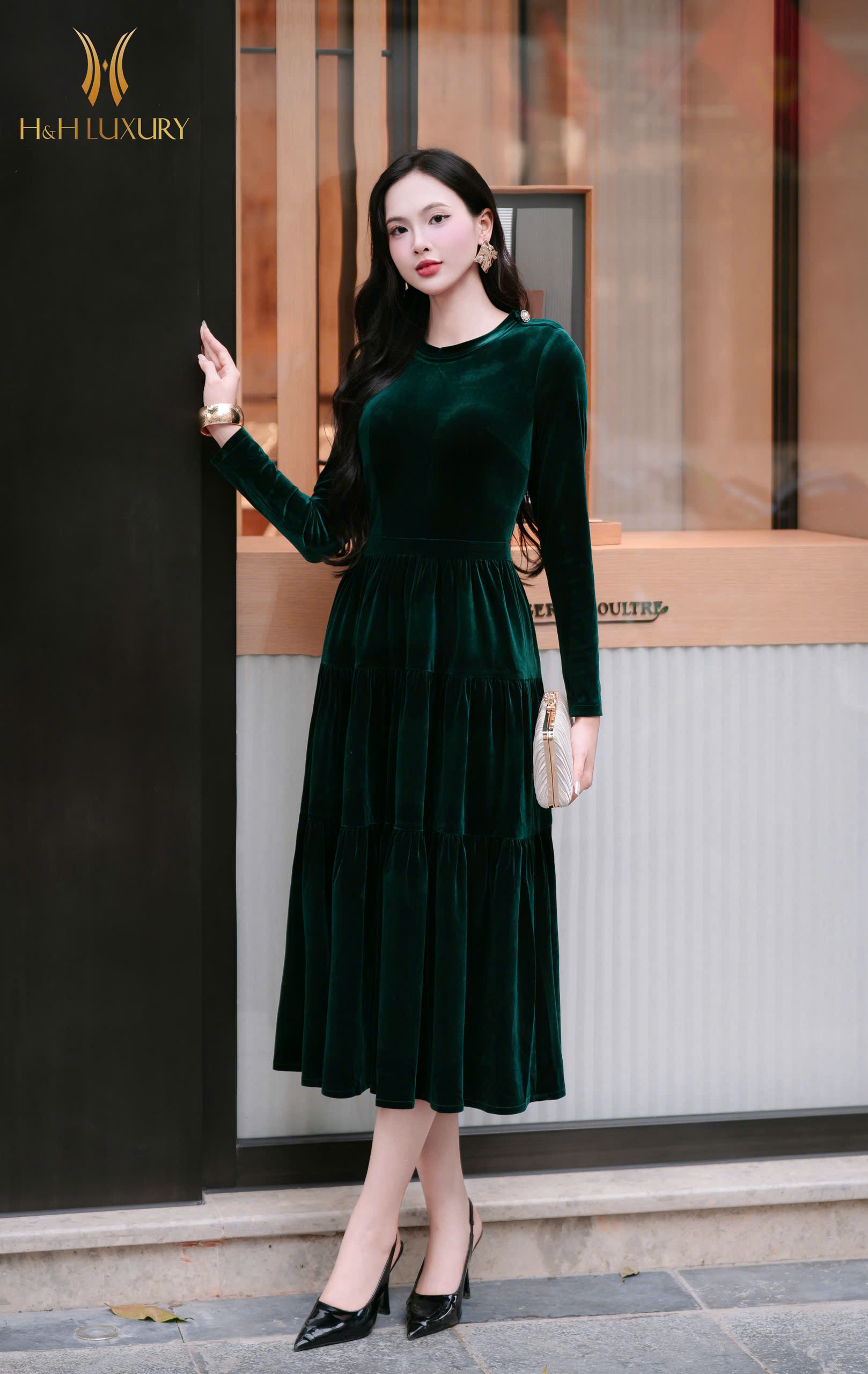 ĐẦM NHUNG XANH CỔ VỊT NHÚN 3 TẦNG