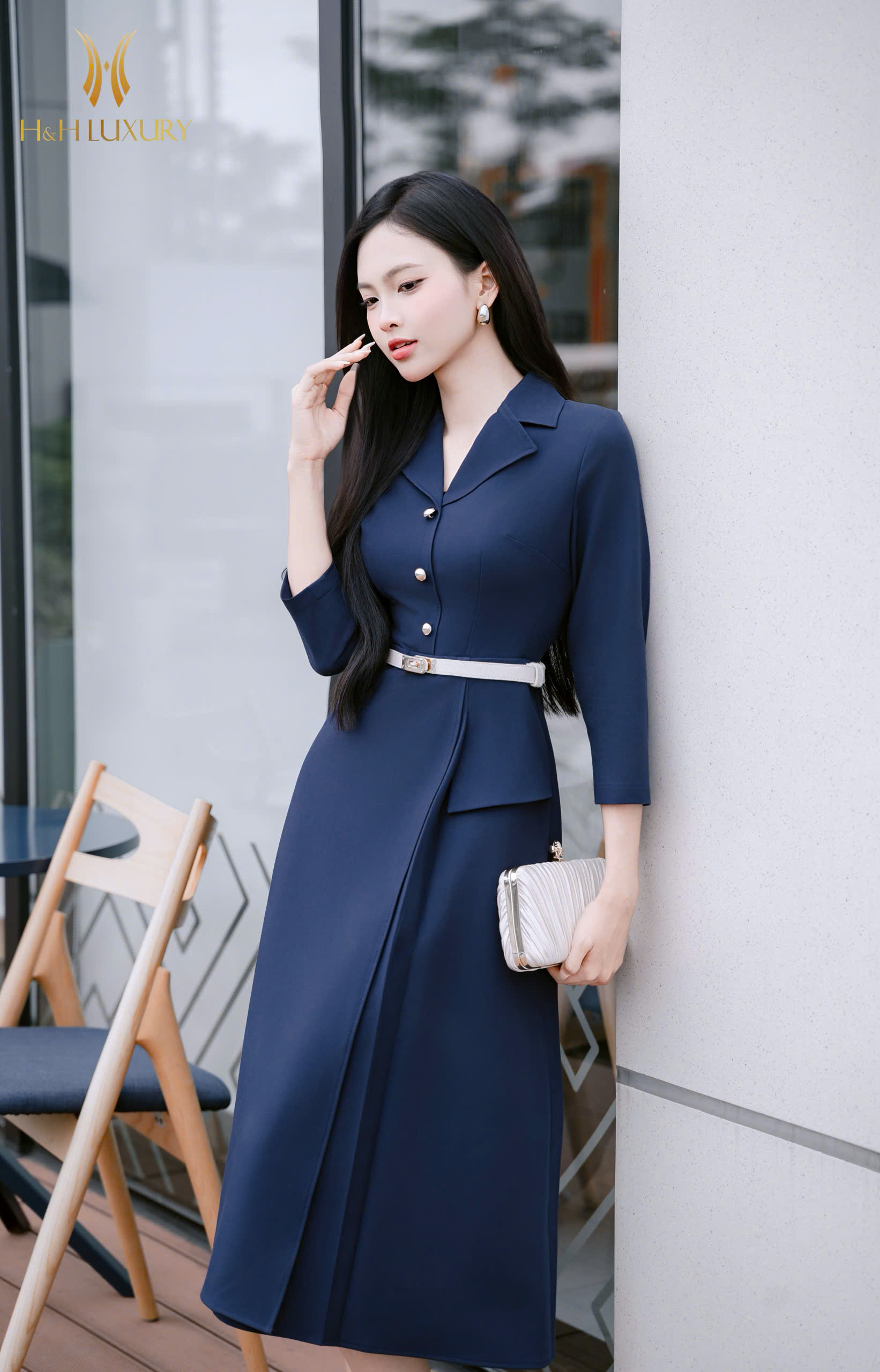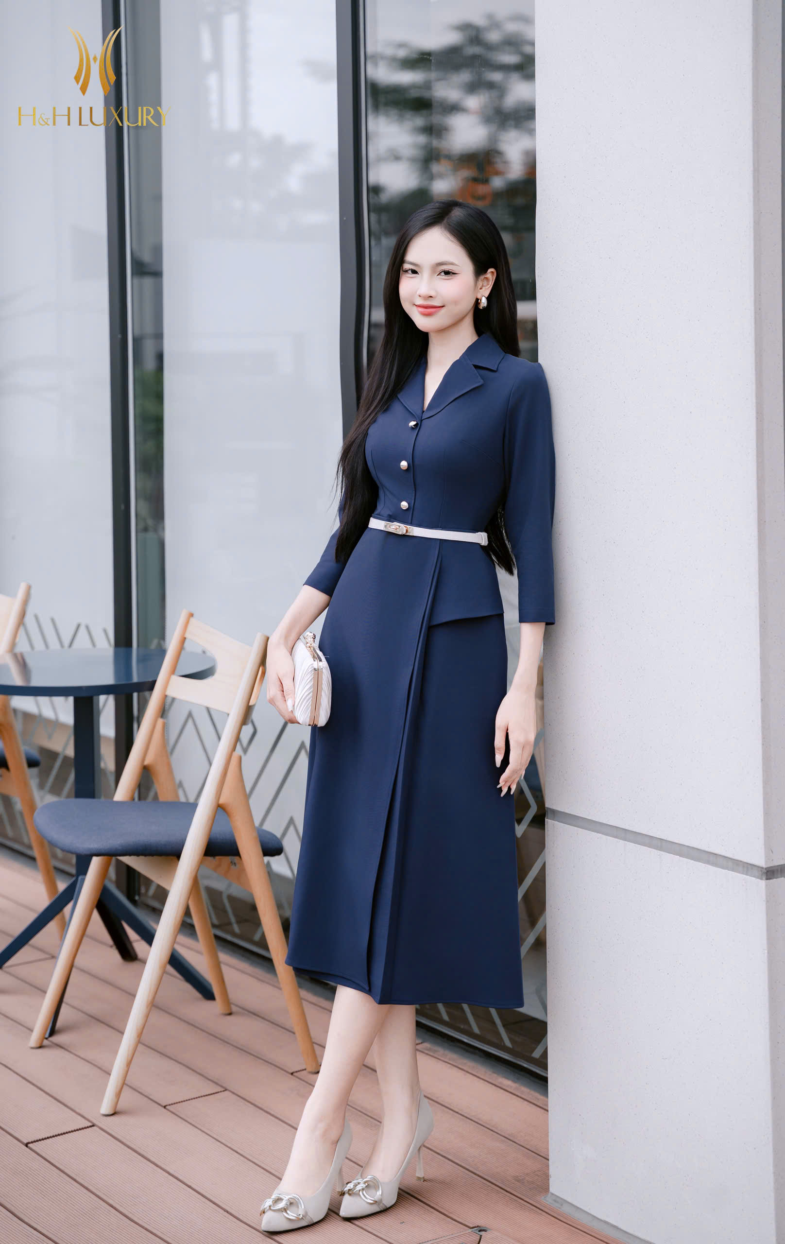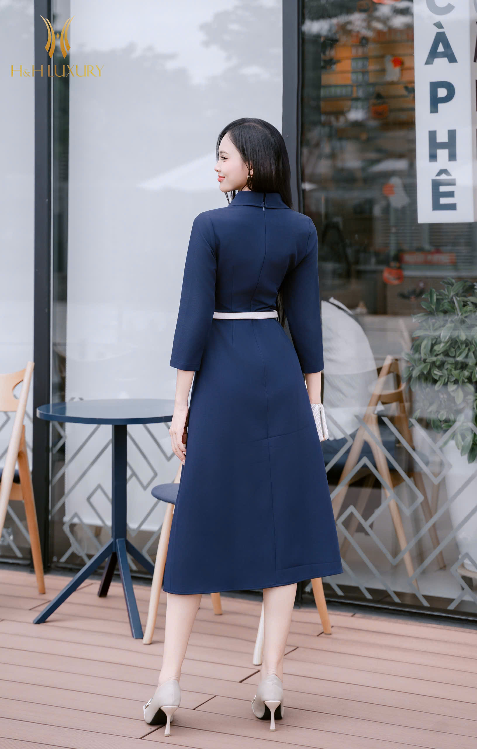 ĐẦM XANH NAVY CỔ VÉC XẾP LY