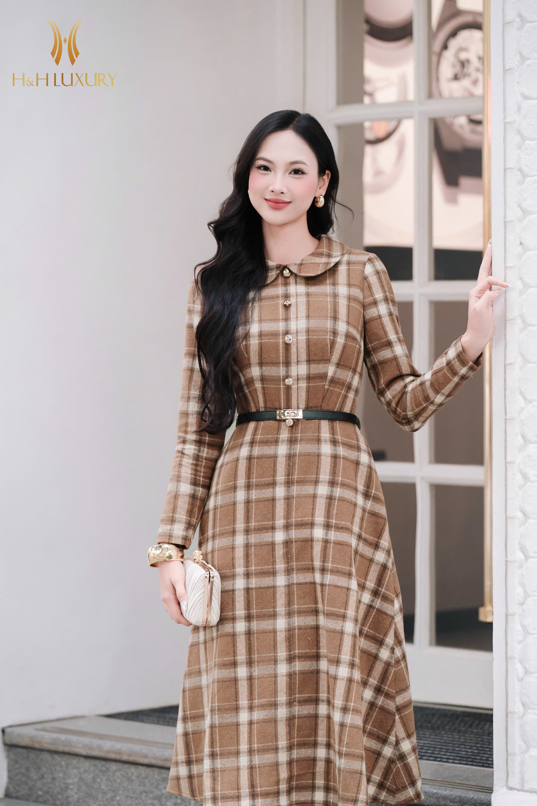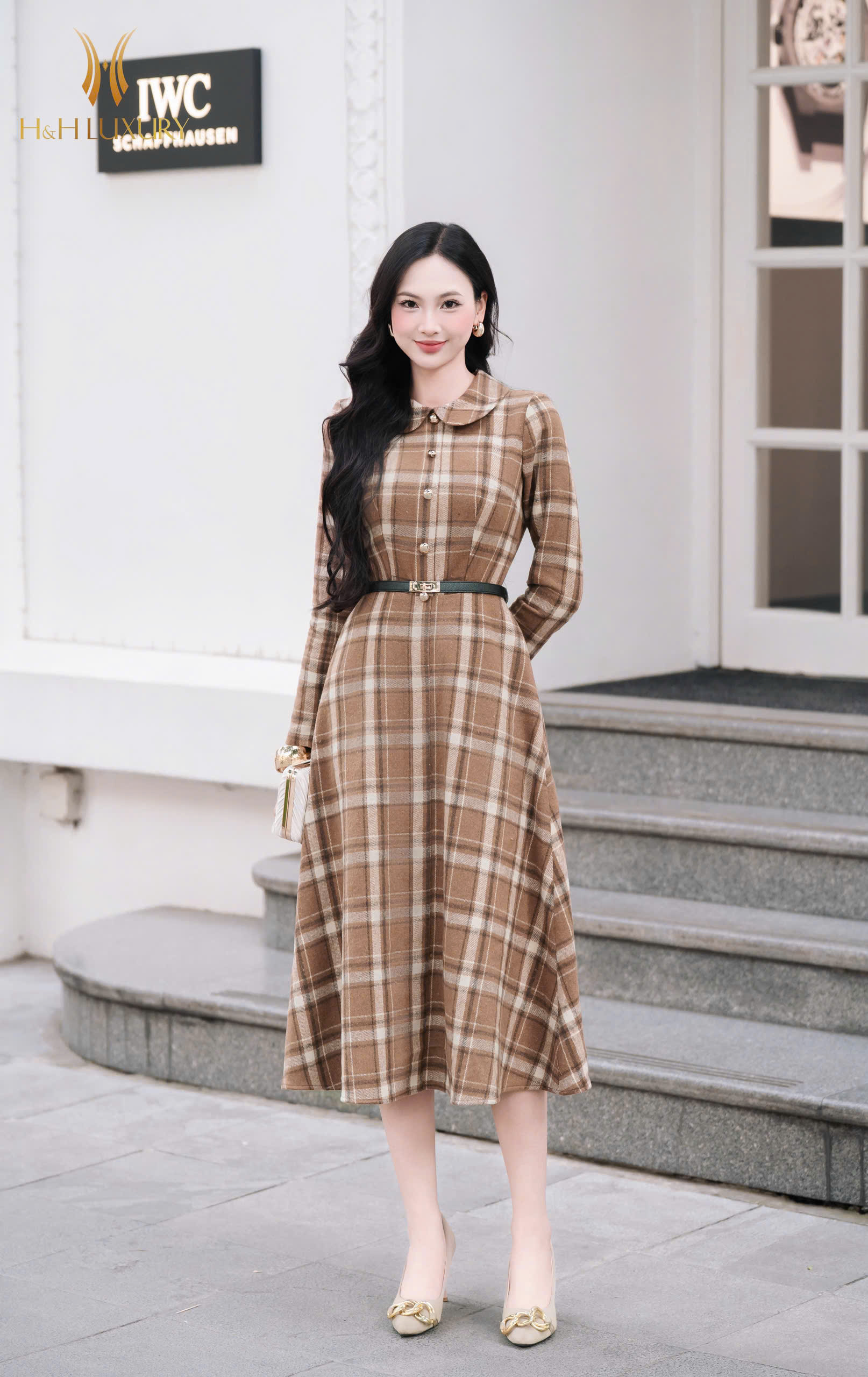 ĐẦM XÒE DẠ KẺ NÂU TÂY 2 TÚI CỔ SEN