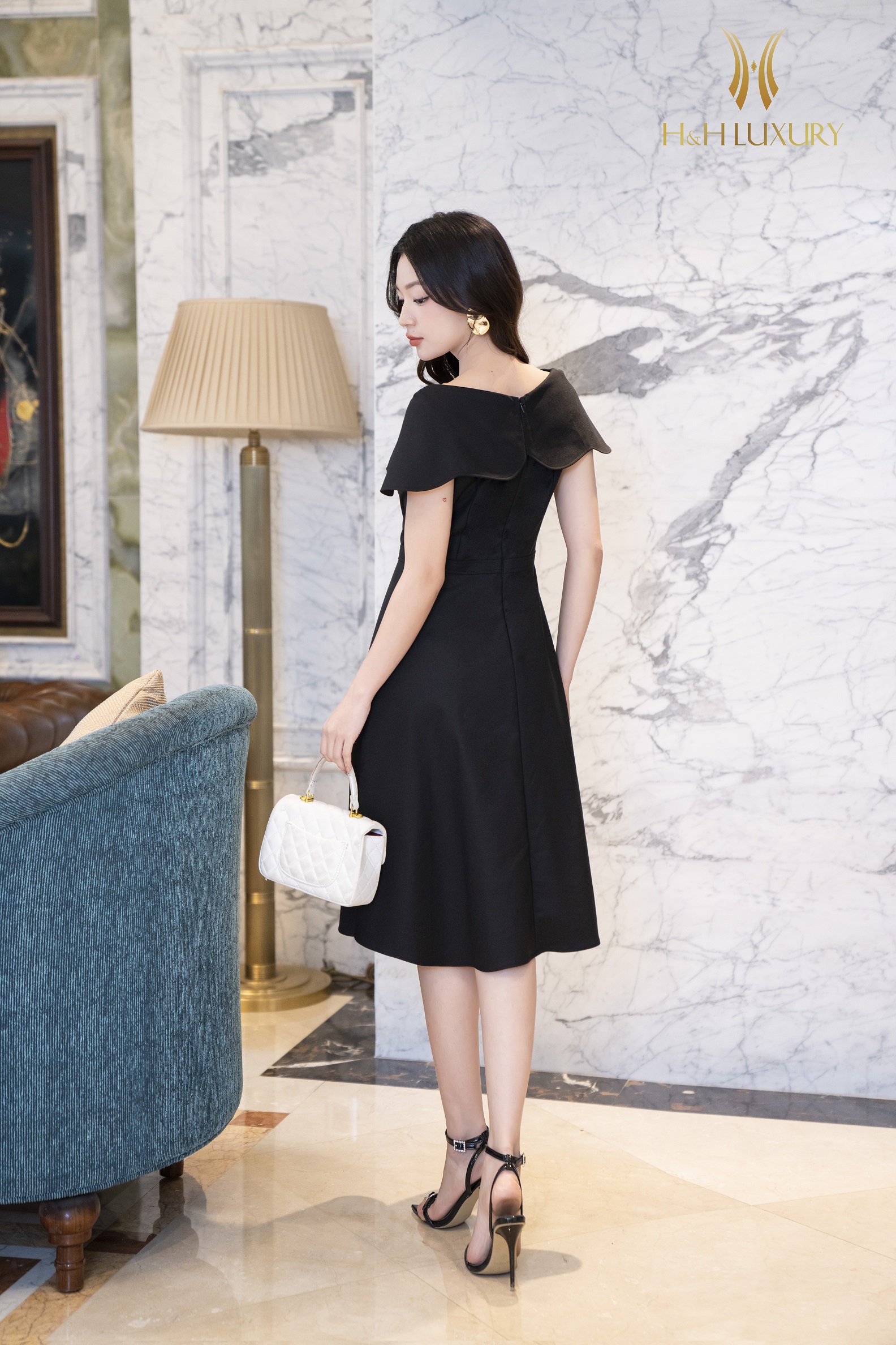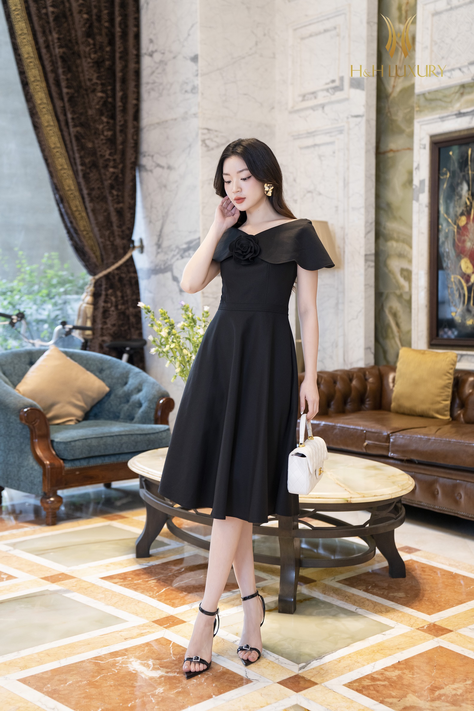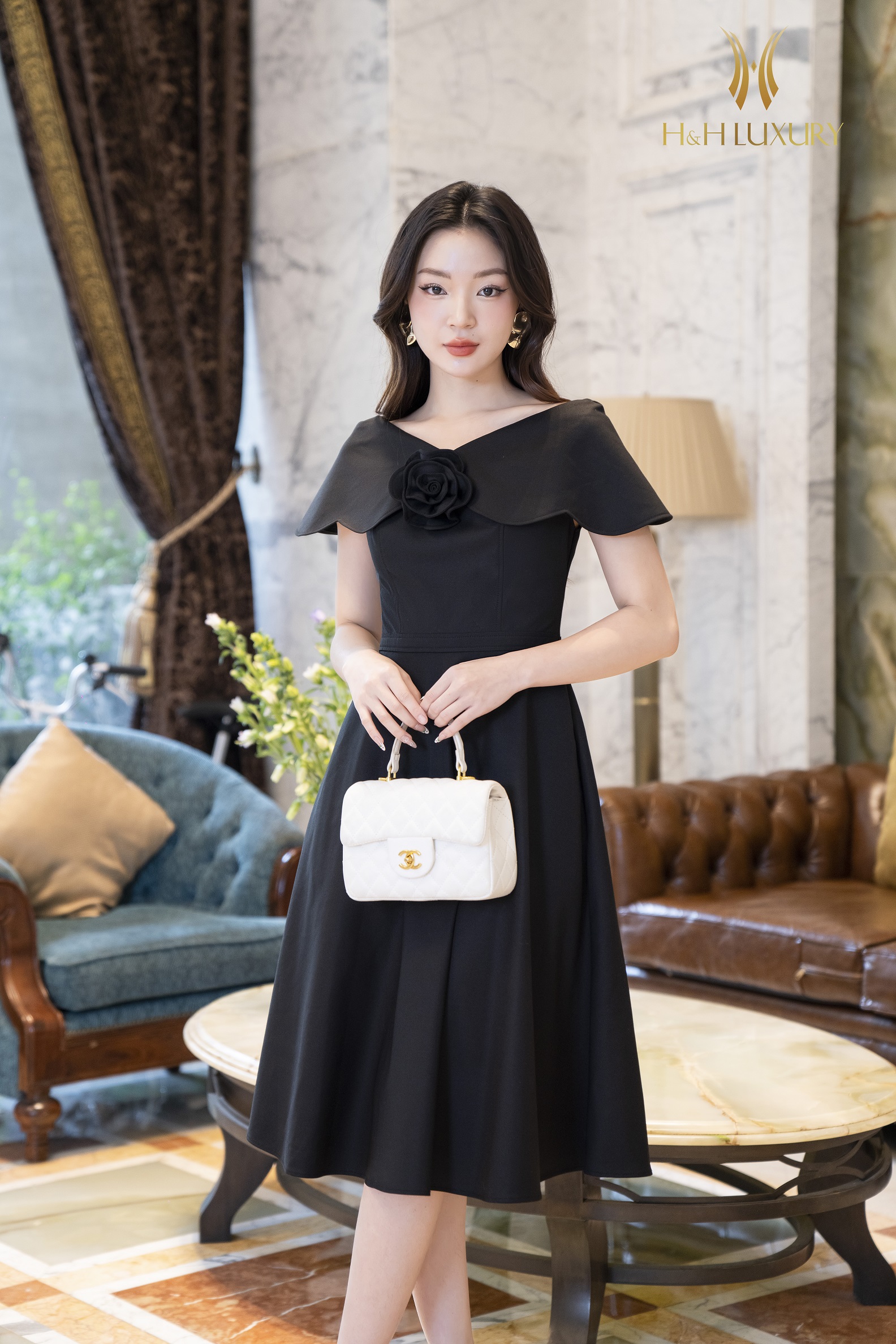 ĐẦM XÒE ĐEN CỔ LƯỢN ĐÍNH HOA