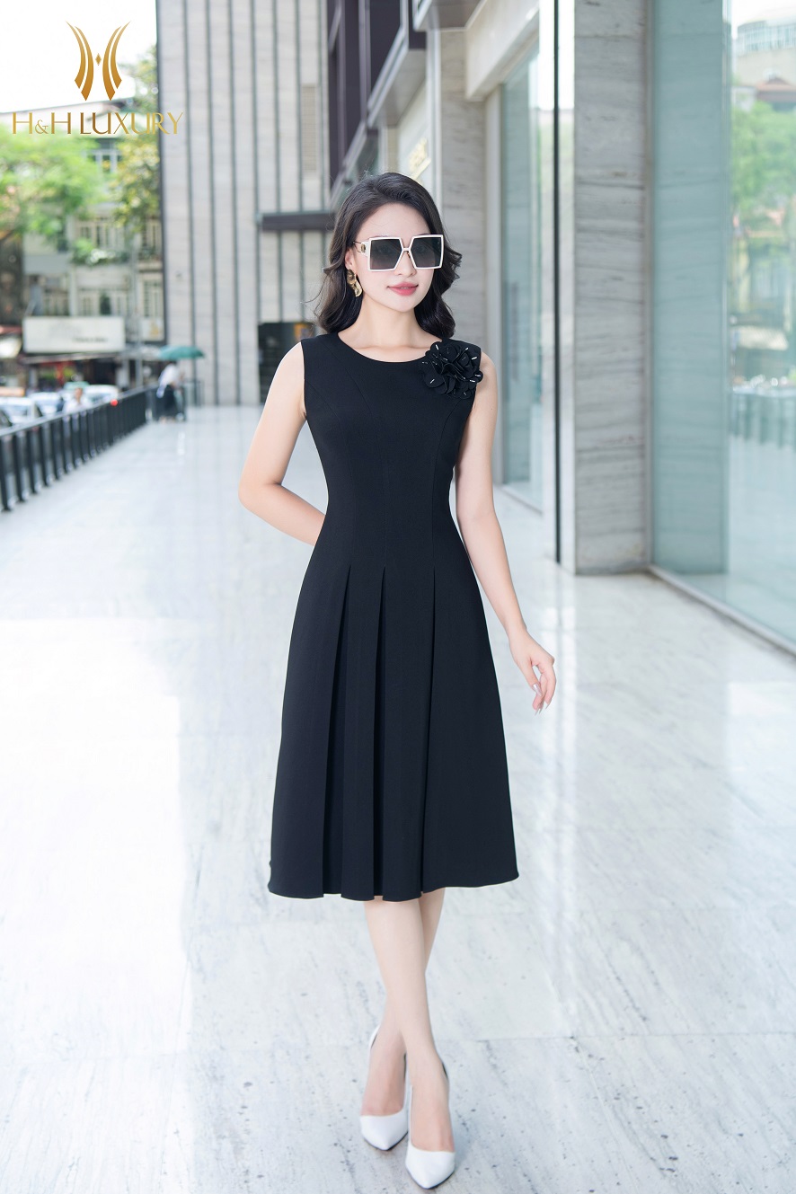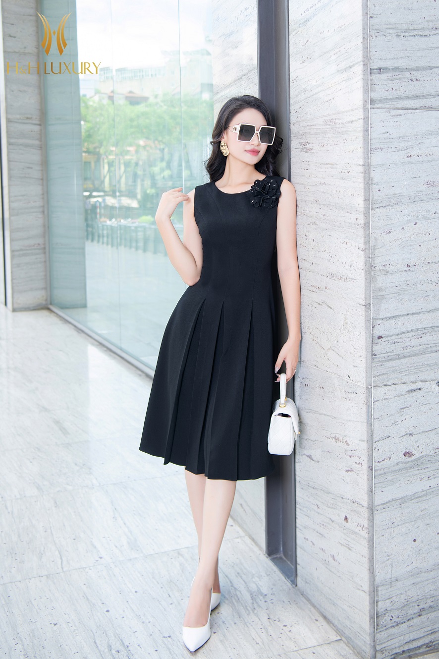 ĐẦM XÒE ĐEN SÁT NÁCH ĐÍNH HOA 3D