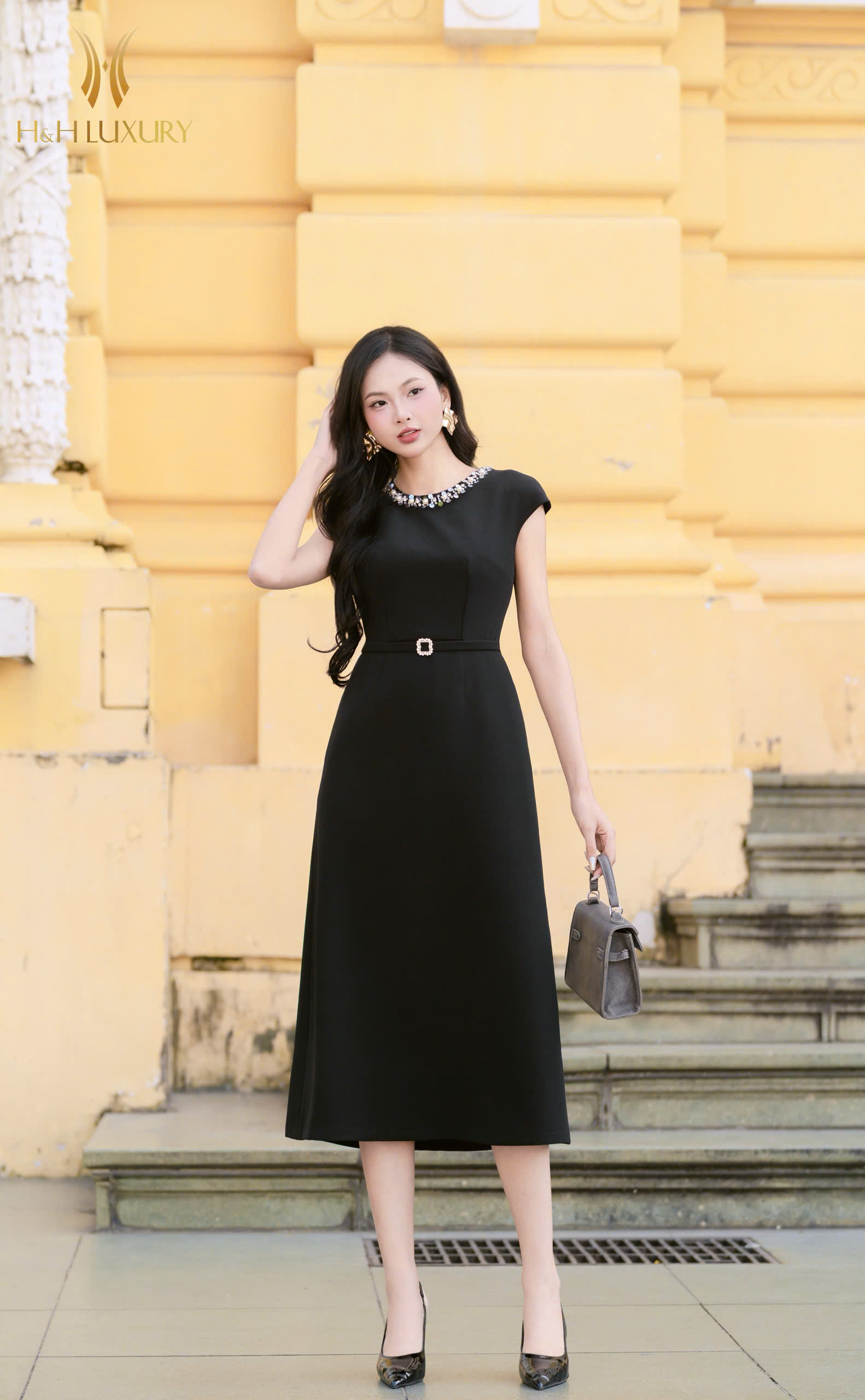ĐẦM XÒE ĐEN VAI CHỜM ĐÍNH CỔ