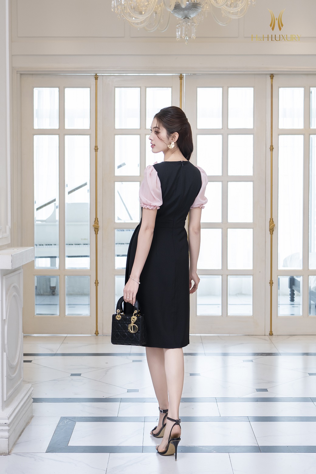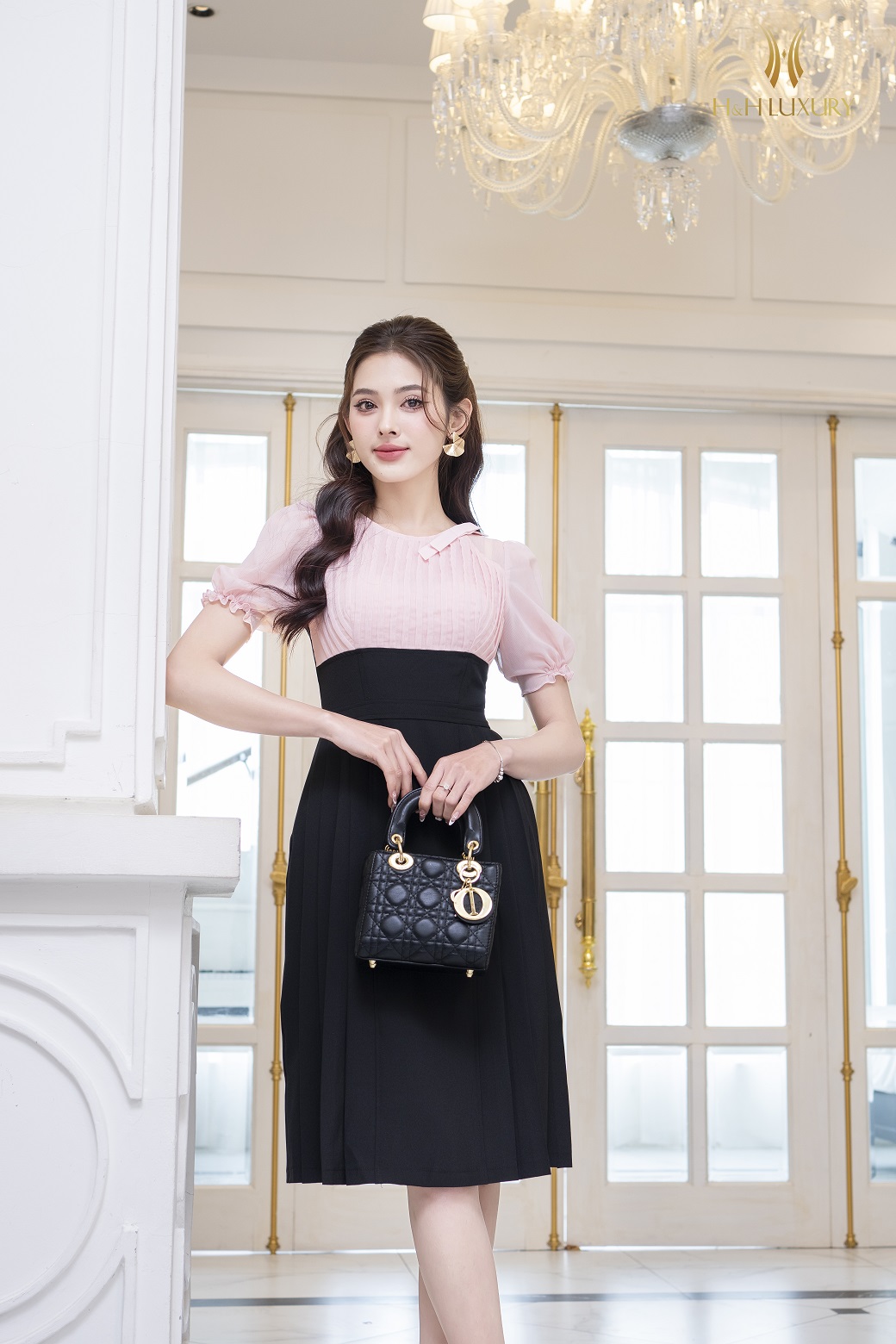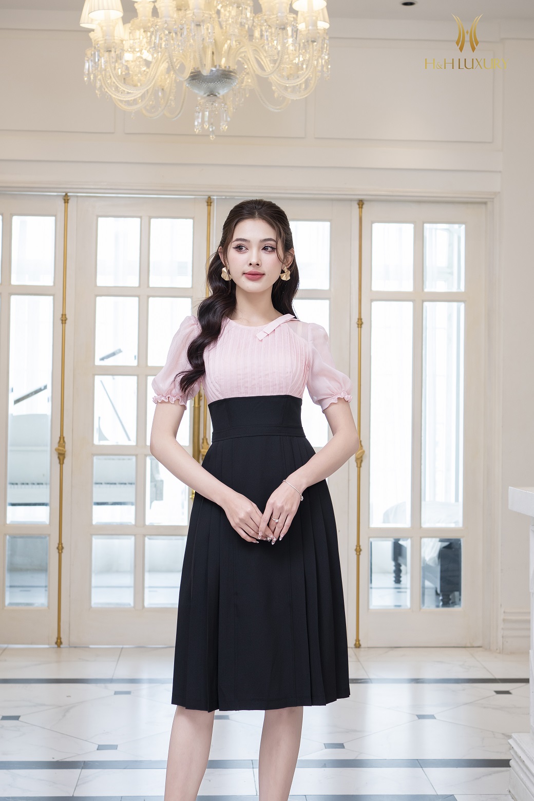 Đầm xòe đen xếp li phối tơ hồng nơ cổ