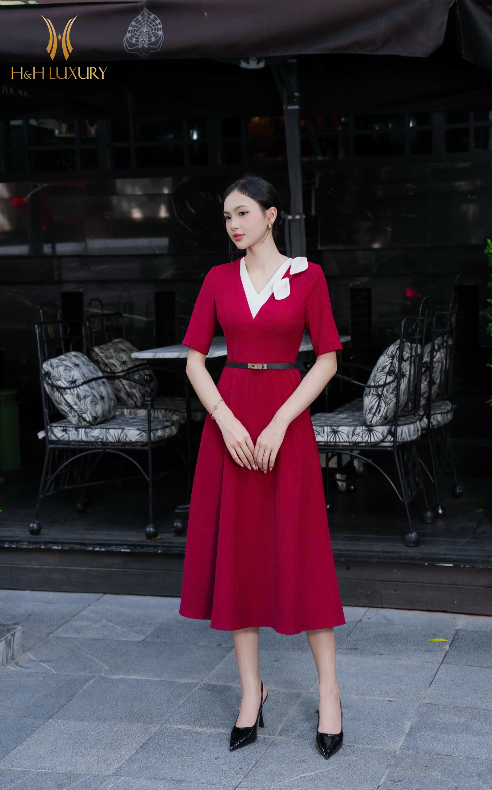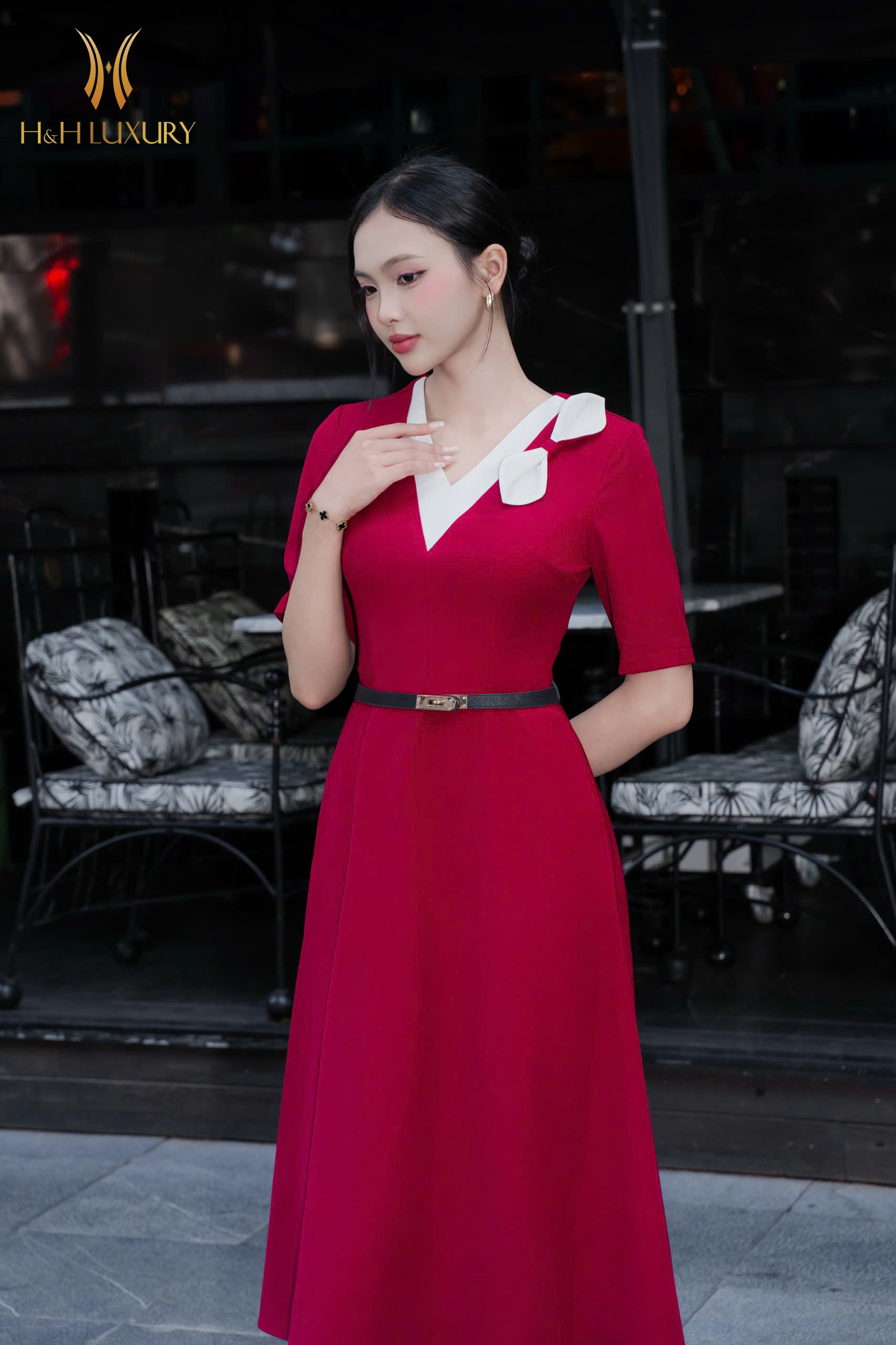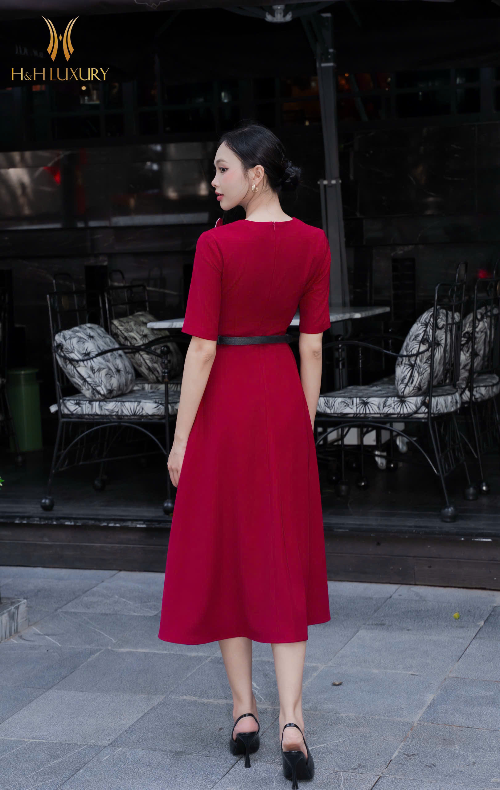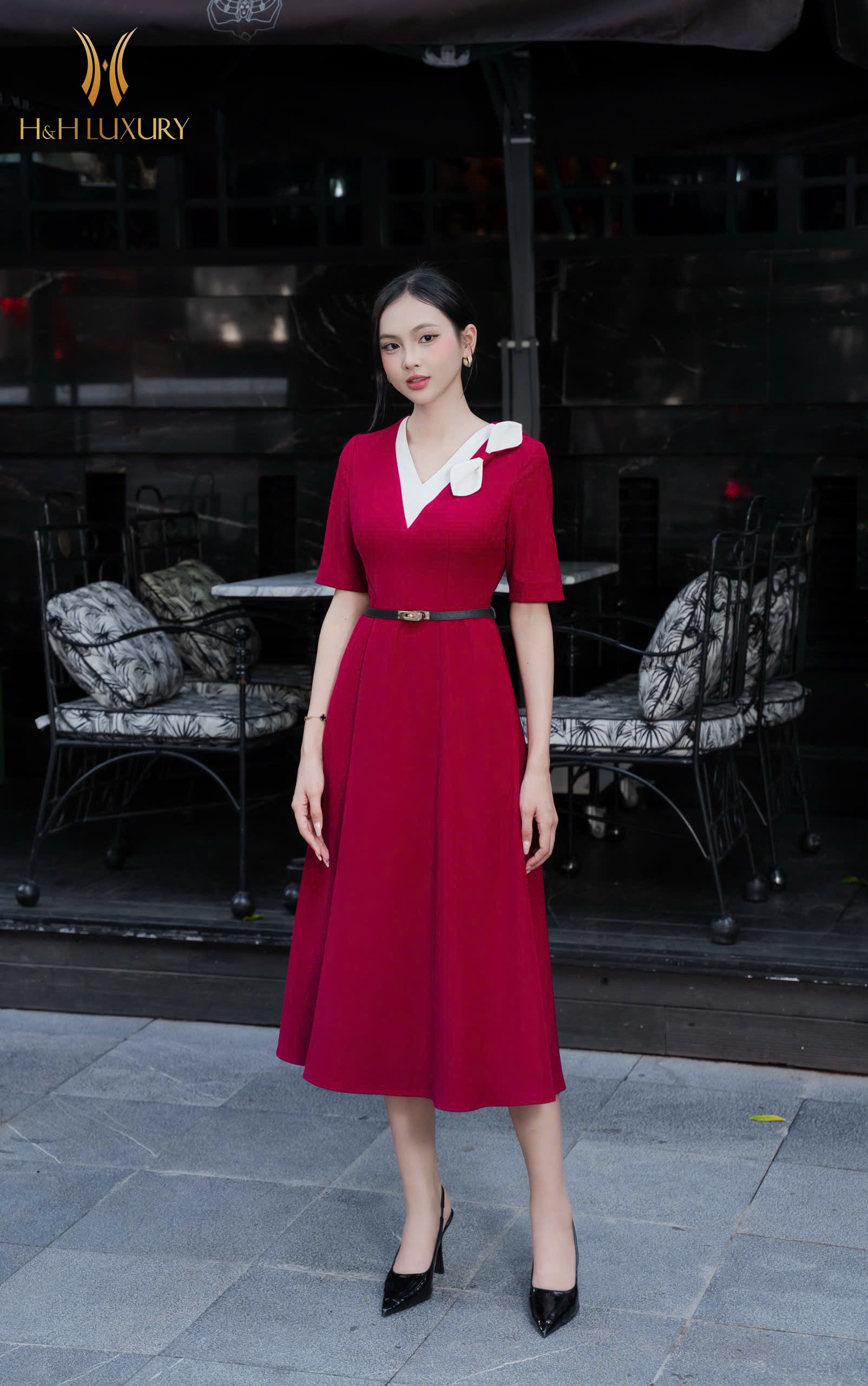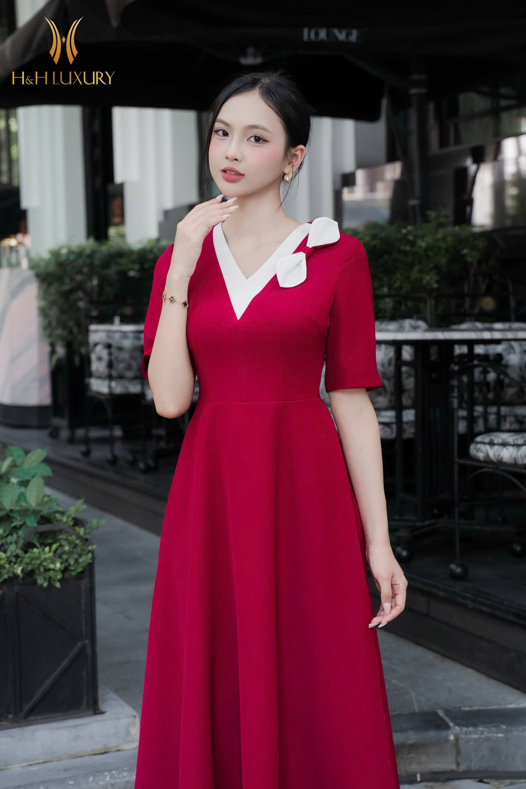 ĐẦM XÒE ĐỎ CỔ V ĐÍNH NƠ