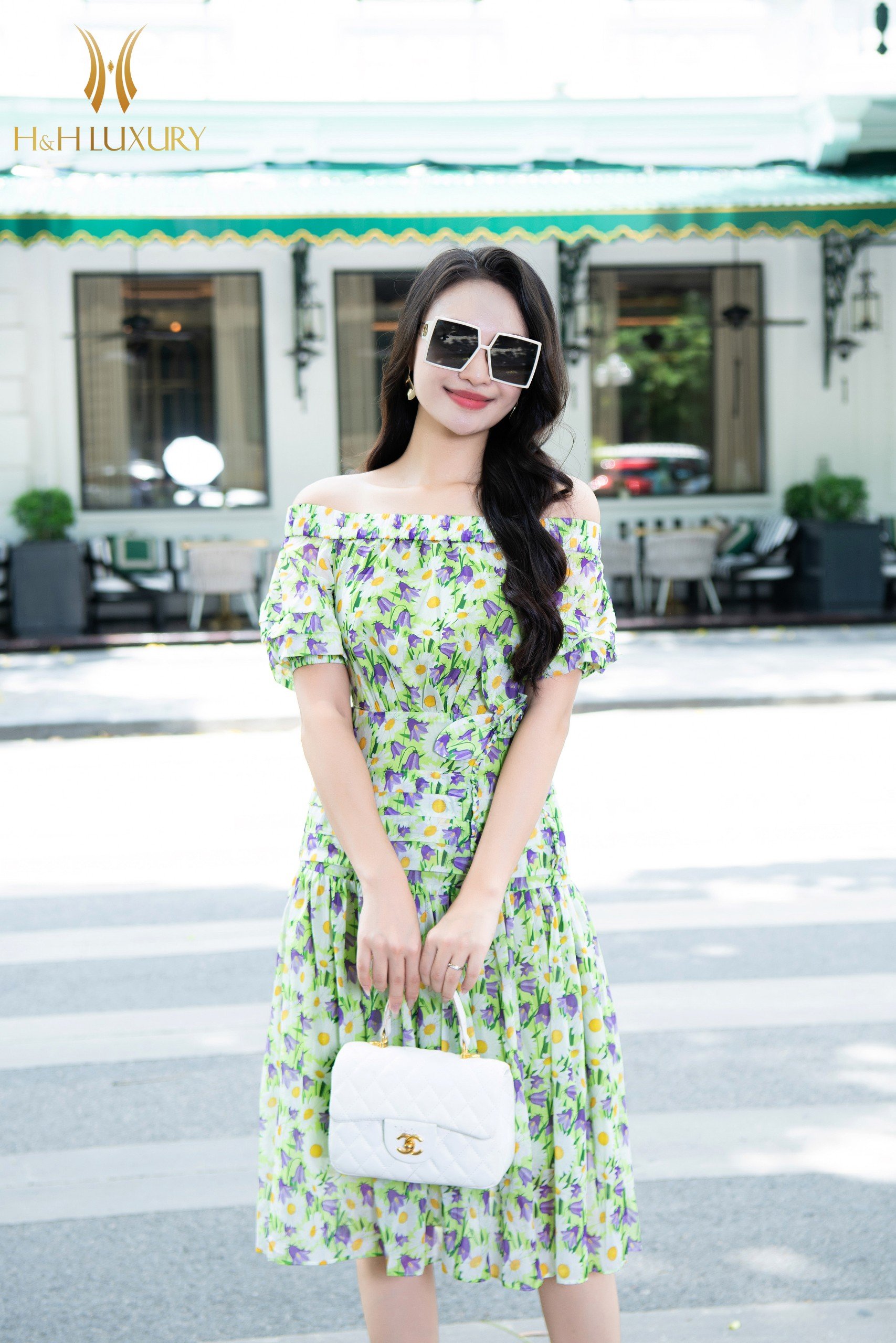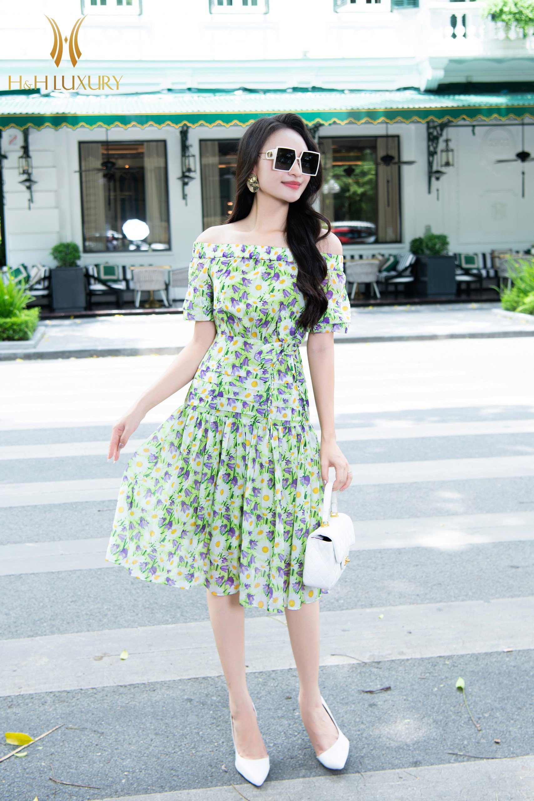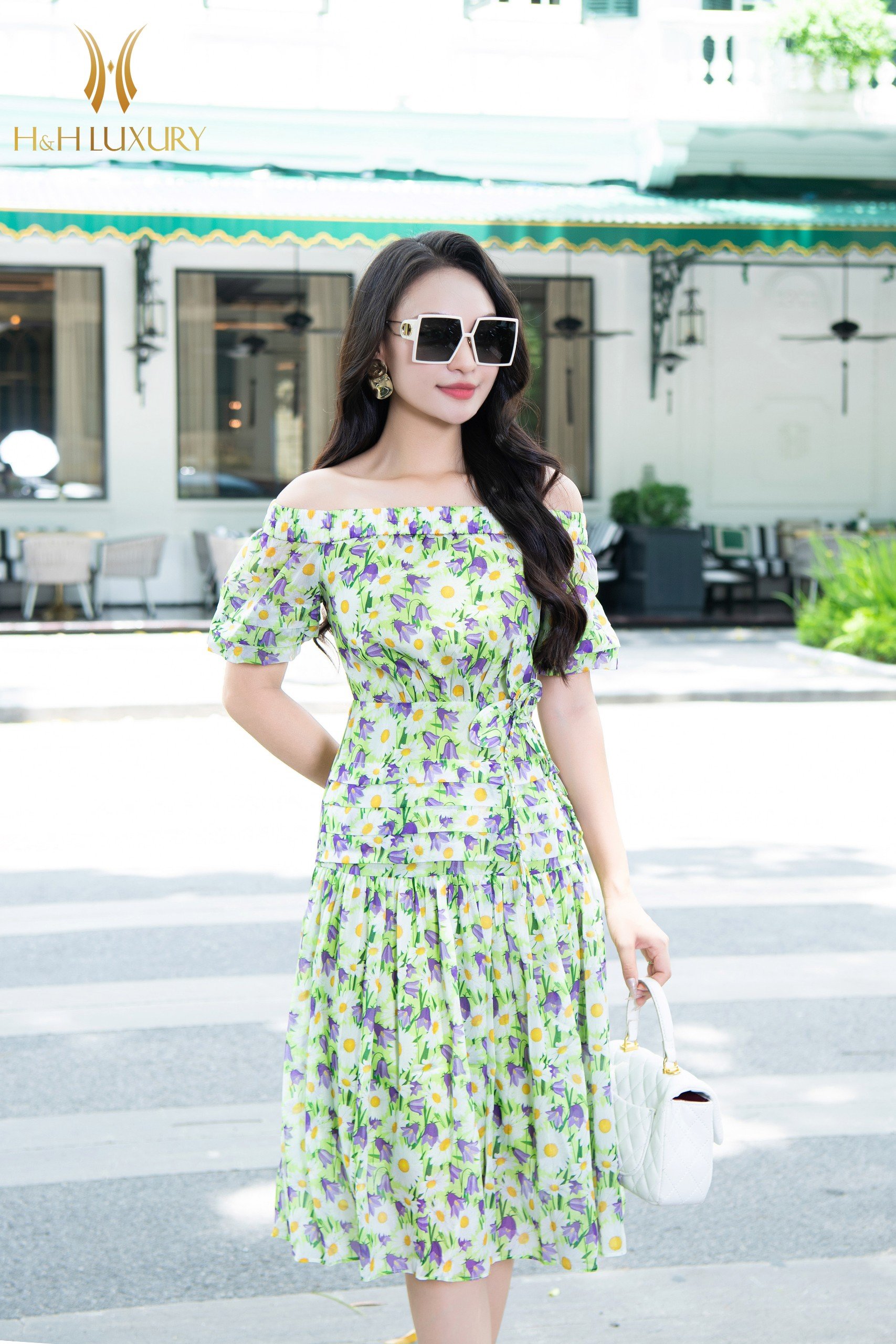 👗Những bông cúc trắng tinh khôi🌻 nổi bật giữa rừng lá xanh🌿, điểm tô sắc tím hoa chuông 💜 đem đến cho người mặc một bức tranh thu lãng mạn🌹, nhẹ nhàng mà vô cùng sống động, rực rỡ💥. Dáng xòe phối đai eo xếp tầng trên nền tơ mỏng 💨 khéo léo tôn lên vòng 2 thon gọn😍 đồng thời tạo sự bồng bềnh, bay bổng💃 thật giao hòa với không khí man mát của đất trời khi bước vào mùa mới⛅. Đặc biệt, với thiết kế trễ vai khoe trọn bờ vai mềm gợi cảm😍, chiếc đầm còn giúp nàng ghi điểm quyến rũ, ngọt ngào❤️ cho ngày xuống phố cuối tuần🌴🌳