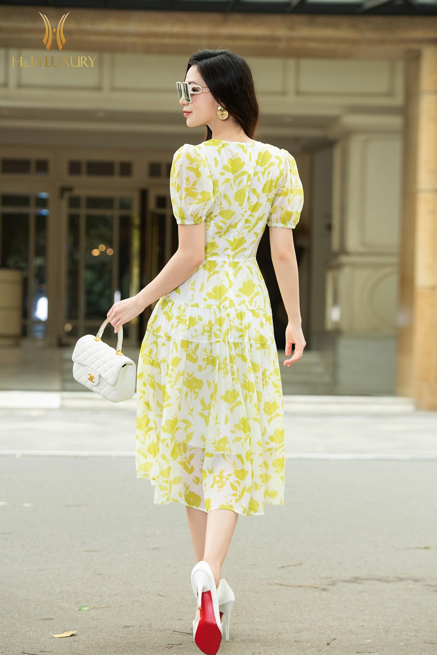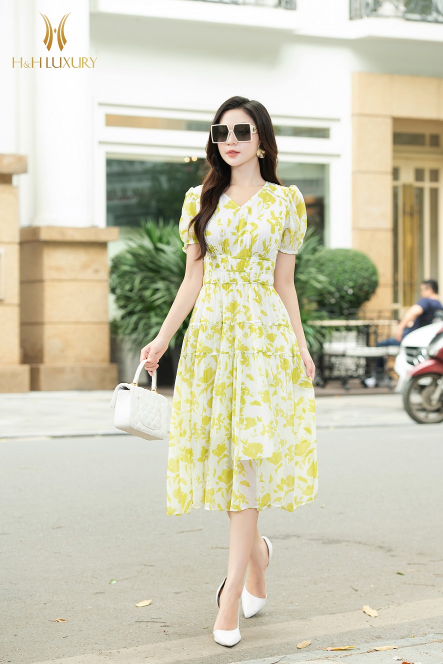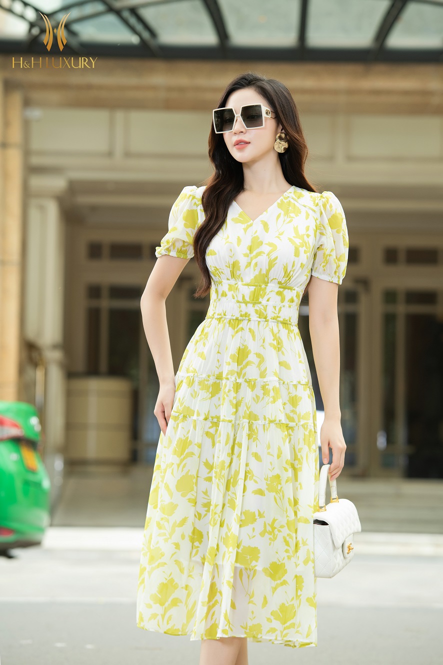 ĐẦM XÒE HOA VÀNG CHANH NHÚN EO