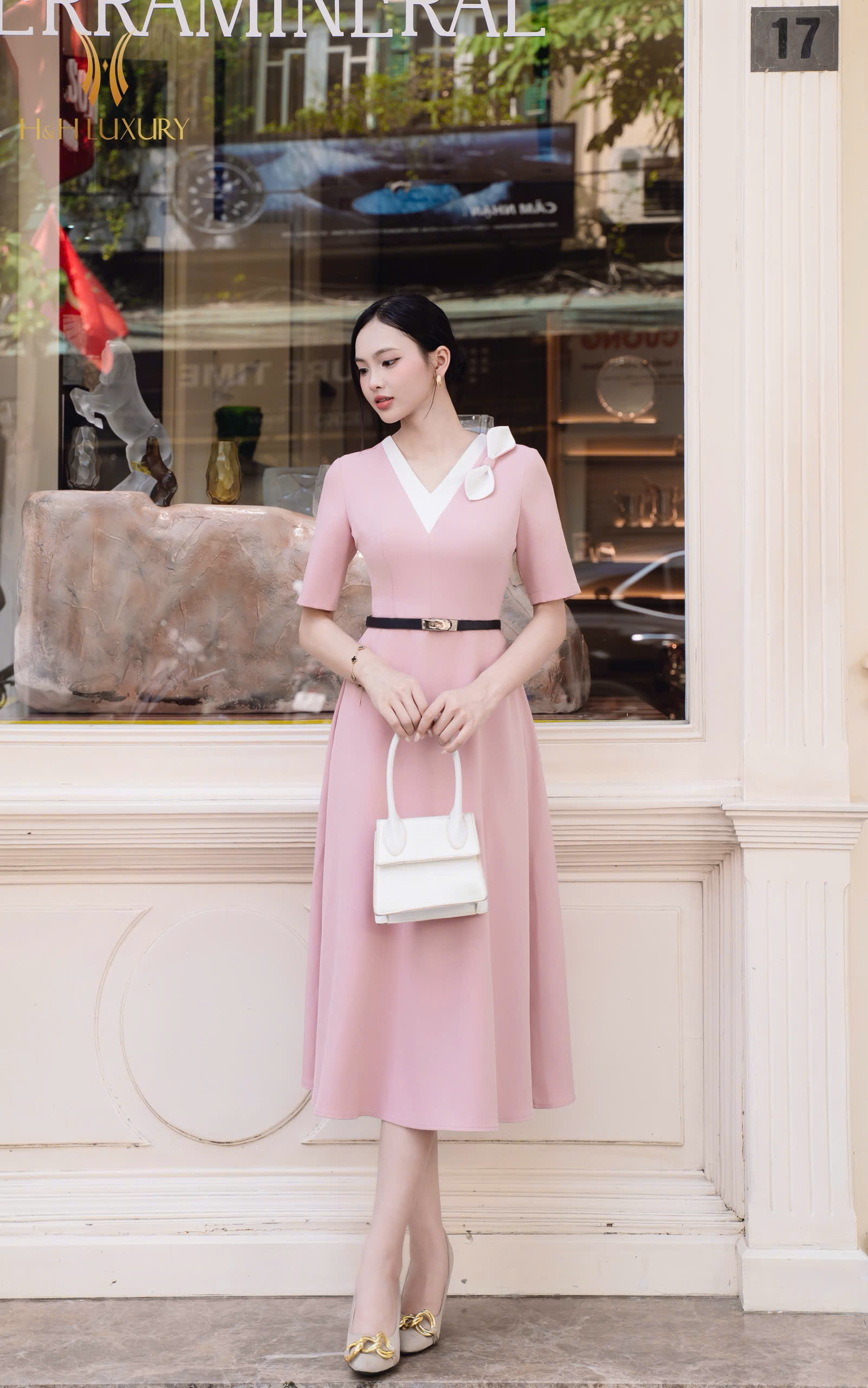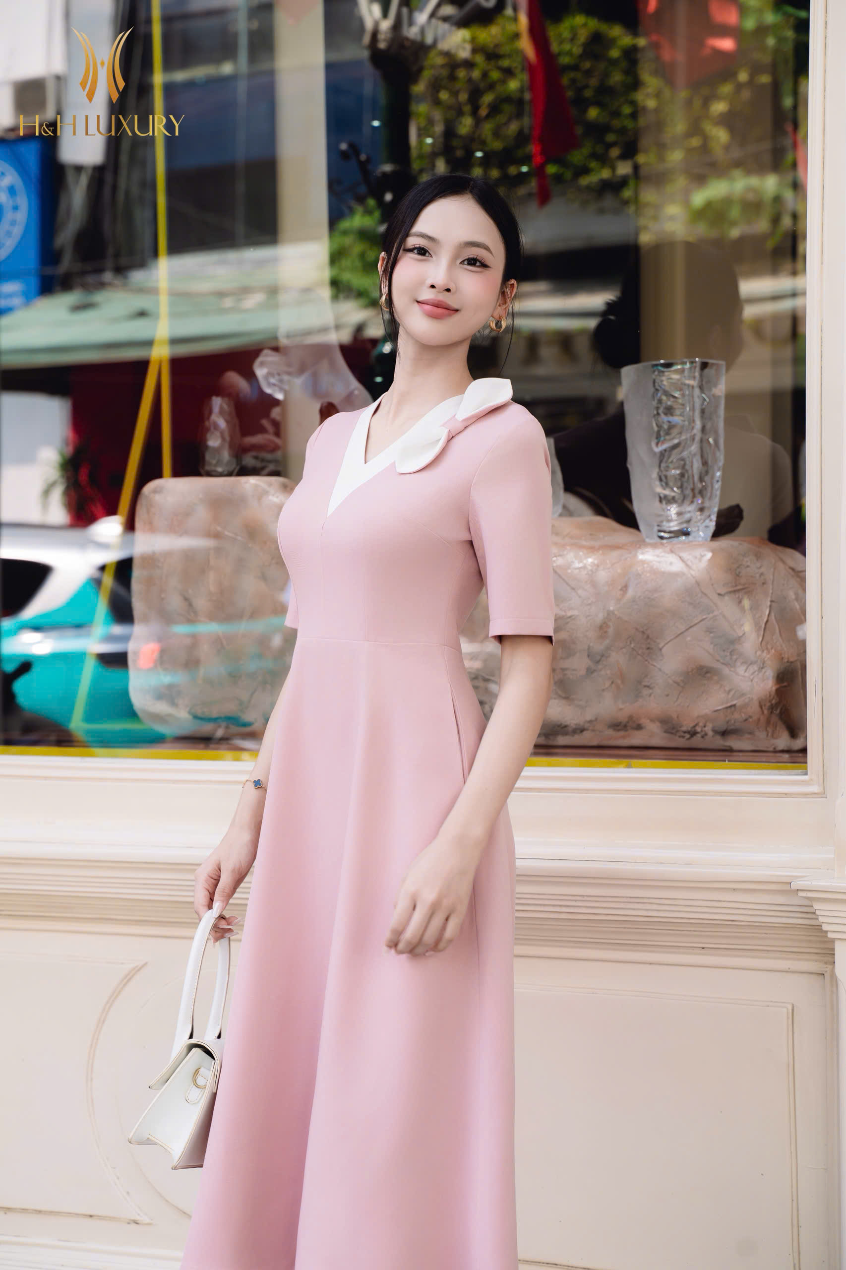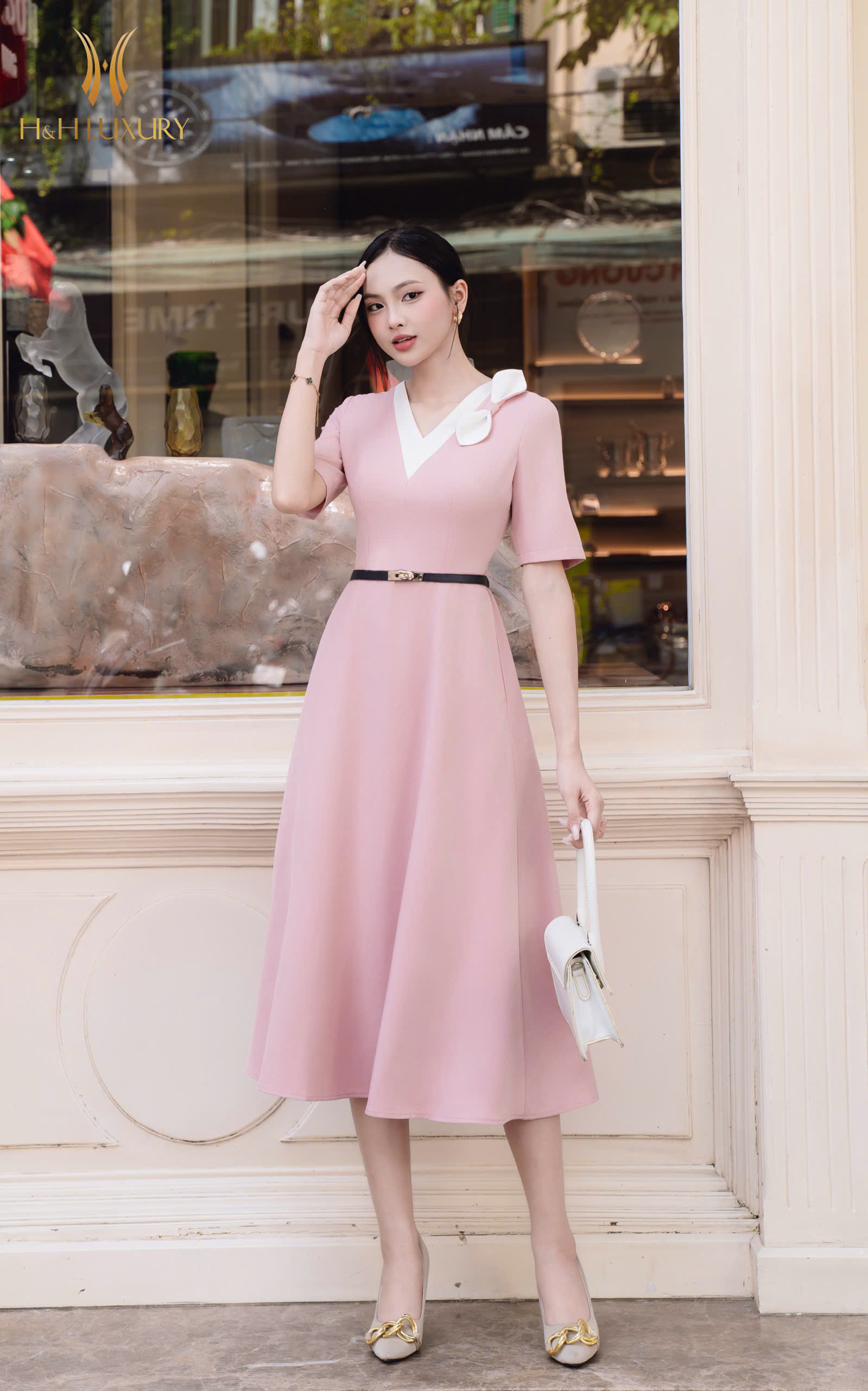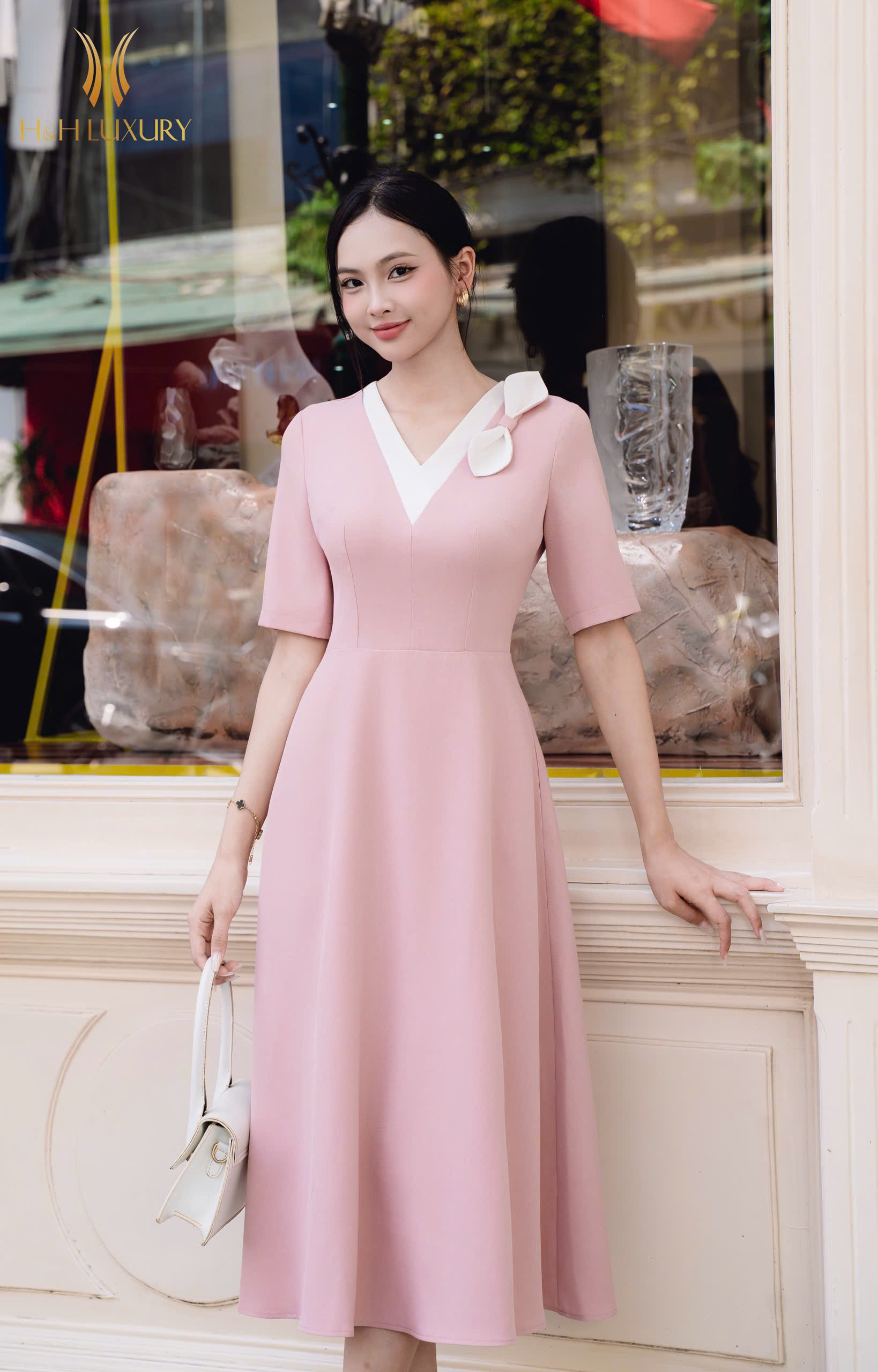 ĐẦM XÒE HỒNG CỔ V NƠ CỔ