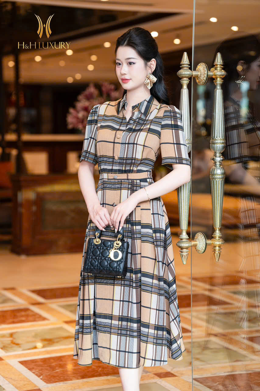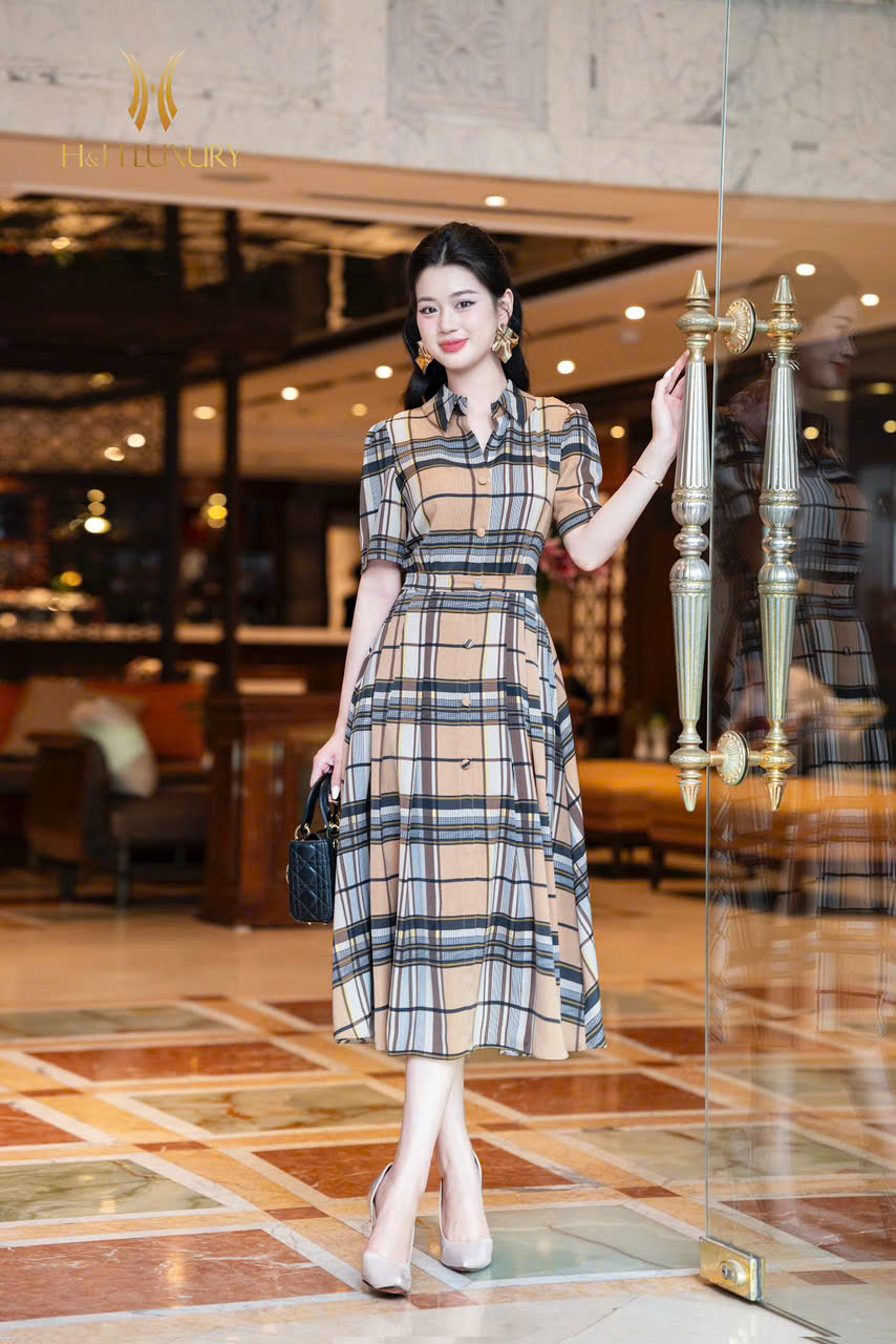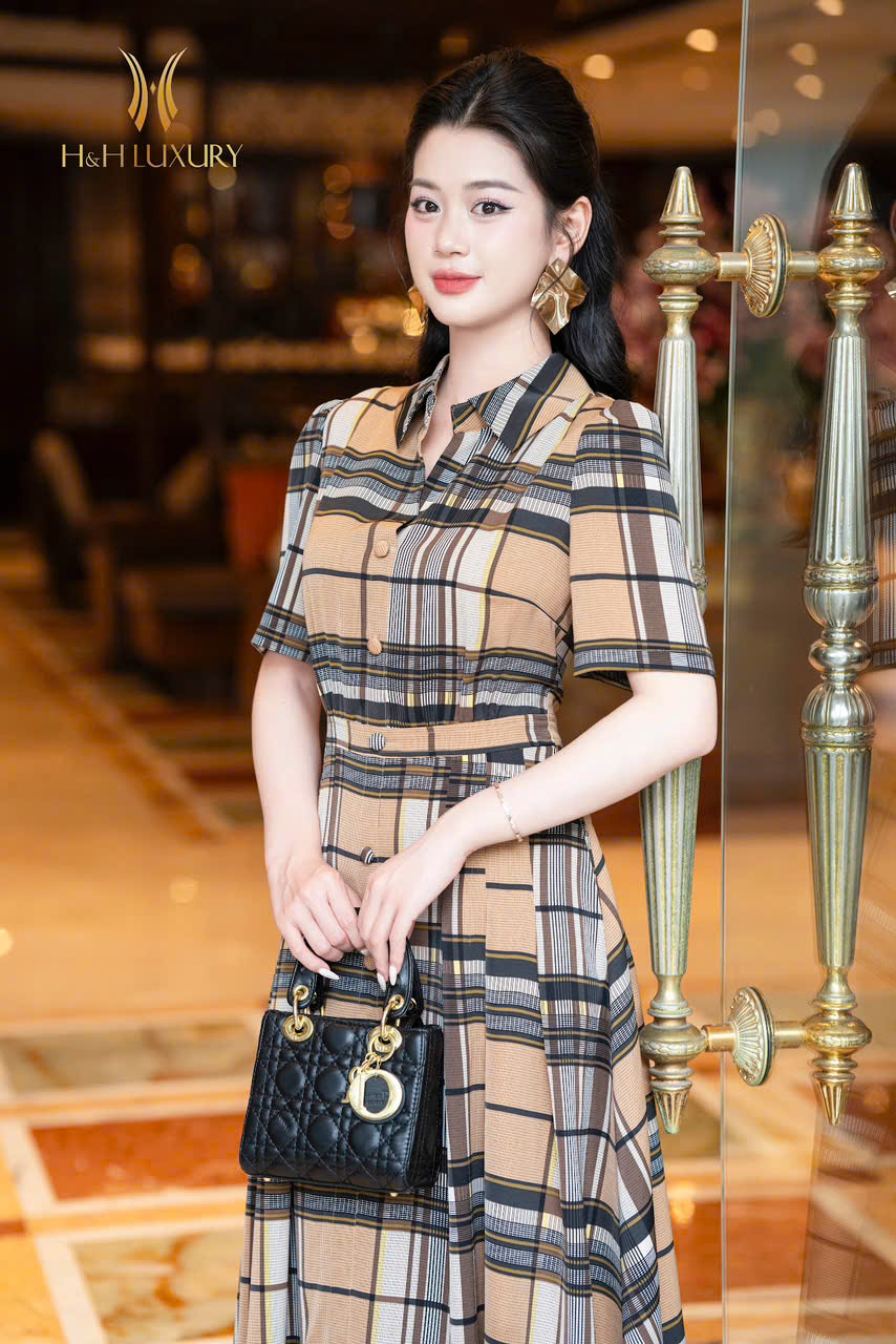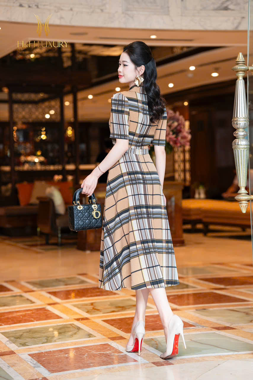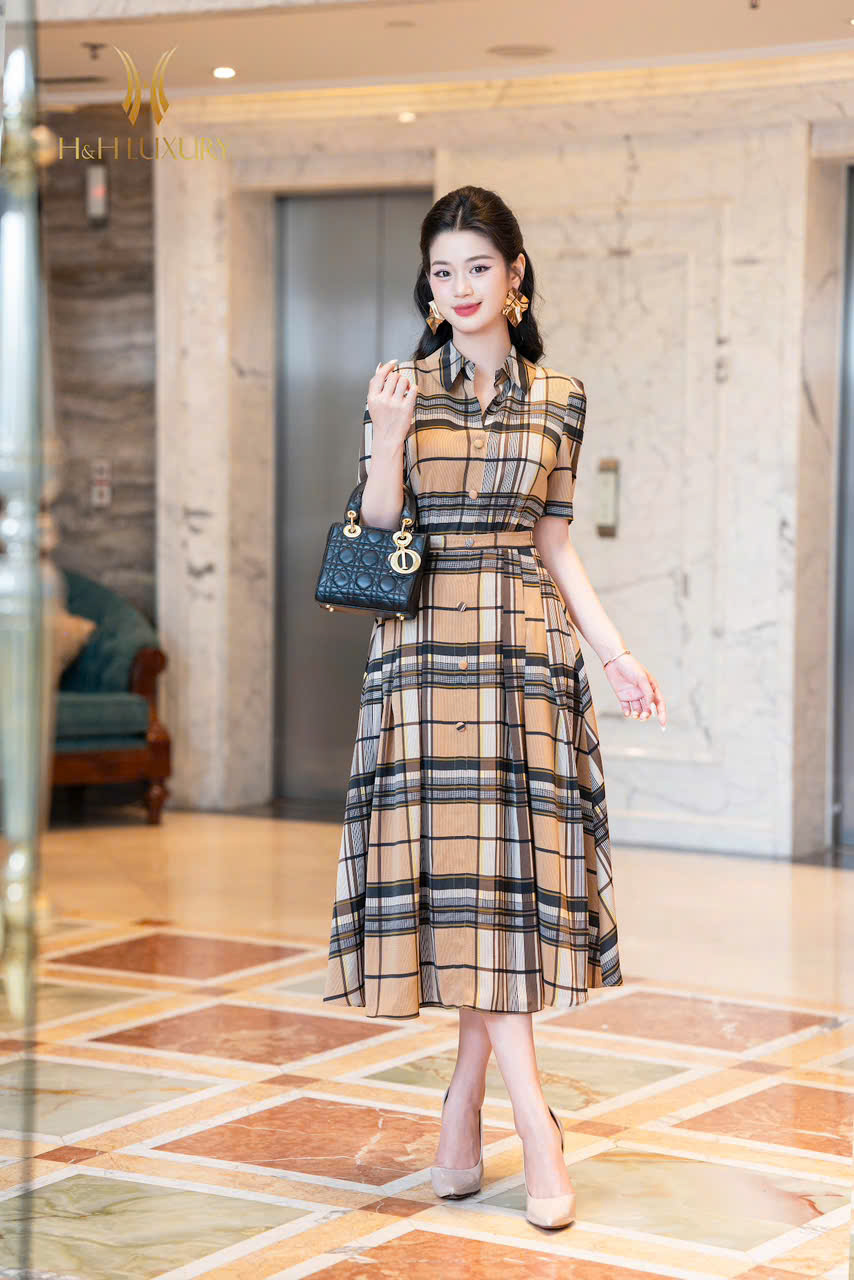 ĐẦM XÒE LỤA NHẬT CỔ ĐỨC ĐÍNH CÚC HỌA TIẾT KẺ