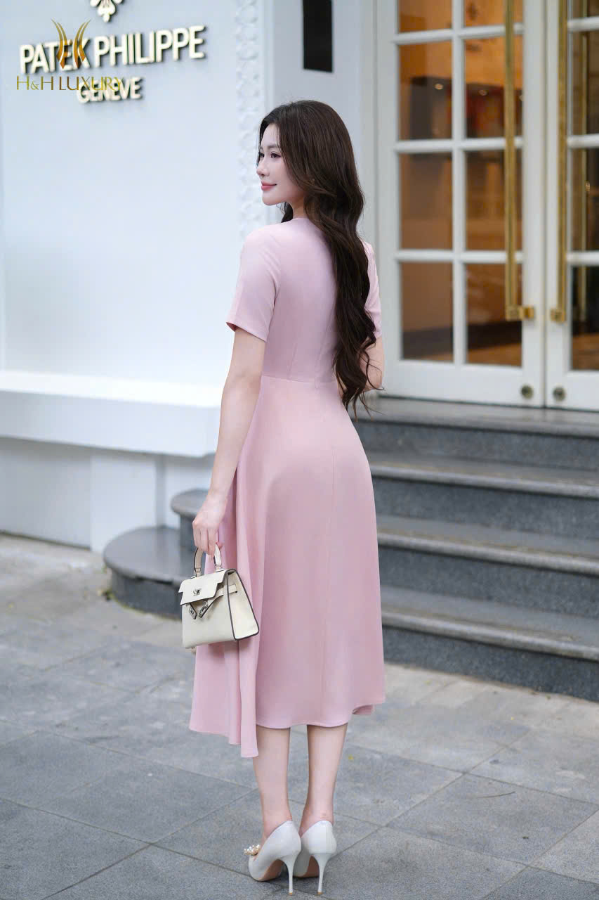 ĐẦM XÒE HỒNG PASTEL TÀ NGỰC ĐÍNH HOA TRÀ