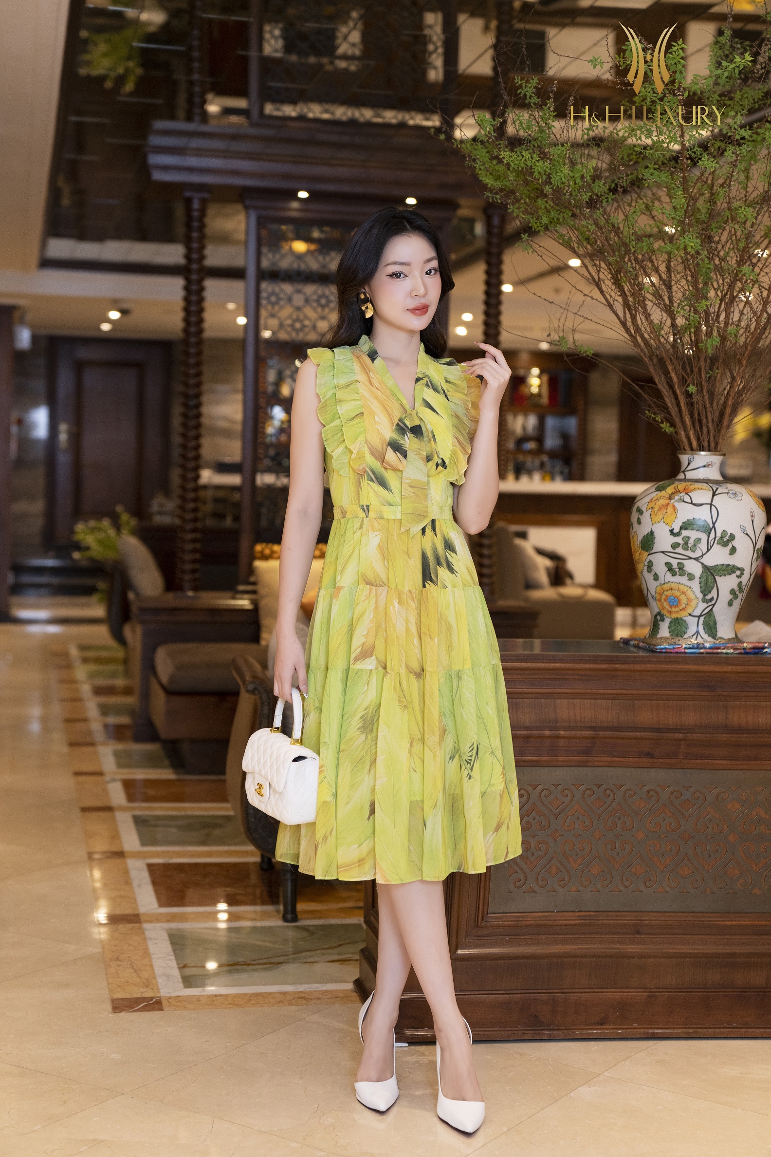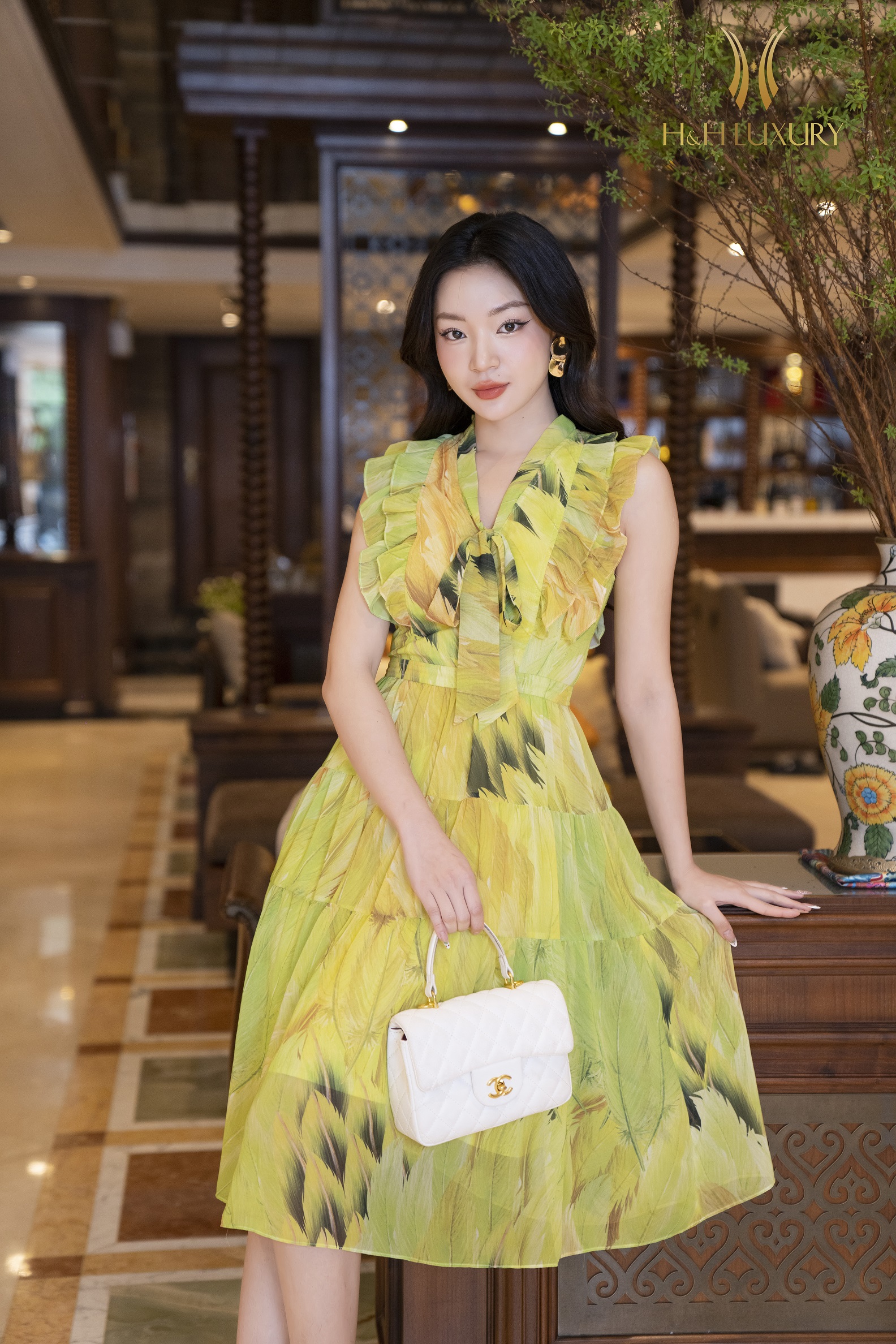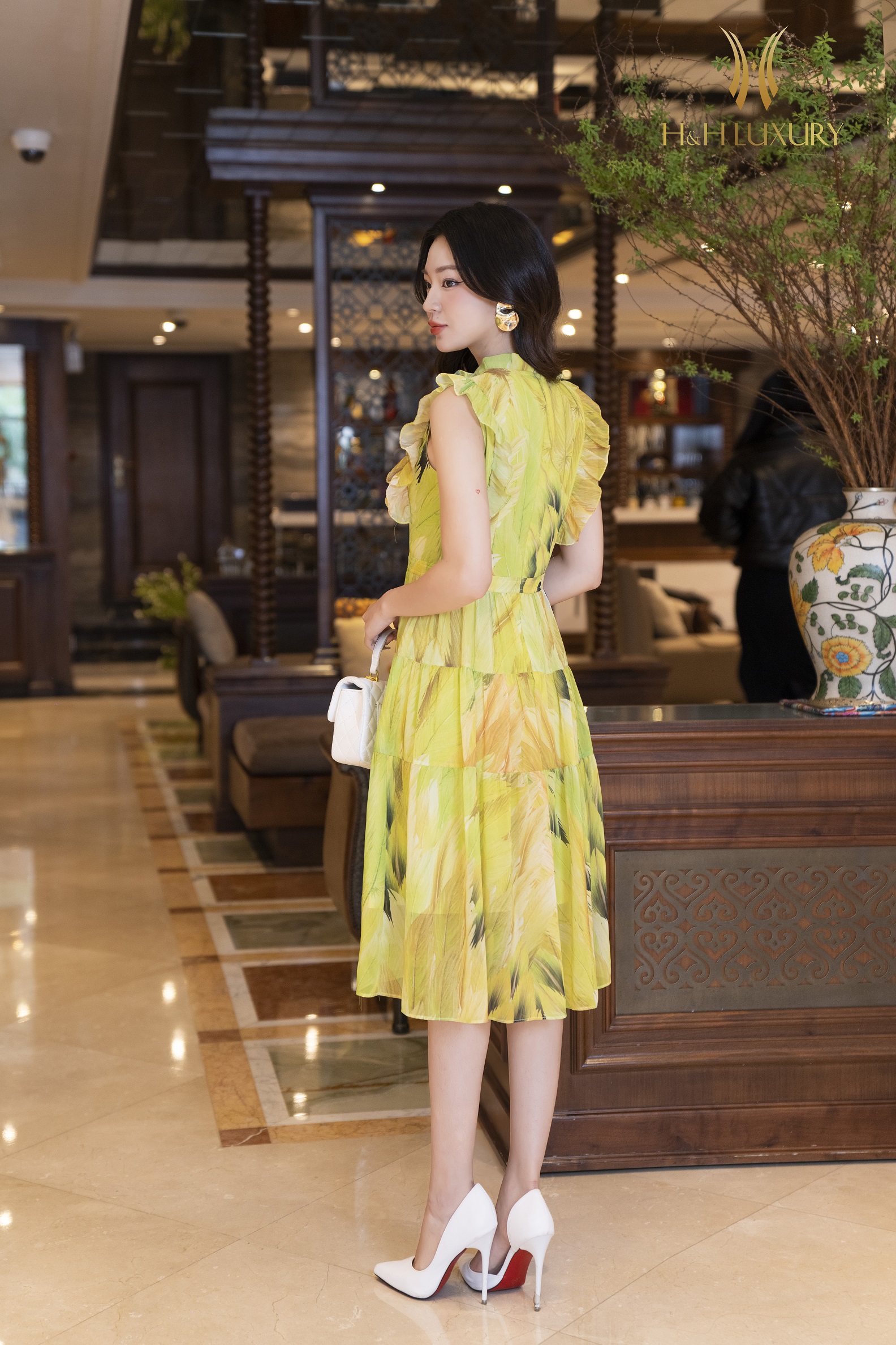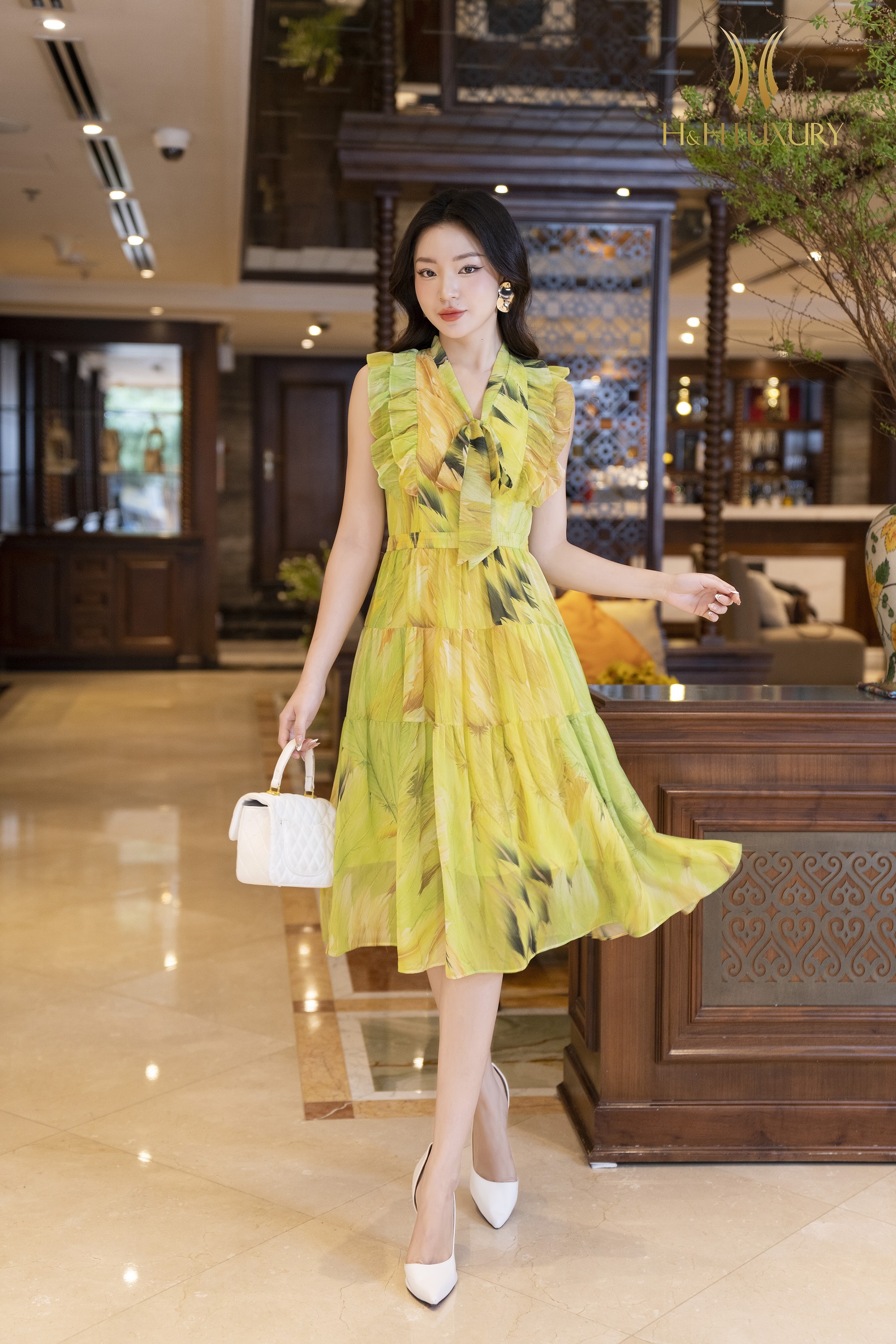 ĐẦM XÒE TƠ BÈO TAY NƠ CỔ HỌA TIẾT LÔNG VŨ