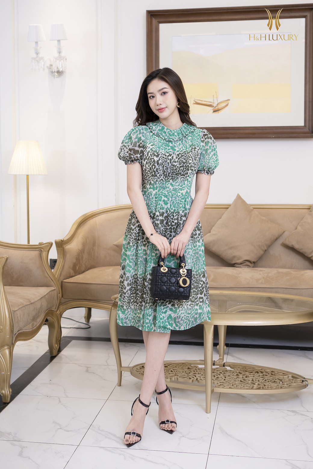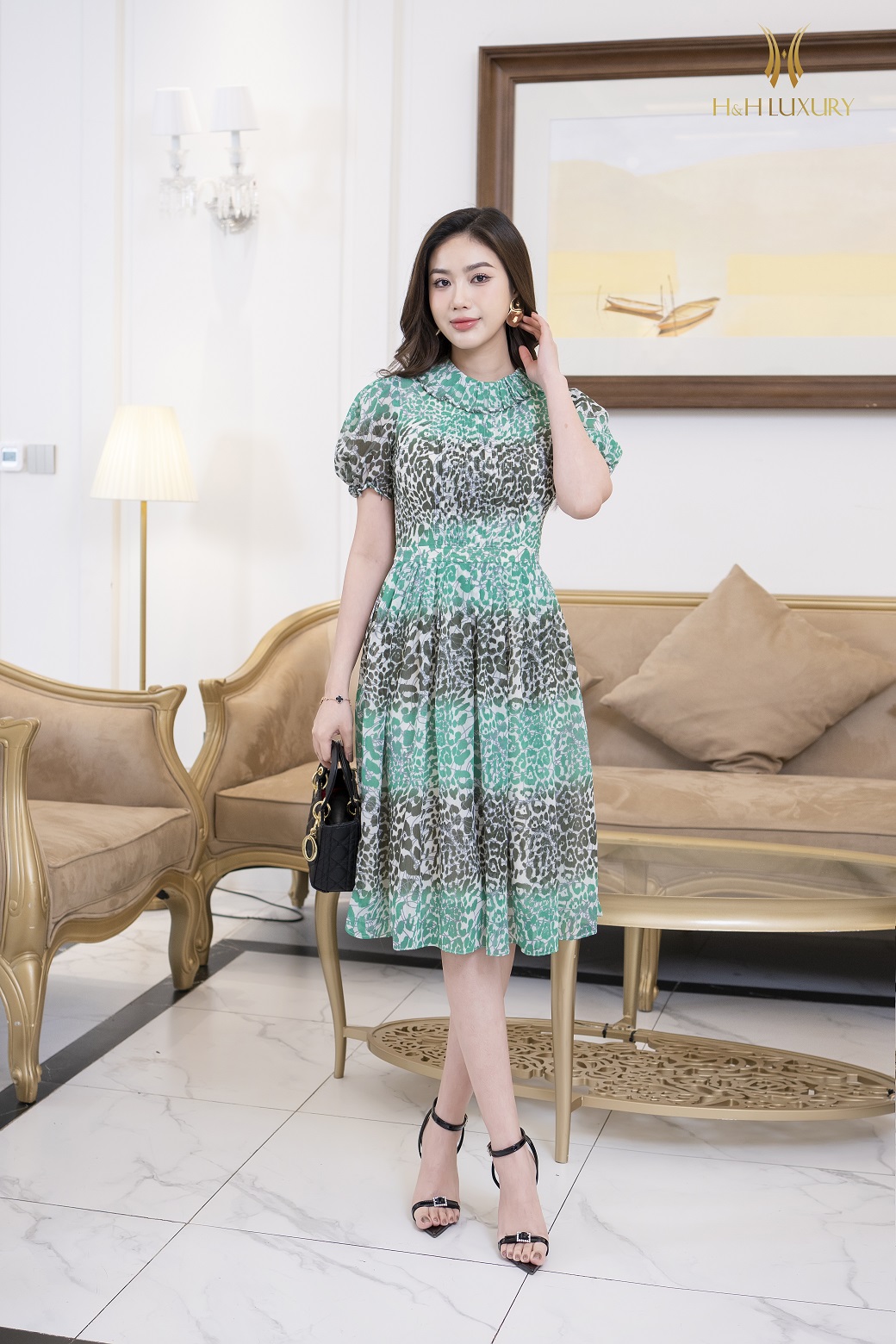 ĐẦM XÒE TƠ DA BÁO XẾP LI CỔ XANH NGỌC GHI