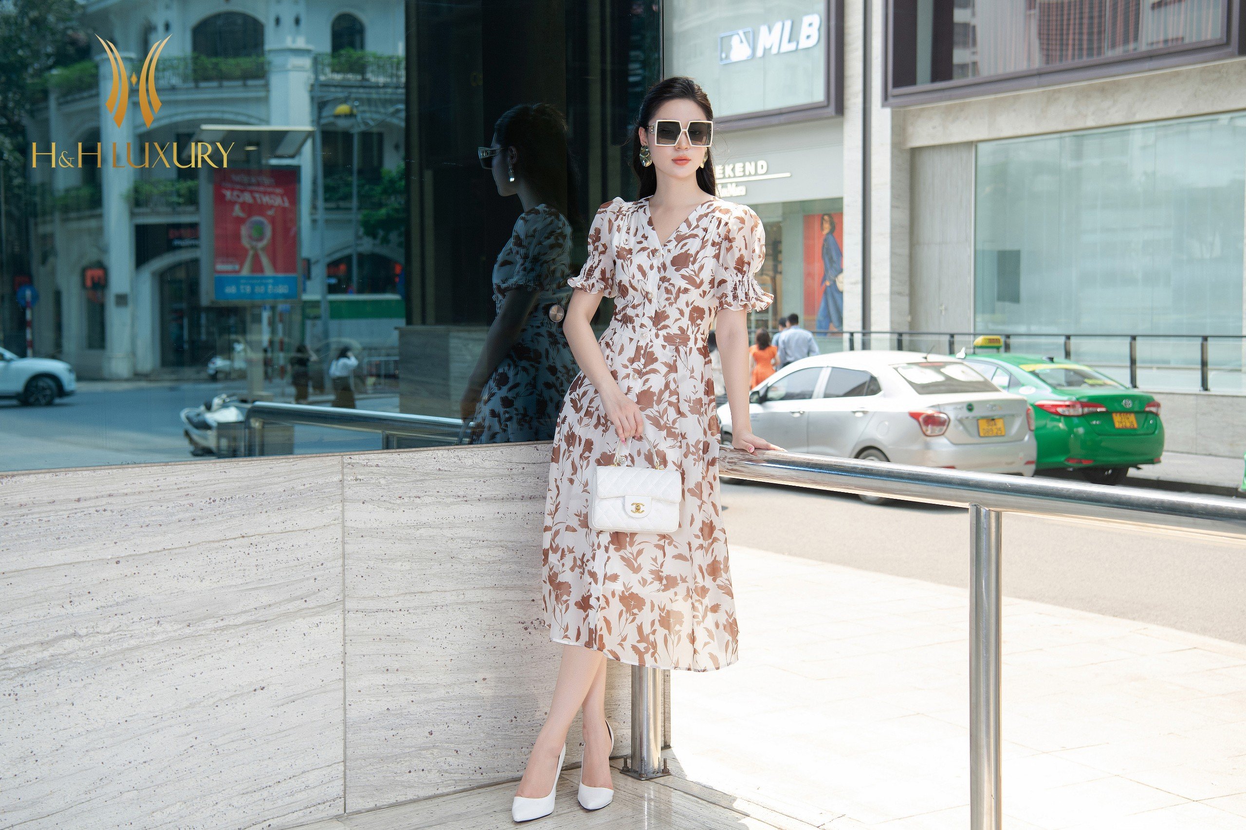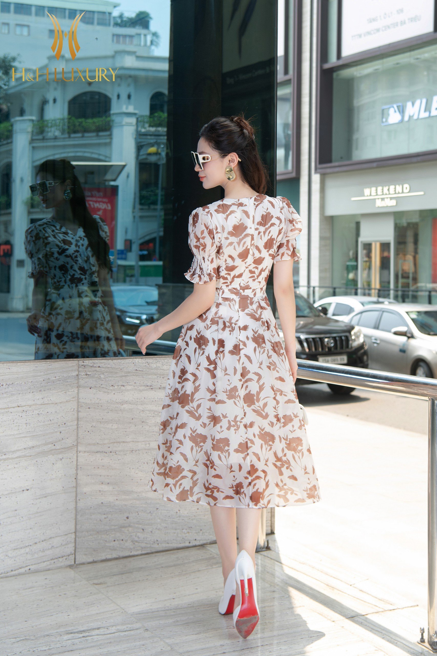 ĐẦM XÒE TƠ NÂU CỔ V ĐÍNH CÚC