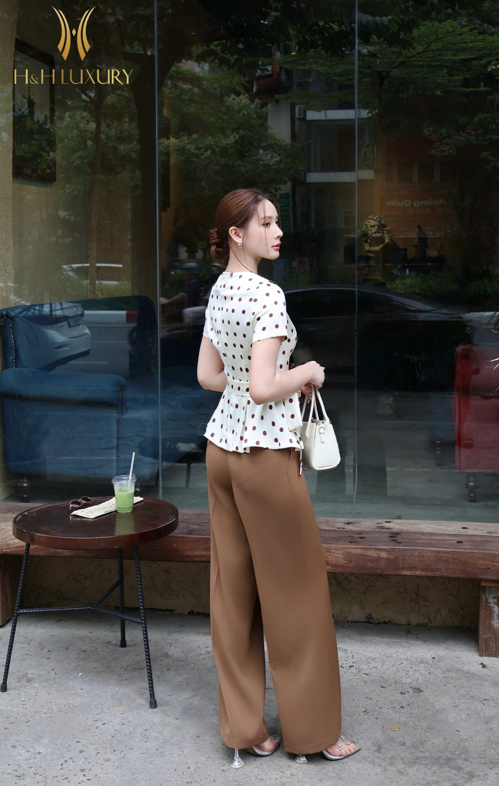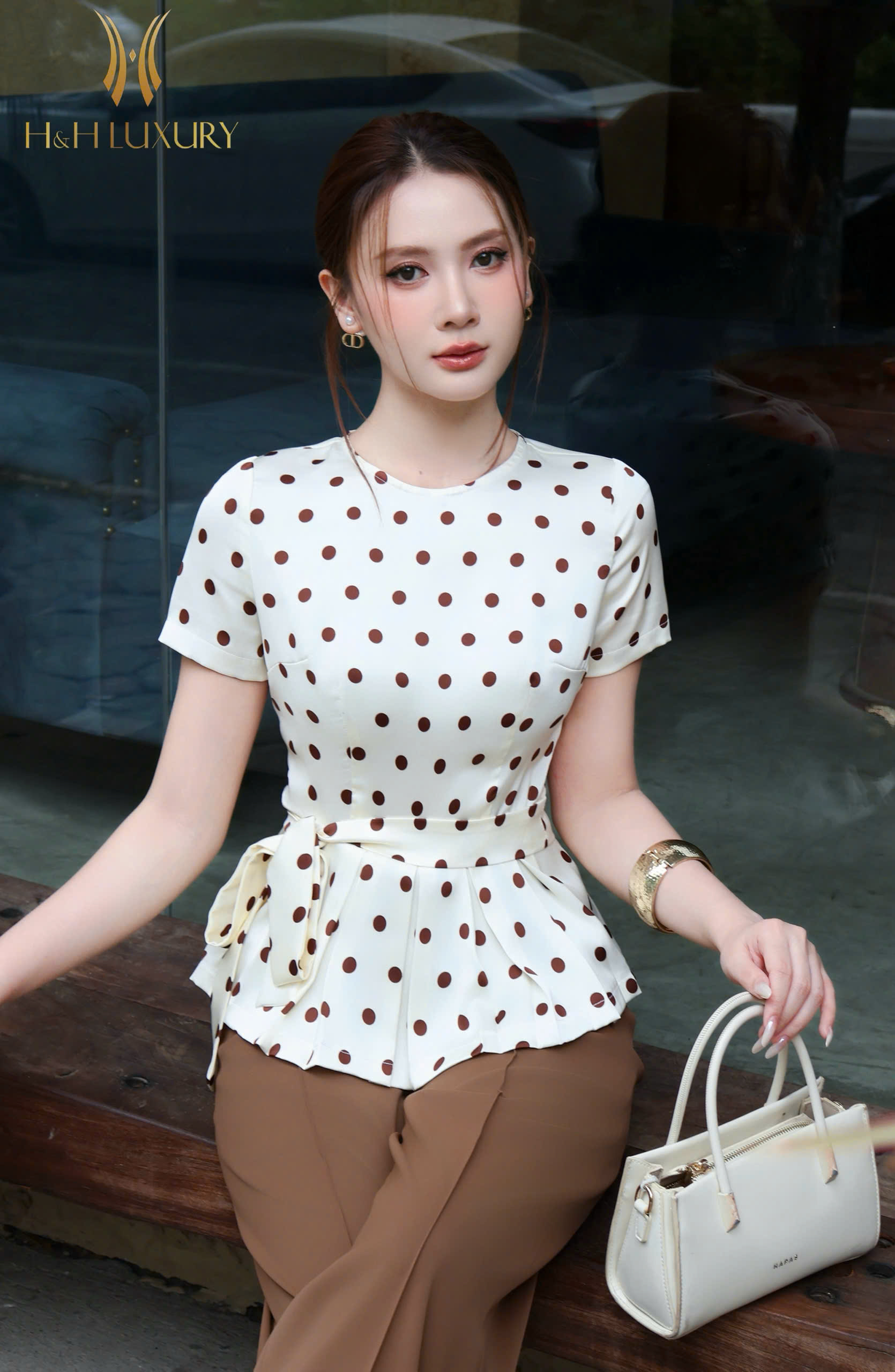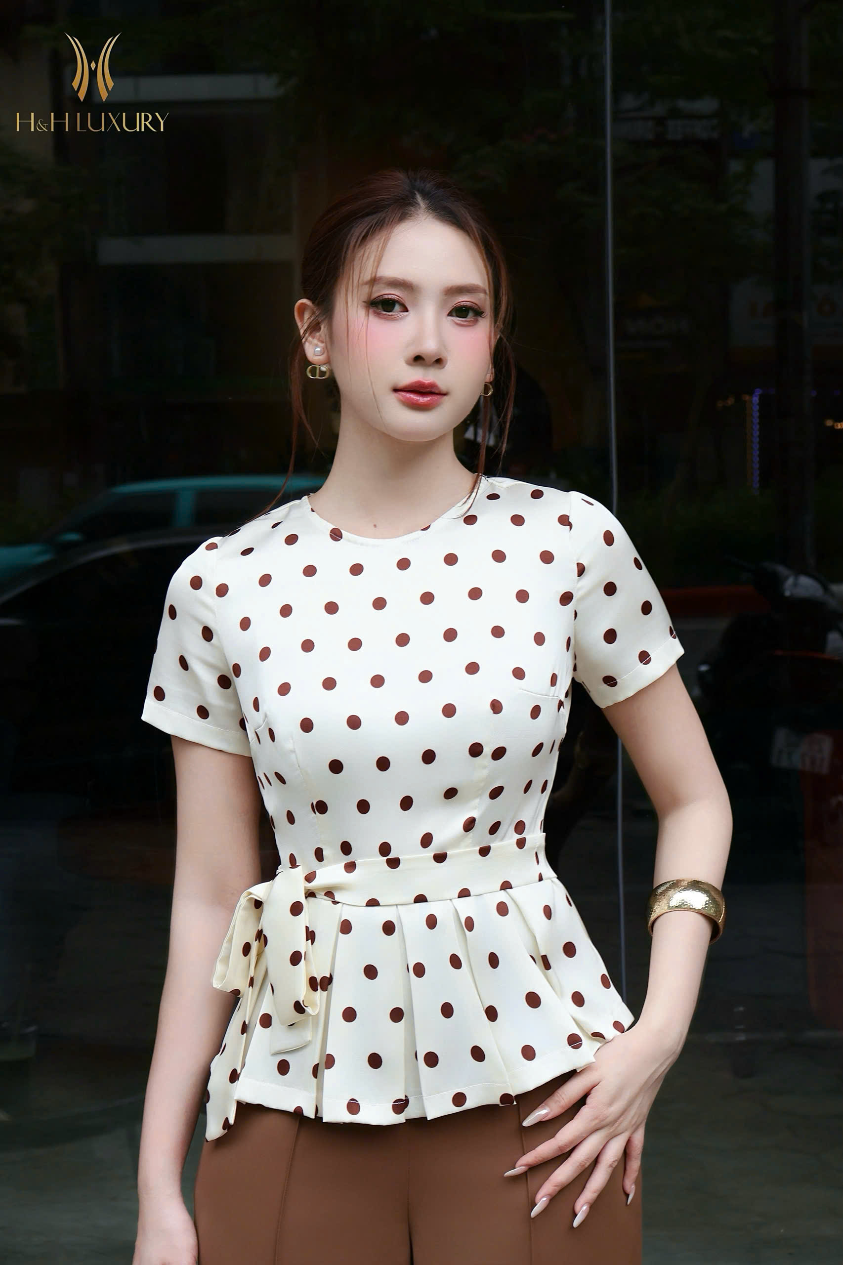 SƠ MI CHẤM BI NÂU KEM PEPLUM